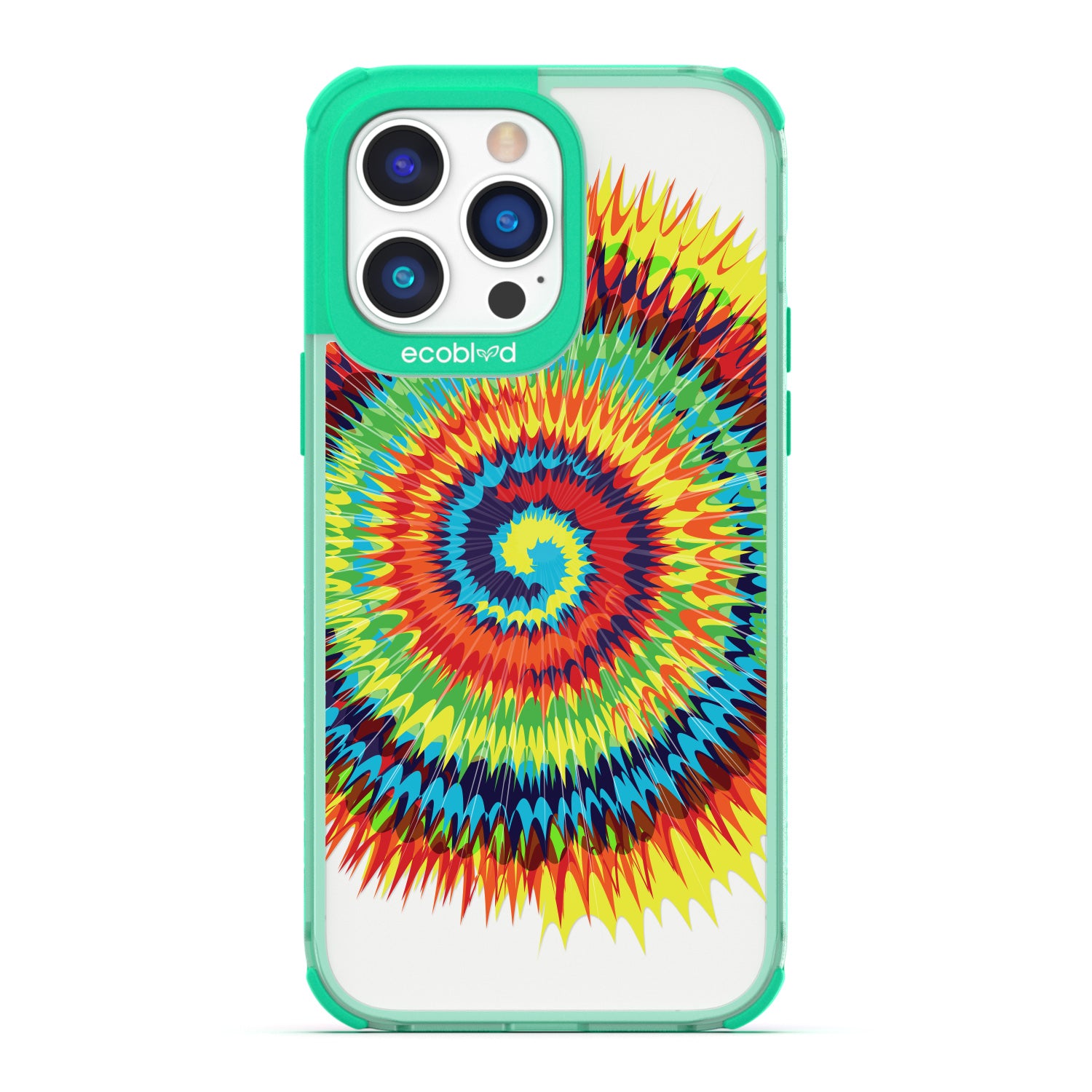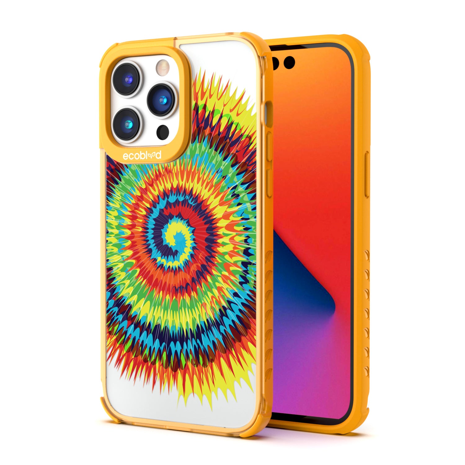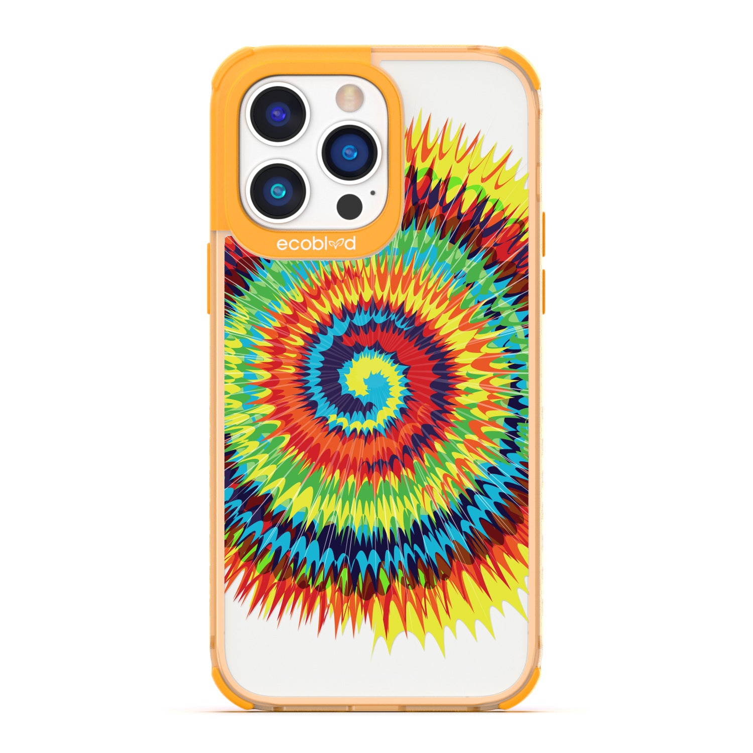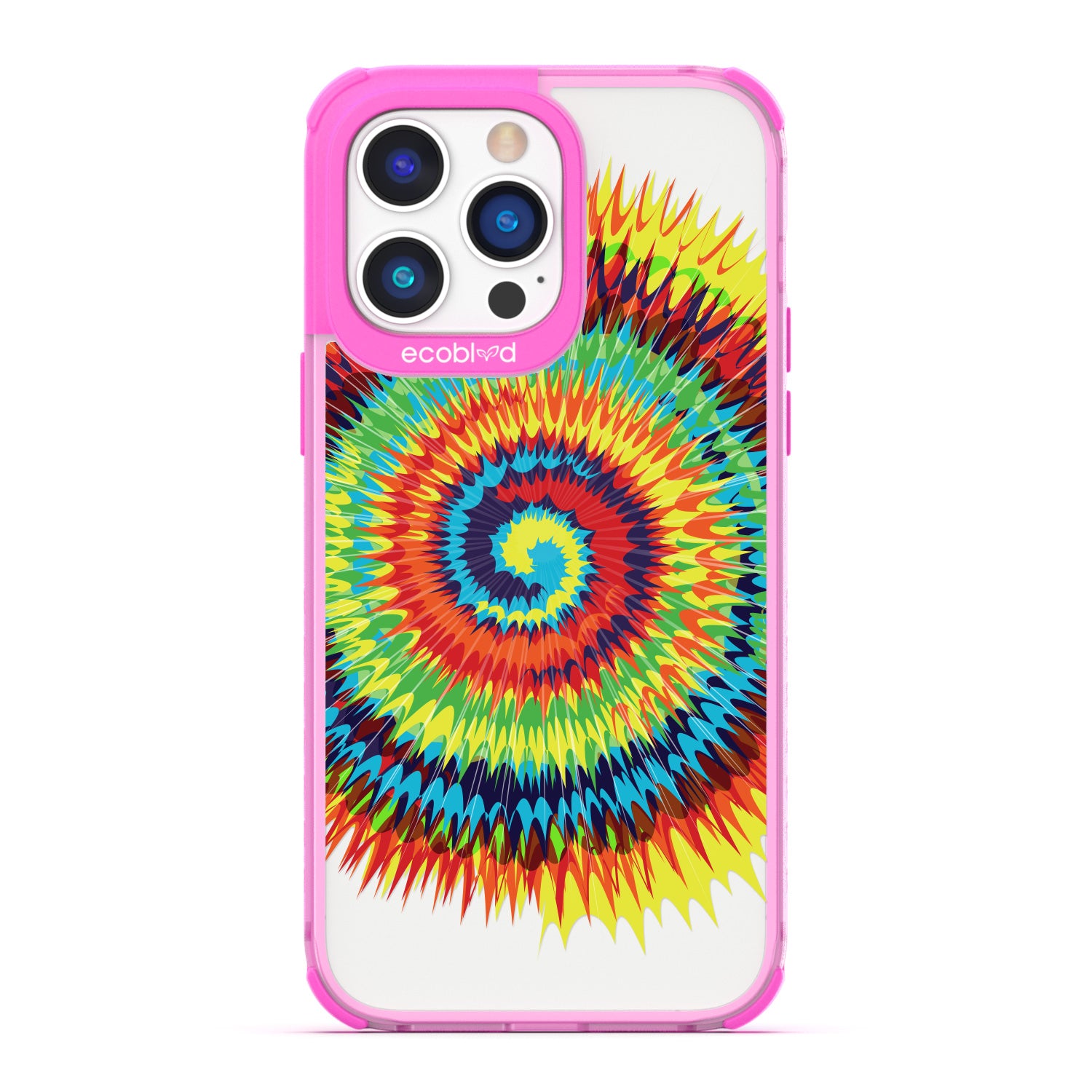 Bringing back the summer days of backyard BBQs, beach days, and fun in the sun, the Tie Dye design on our Laguna clear iPhone 14 Pro case features a retro rainbow swirl pattern giving your phone an eye-catching twist.