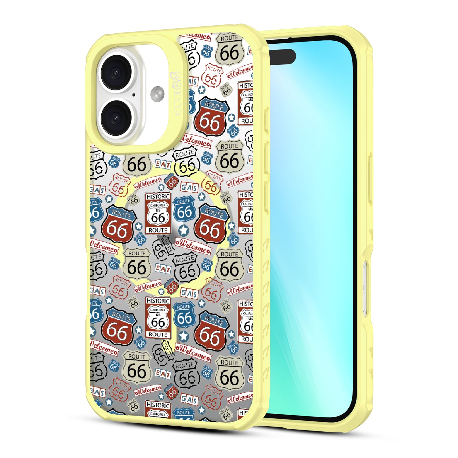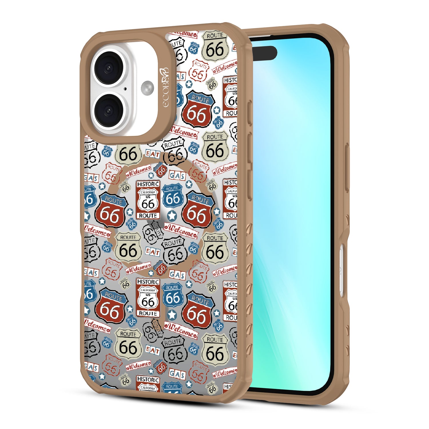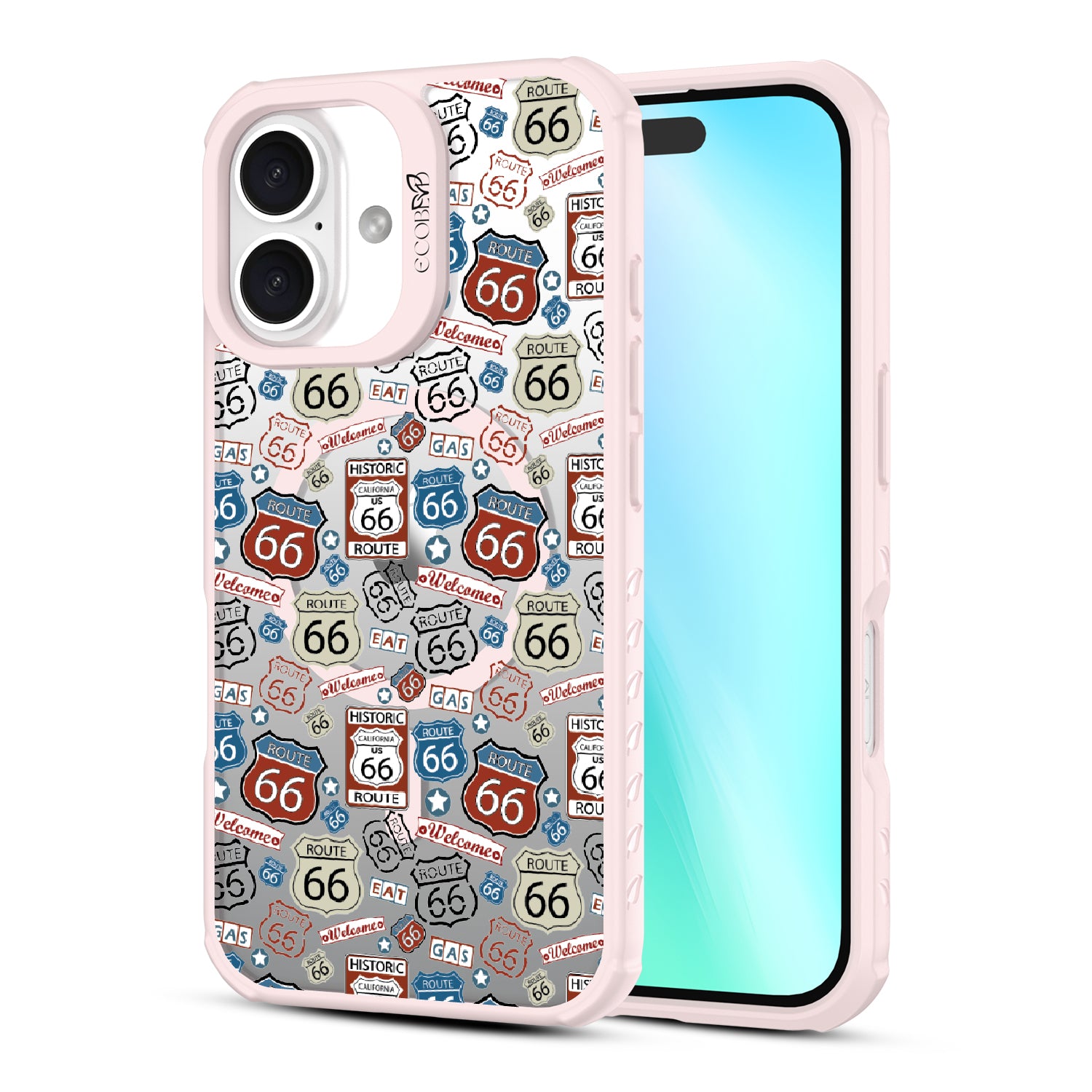 Travel the famed Route 66 with our Country Roads design on our Revive clear iPhone 16 phone case. Showcasing iconic Route 66 signs, rustic road markers, and scenic stops, this design celebrates the timeless appeal of America’s most famous highway.