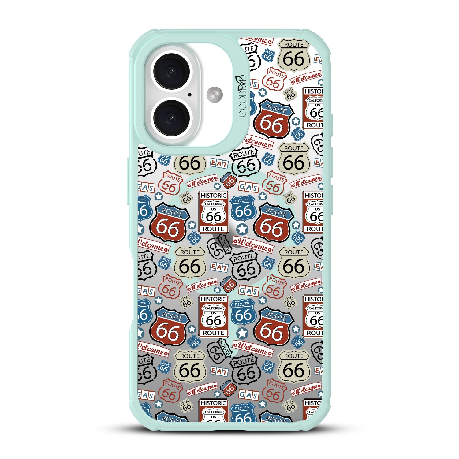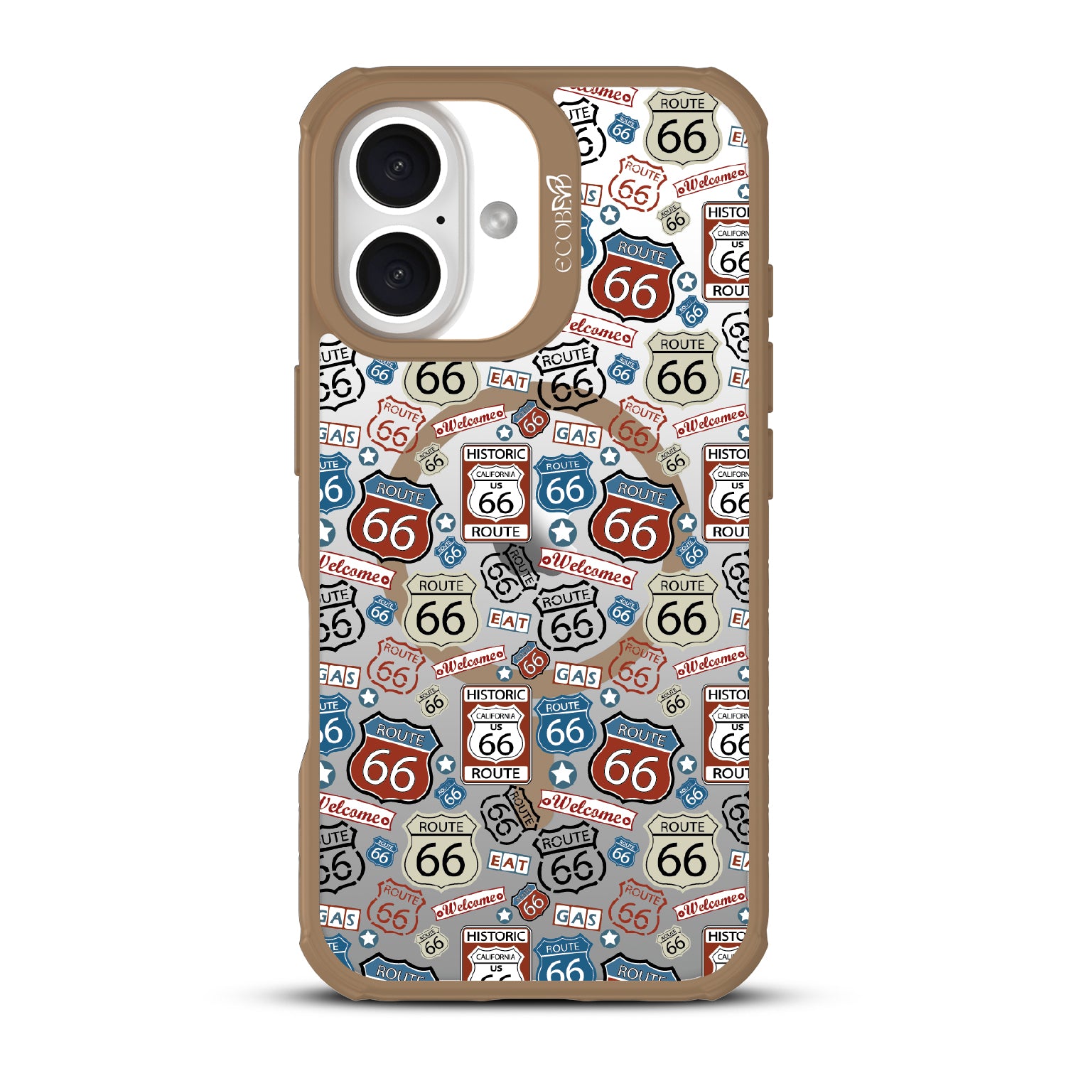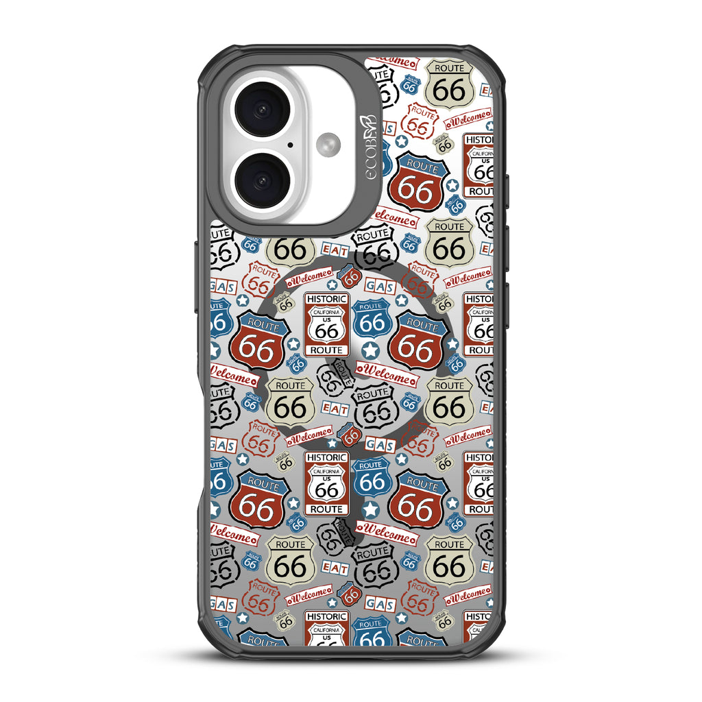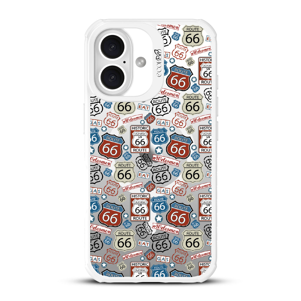 Travel the famed Route 66 with our Country Roads design on our Revive clear iPhone 16 phone case. Showcasing iconic Route 66 signs, rustic road markers, and scenic stops, this design celebrates the timeless appeal of America’s most famous highway.