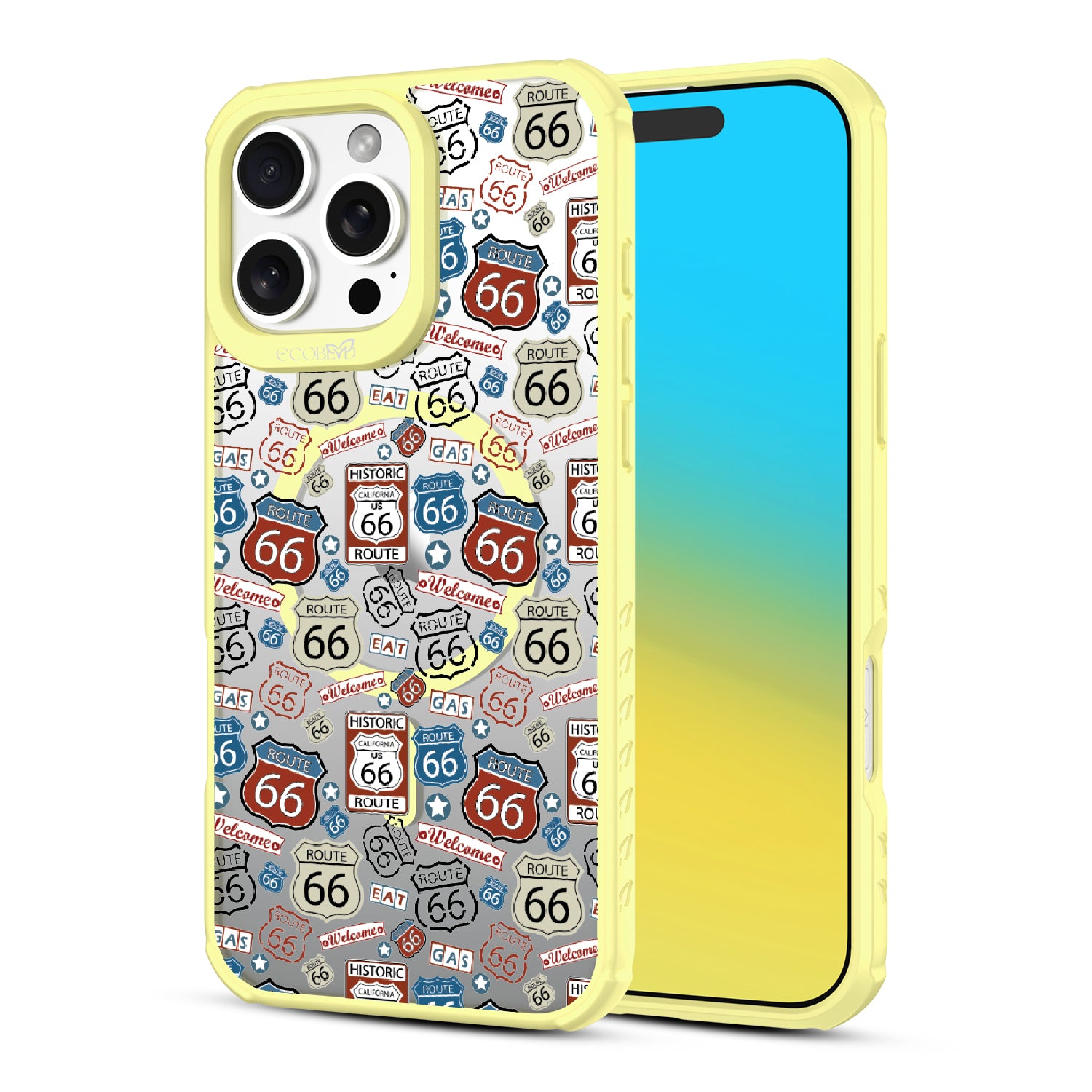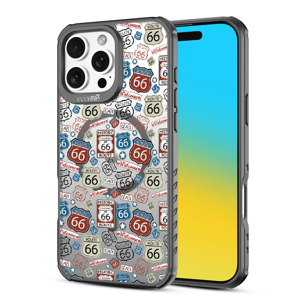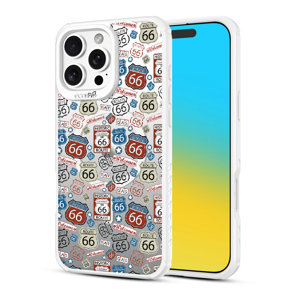 Travel the famed Route 66 with our Country Roads design on our Revive clear iPhone 16 Pro Max phone case. Showcasing iconic Route 66 signs, rustic road markers, and scenic stops, this design celebrates the timeless appeal of America’s most famous highway.