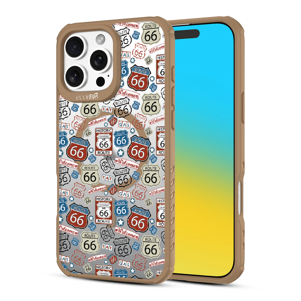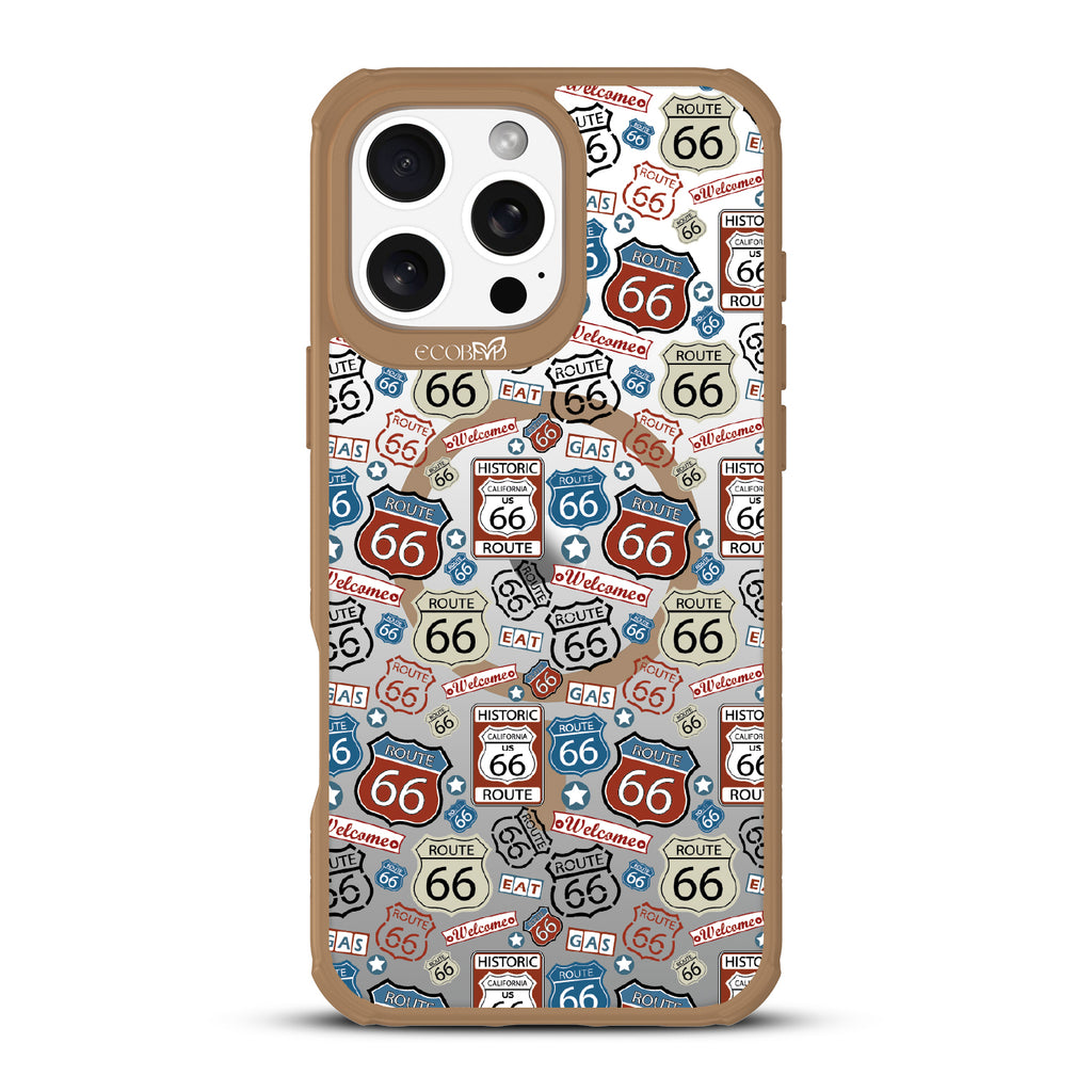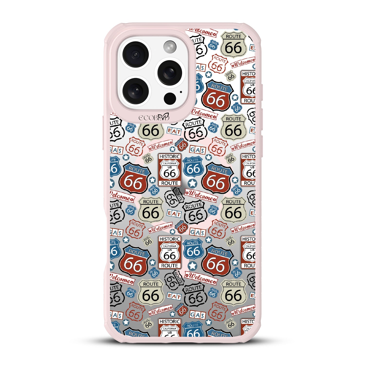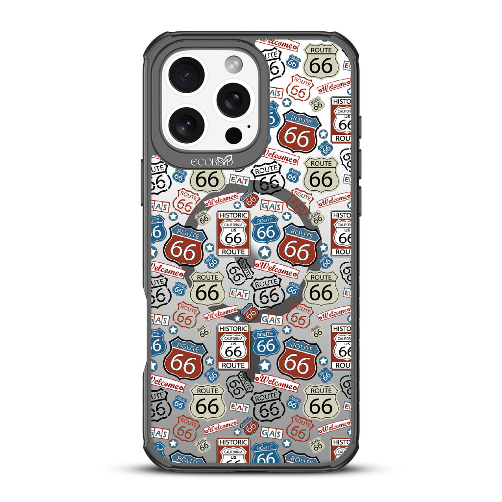 Travel the famed Route 66 with our Country Roads design on our Revive clear iPhone 16 Pro Max phone case. Showcasing iconic Route 66 signs, rustic road markers, and scenic stops, this design celebrates the timeless appeal of America’s most famous highway.