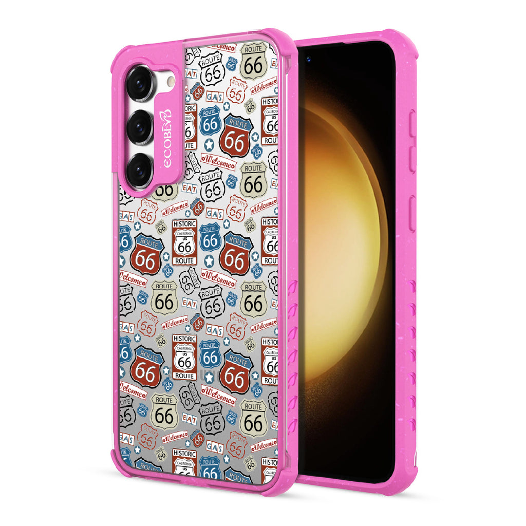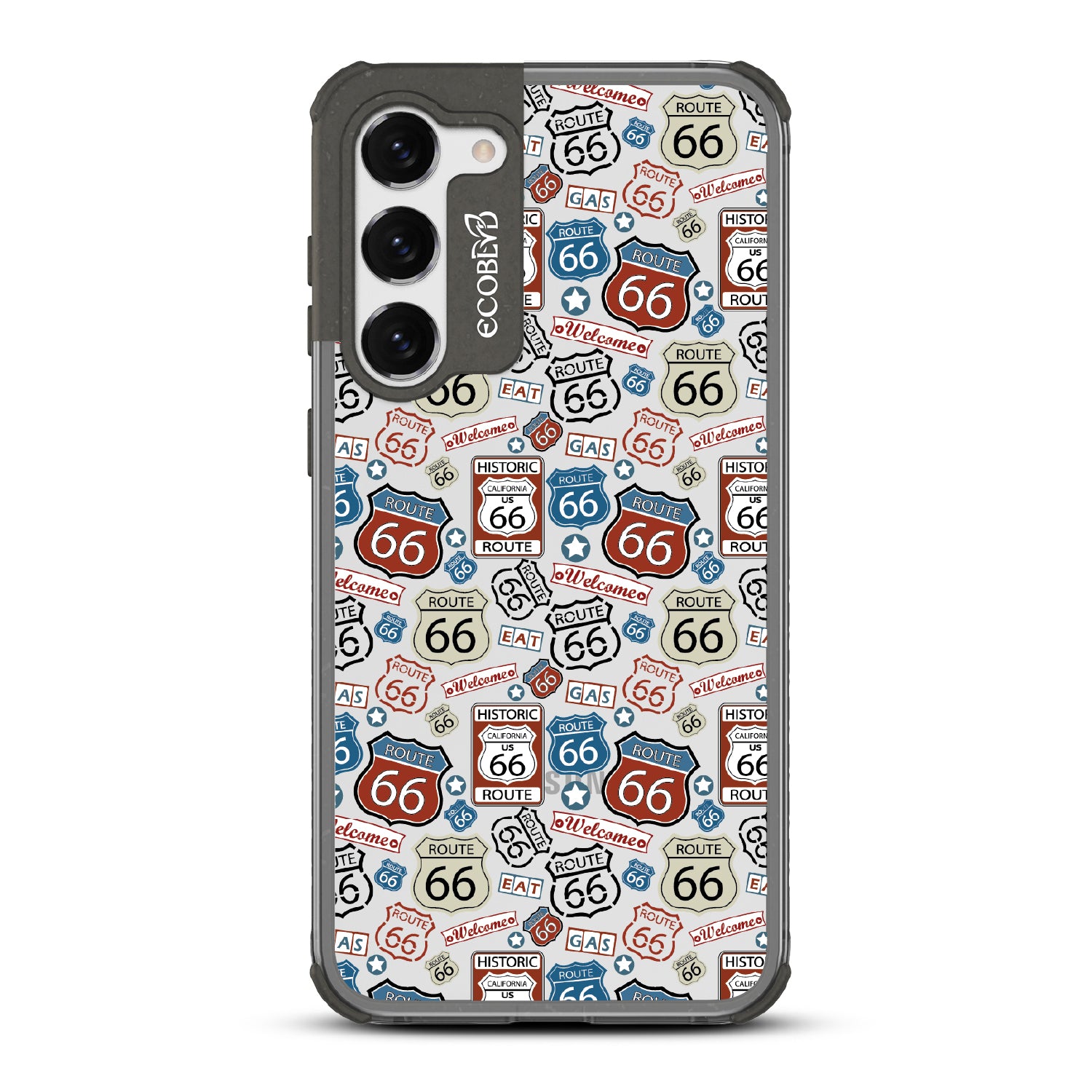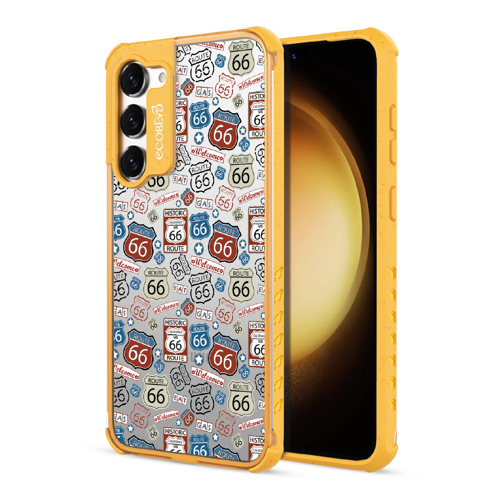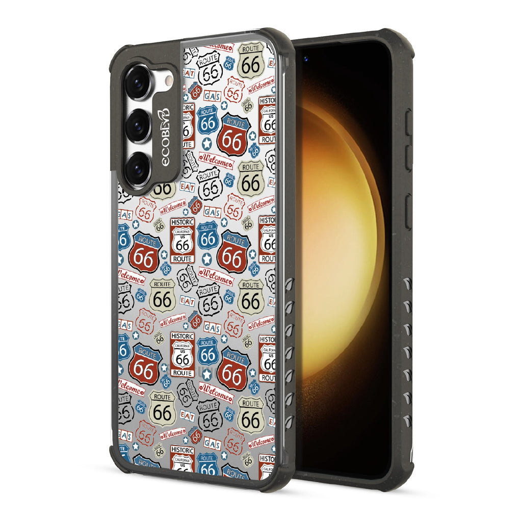 Travel the famed Route 66 with our Country Roads design on our Laguna clear Samsung Galaxy S23 Plus phone case. Showcasing iconic Route 66 signs, rustic road markers, and scenic stops, this design celebrates the timeless appeal of America’s most famous highway.