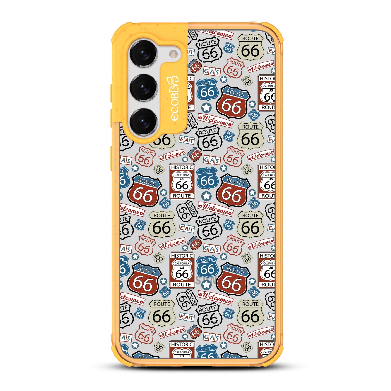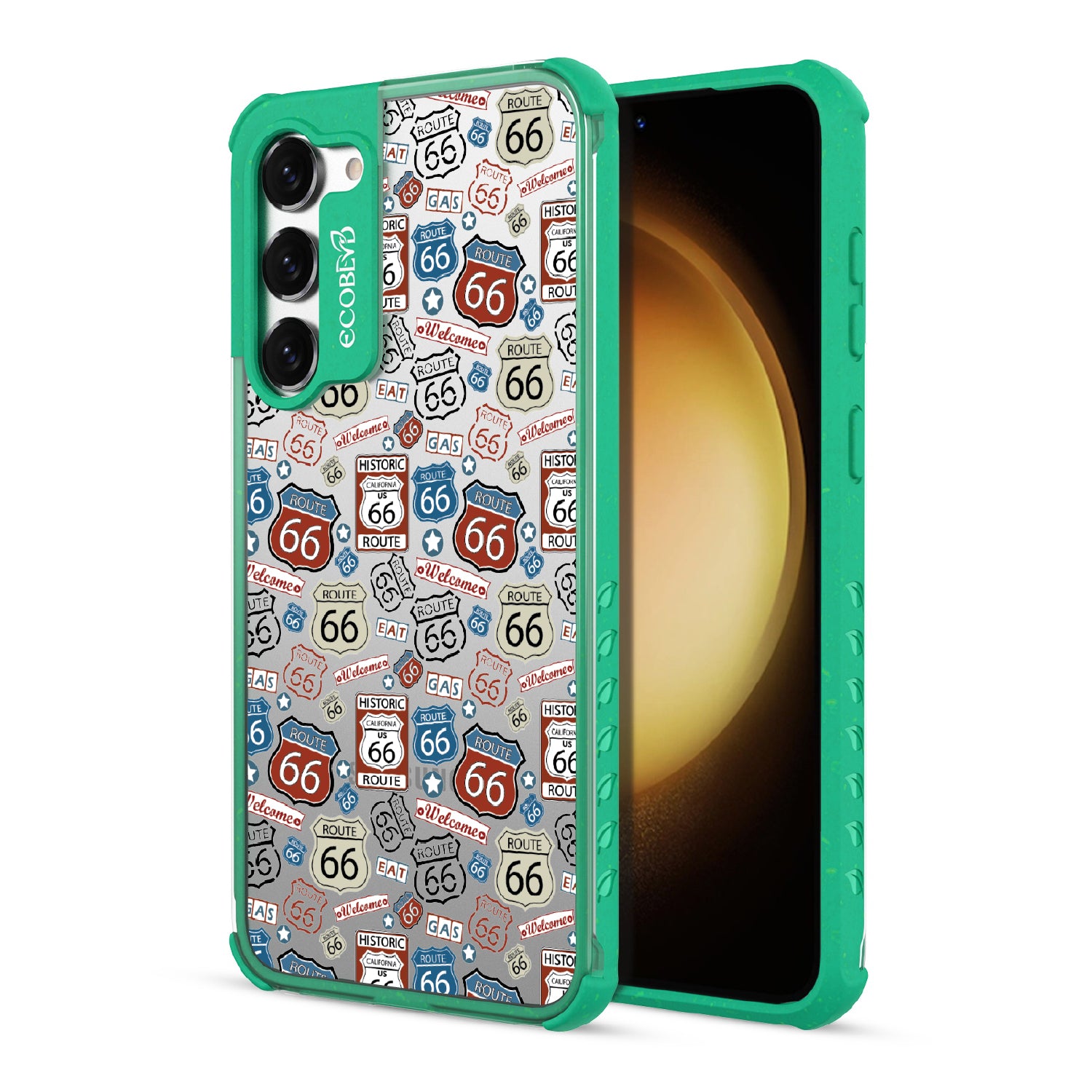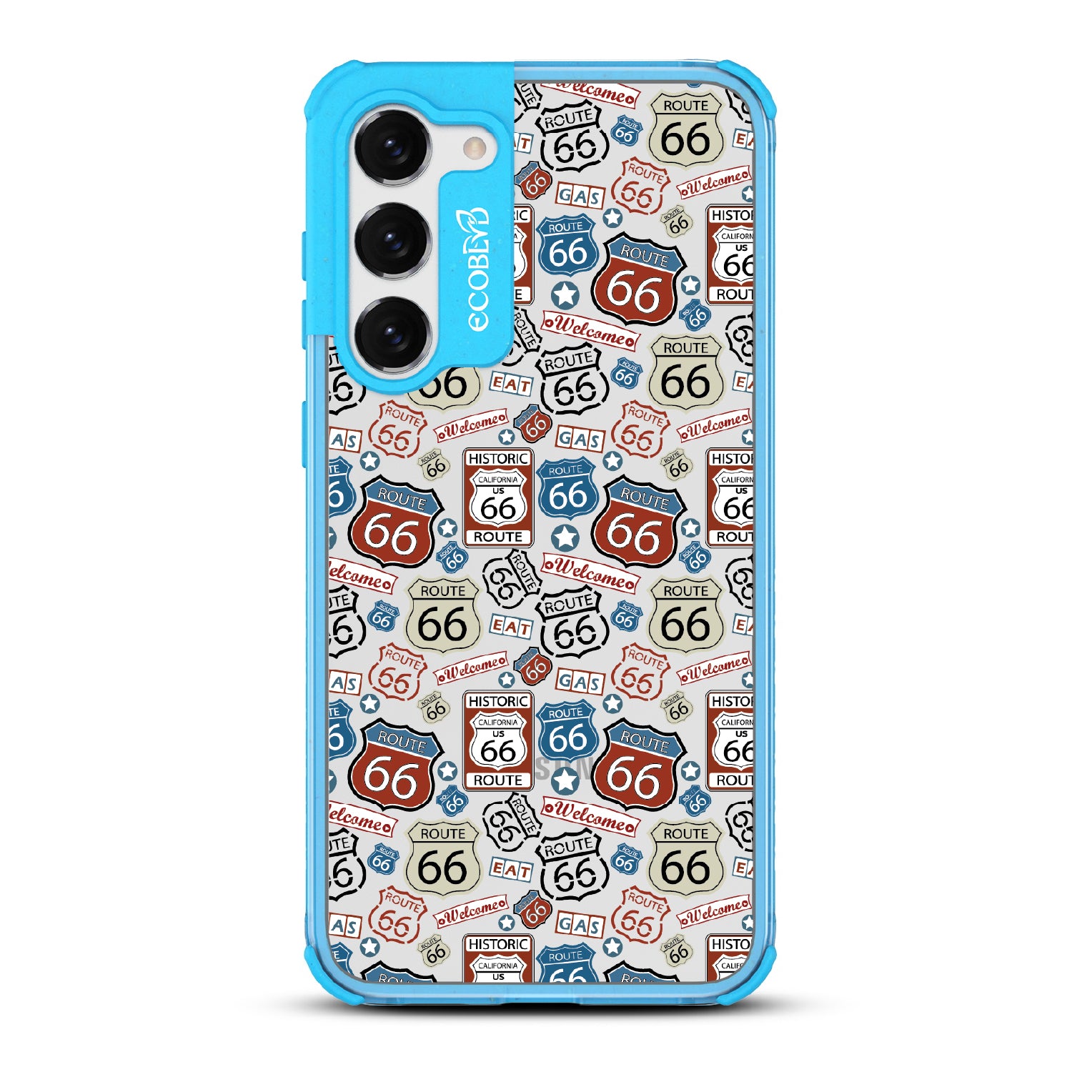 Travel the famed Route 66 with our Country Roads design on our Laguna clear Samsung Galaxy S23 Plus phone case. Showcasing iconic Route 66 signs, rustic road markers, and scenic stops, this design celebrates the timeless appeal of America’s most famous highway.