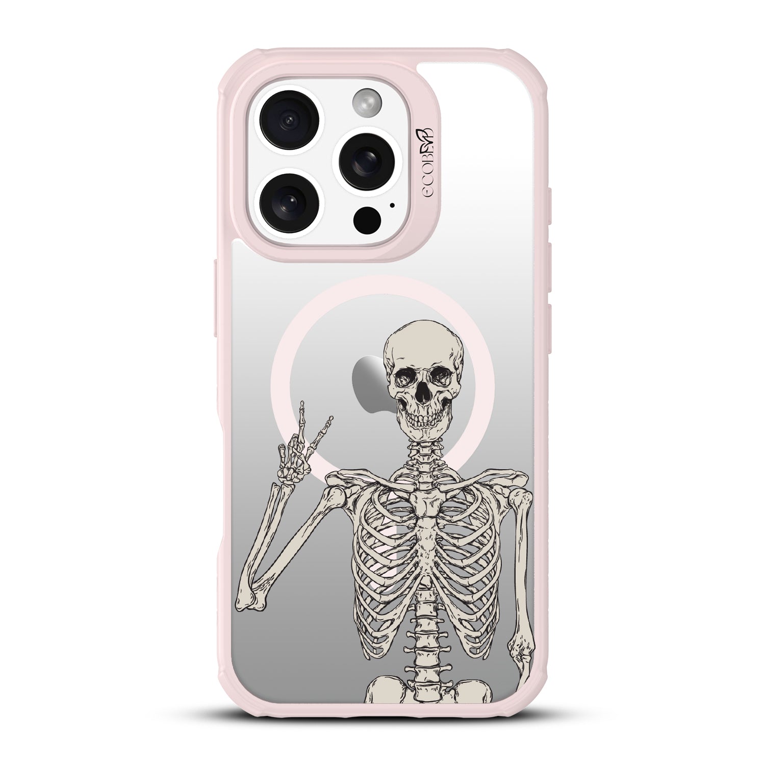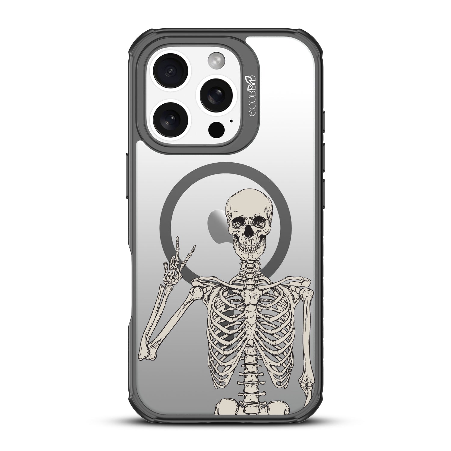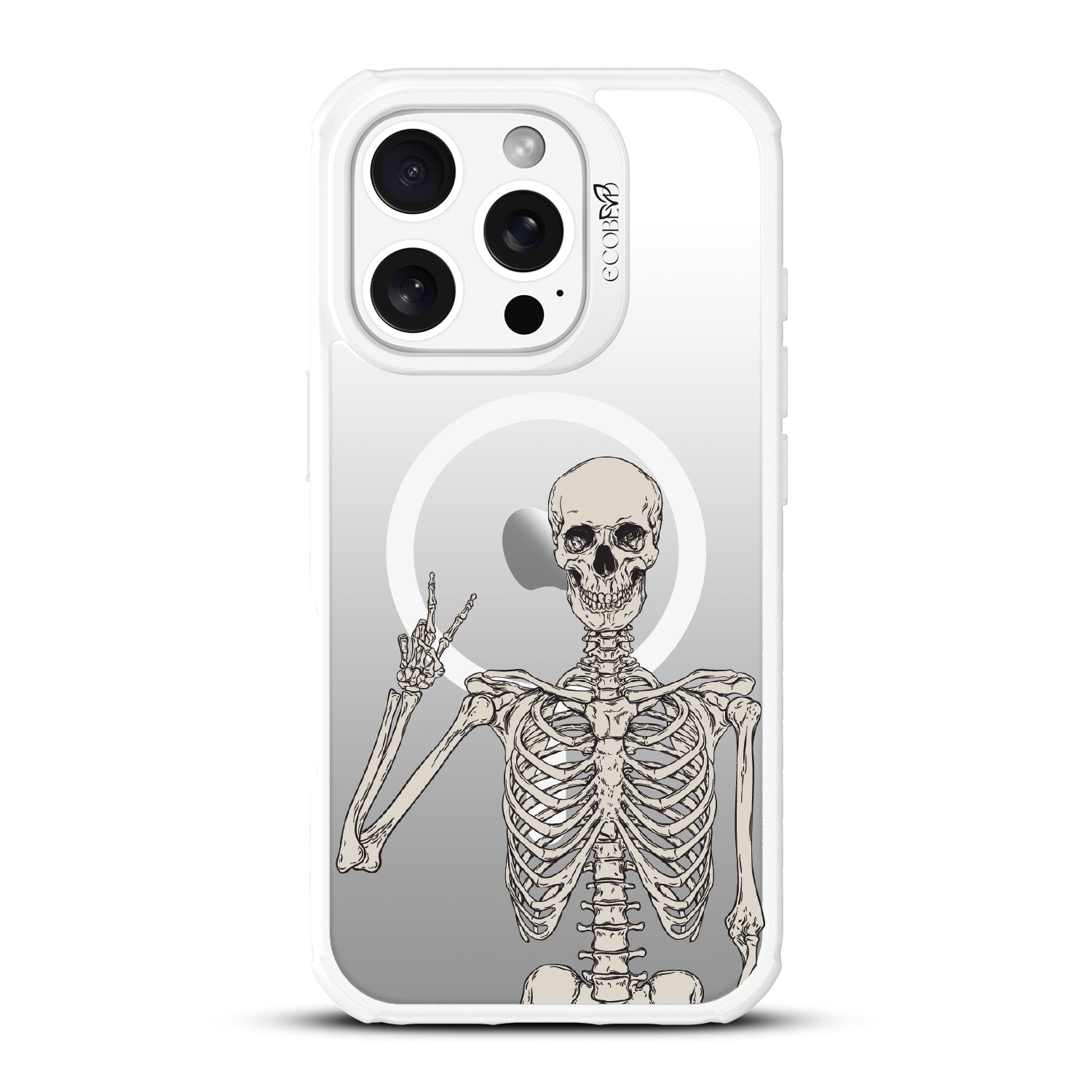 No doubt, the Creepin' It Real design on the Revive clear iPhone 16 Pro phone case is sure to make your phone look simply bone-chilling, as it features an eye-catching skeleton giving the peace sign.
