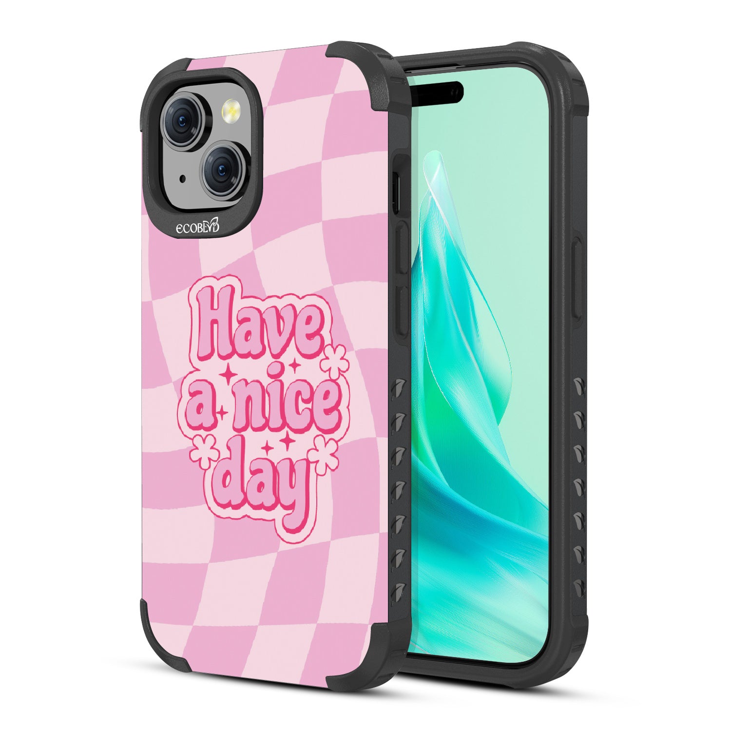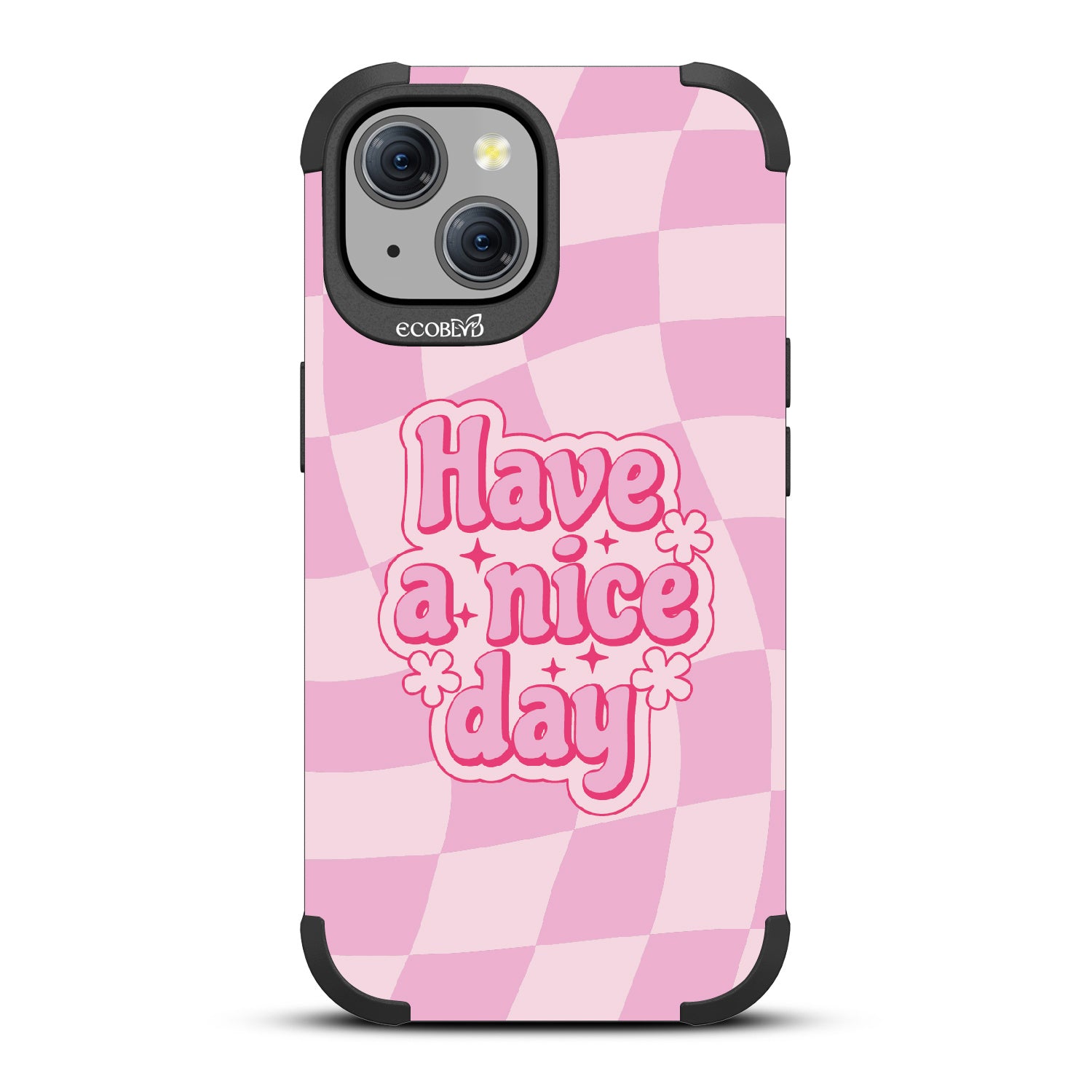 Set the stage for a brighter day with the Have A Nice Day design on our Mojave rugged and compostable iPhone 15 MagSafe case, featuring an eye-catching wavy checker print pattern. This daily reminder gives an uplifting atmosphere your phone needs, making every day a nice day filled with positivity.