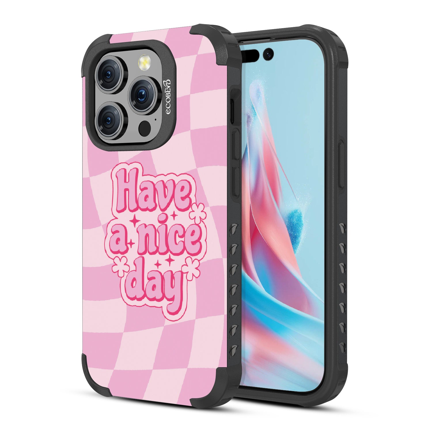 Set the stage for a brighter day with the Have A Nice Day design on our Mojave rugged and compostable iPhone 15 Pro MagSafe case, featuring an eye-catching wavy checker print pattern. This daily reminder gives an uplifting atmosphere your phone needs, making every day a nice day filled with positivity.