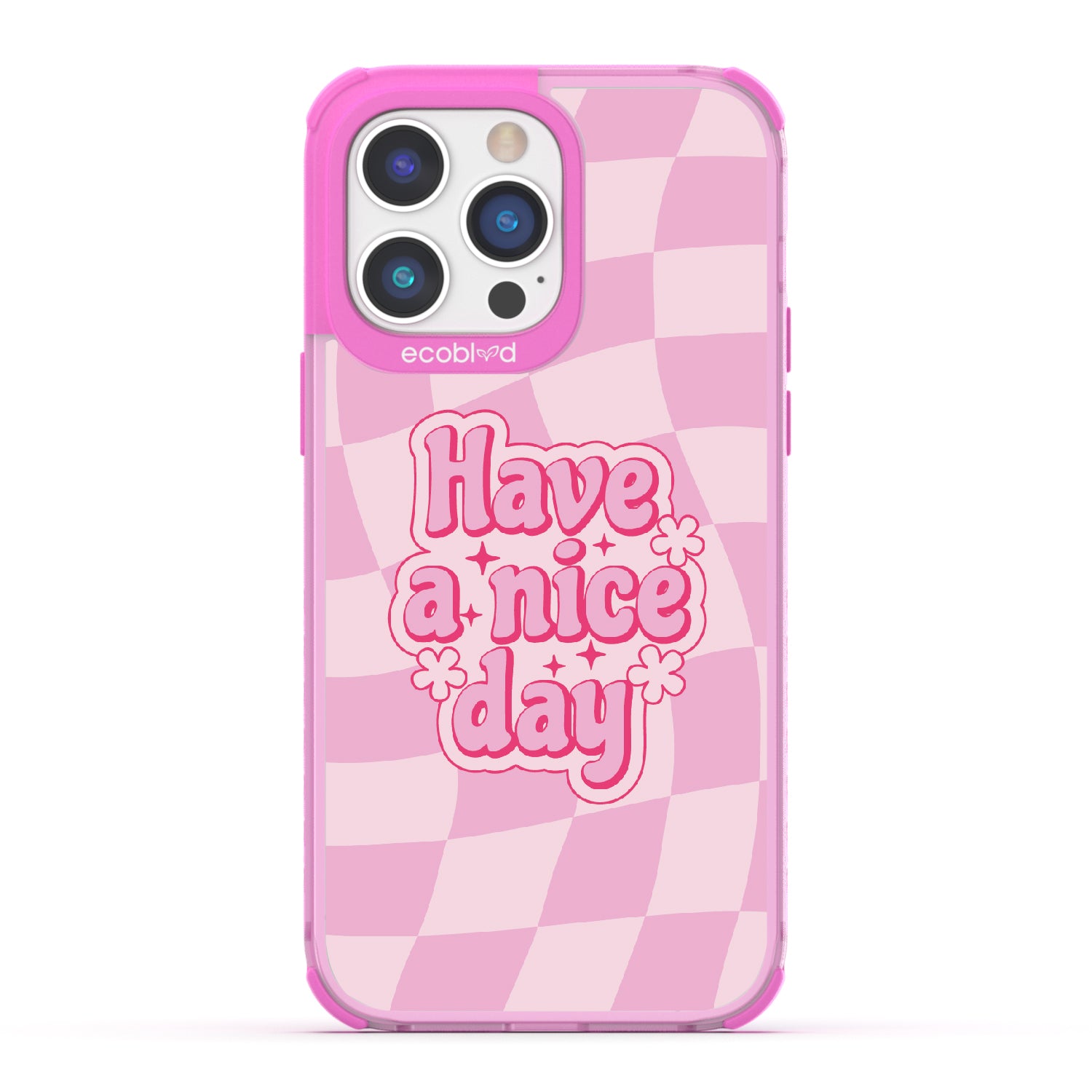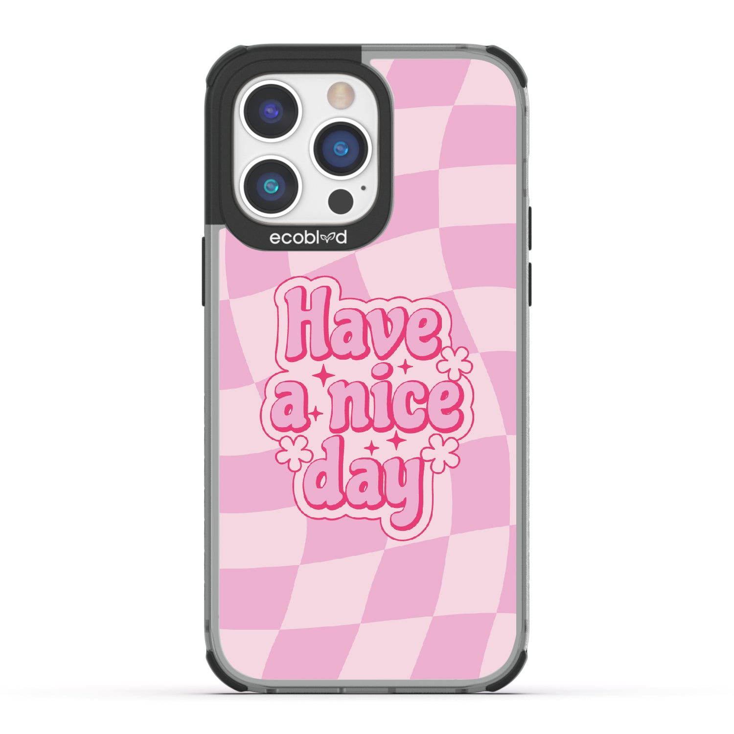 Set the stage for a brighter day with the Have A Nice Day design on our Laguna clear iPhone 14 Pro phone case, featuring an eye-catching wavy checker print pattern. This daily reminder gives an uplifting atmosphere your phone needs, making every day a nice day filled with positivity.