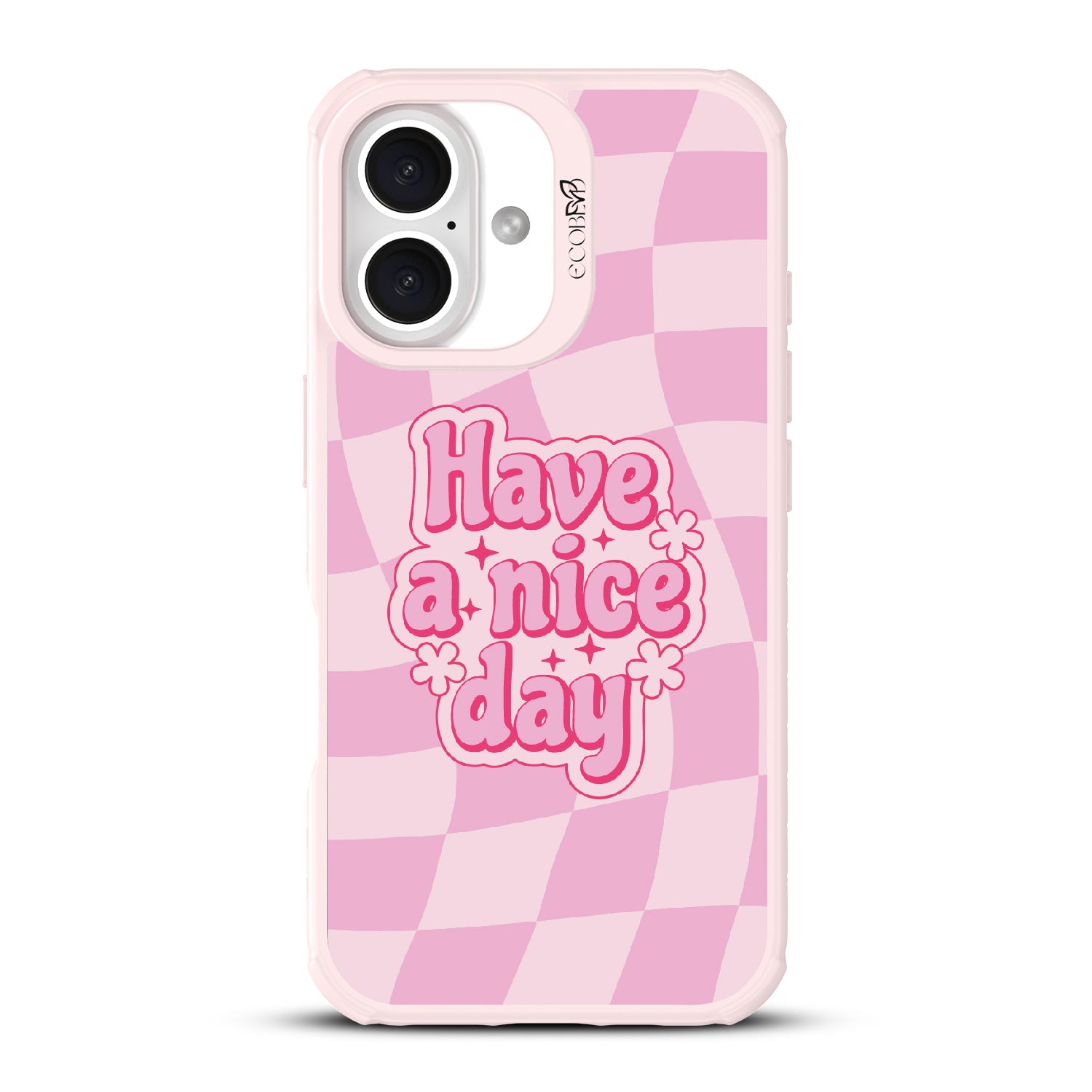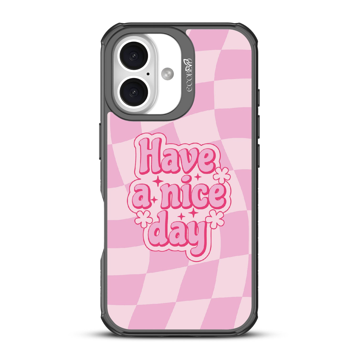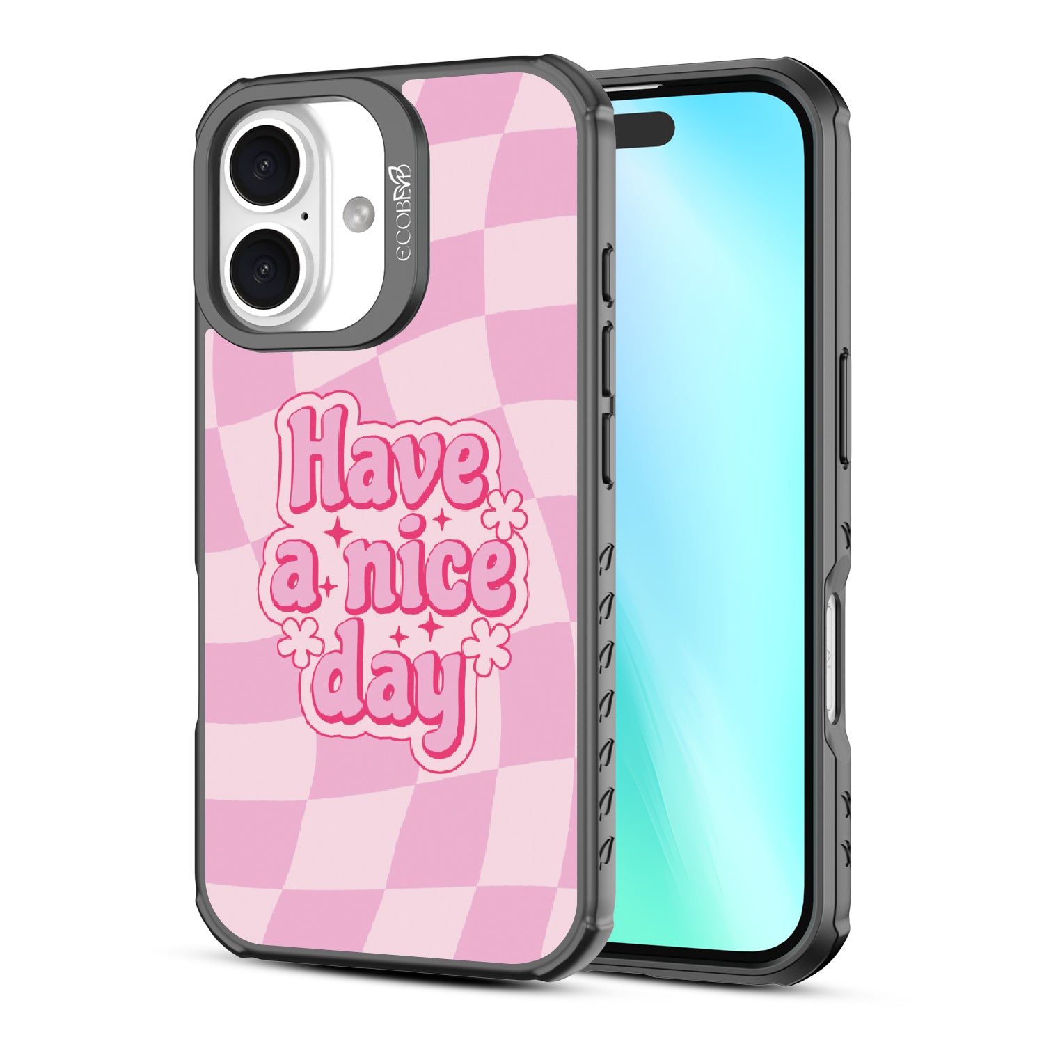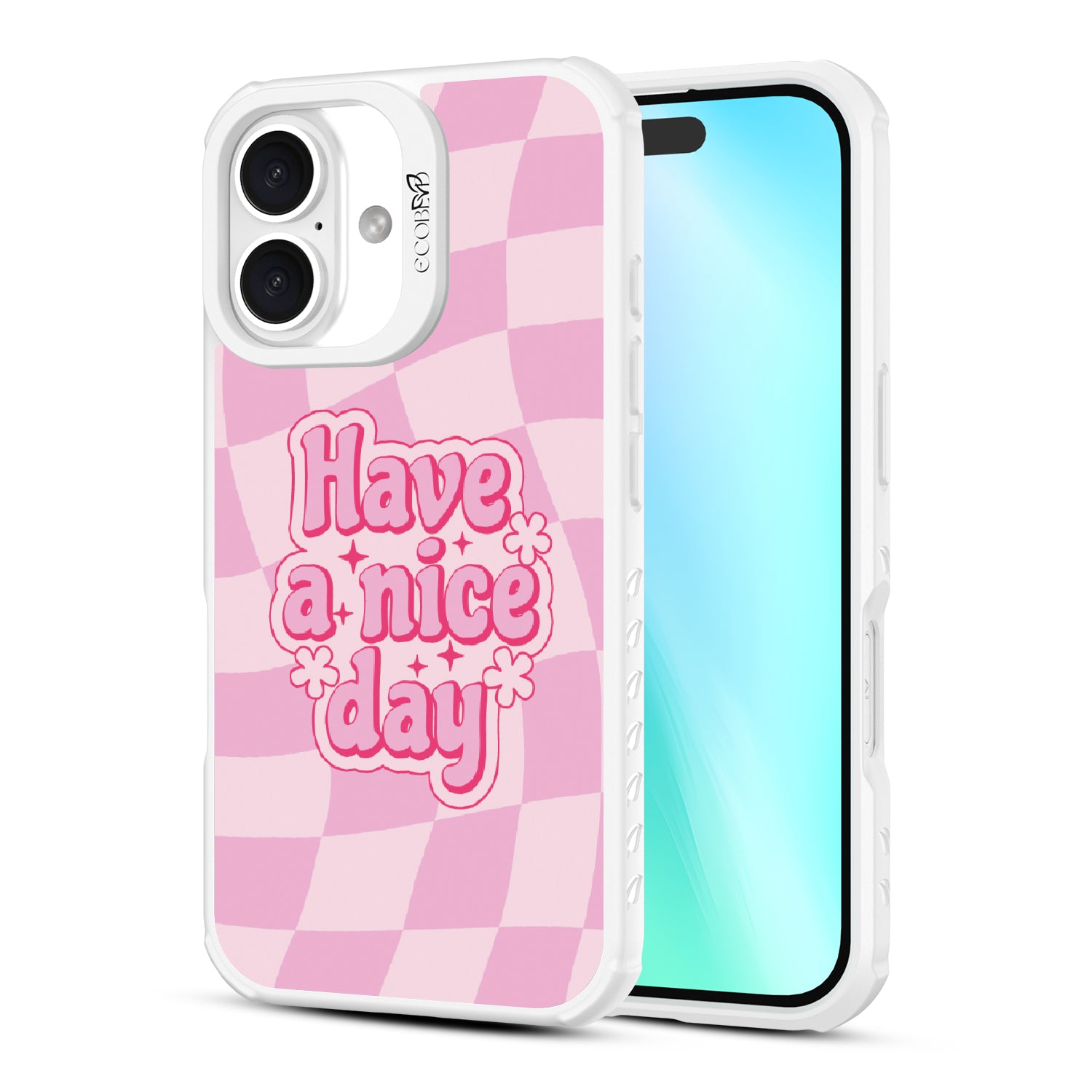 Set the stage for a brighter day with the Have A Nice Day design on our Revive clear iPhone 16 phone case, featuring an eye-catching wavy checker print pattern. This daily reminder gives an uplifting atmosphere your phone needs, making every day a nice day filled with positivity.