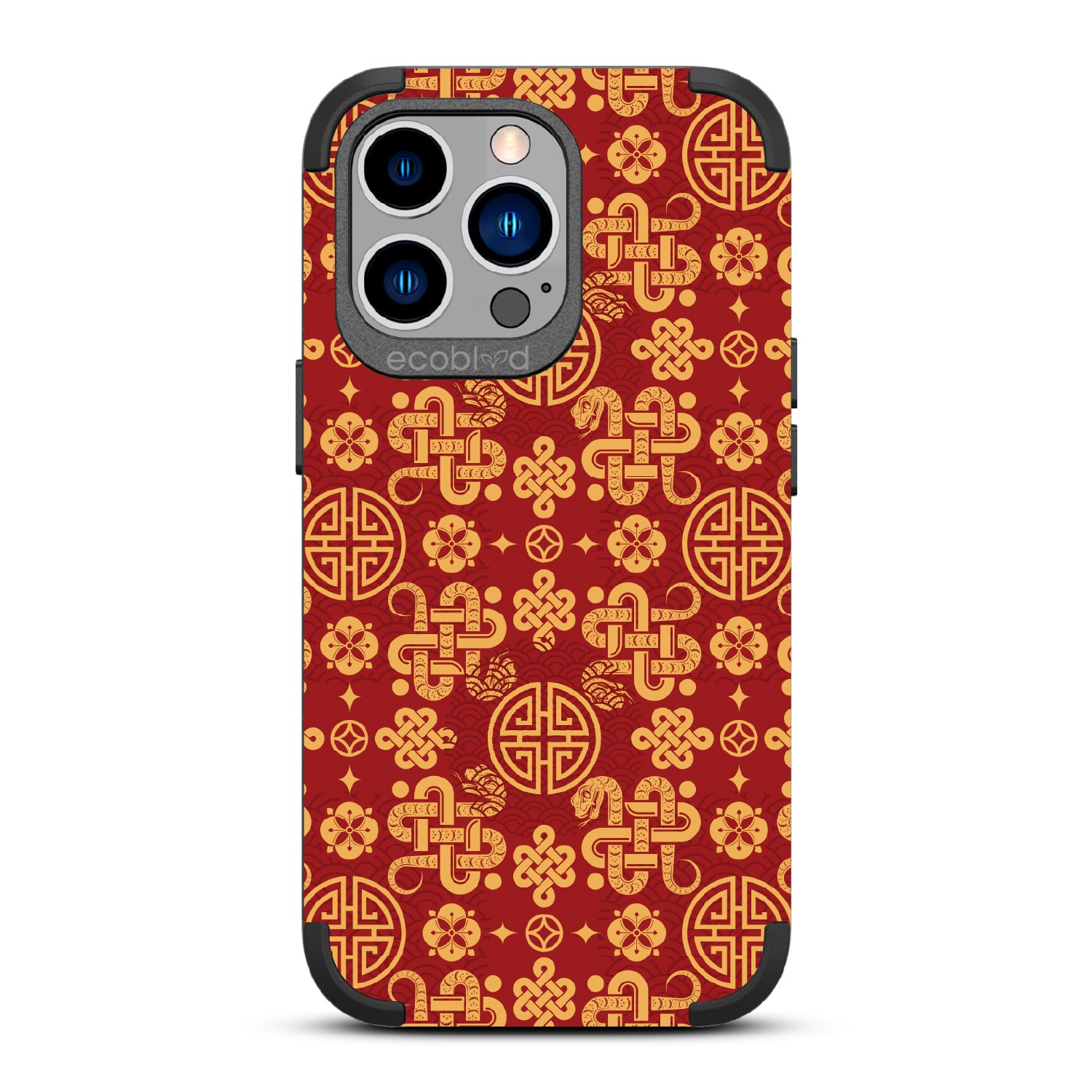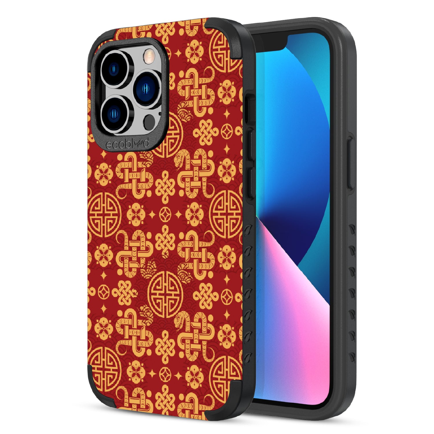 Uncoil the promise of prosperity with the Coiled In Gold design on our Mojave rugged and compostable iPhone 13 Pro case. The golden serpents twist and spiral, shedding their past skins as they wind their way into a new cycle of growth and transformation. With every golden coil, this design captures the essence of renewal—leaving behind the old to make room for the fortune and success 2025 brings.