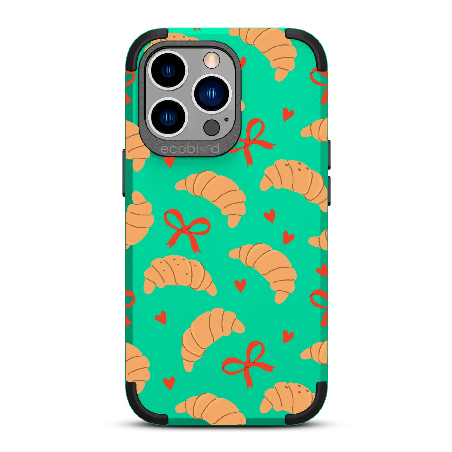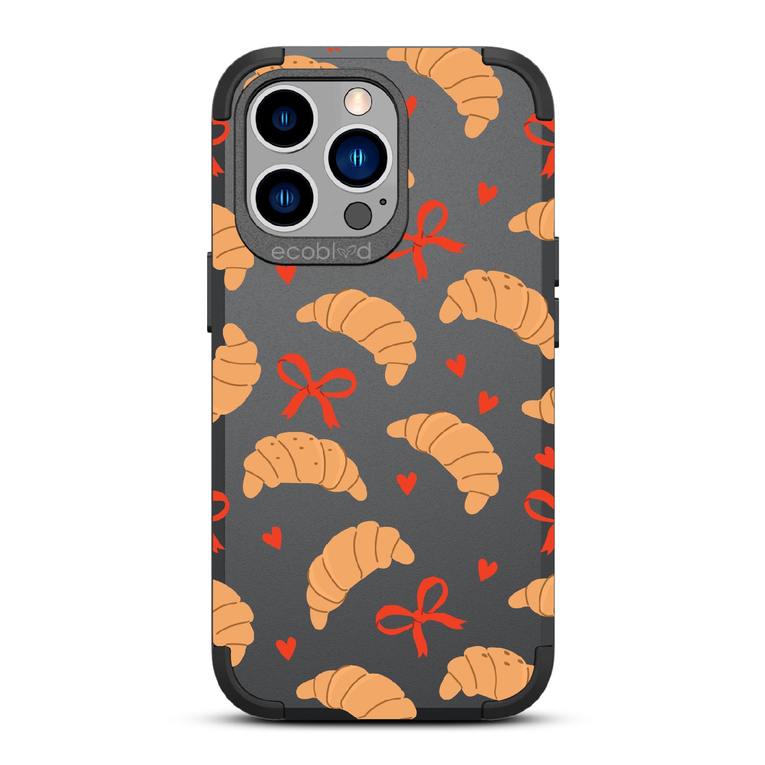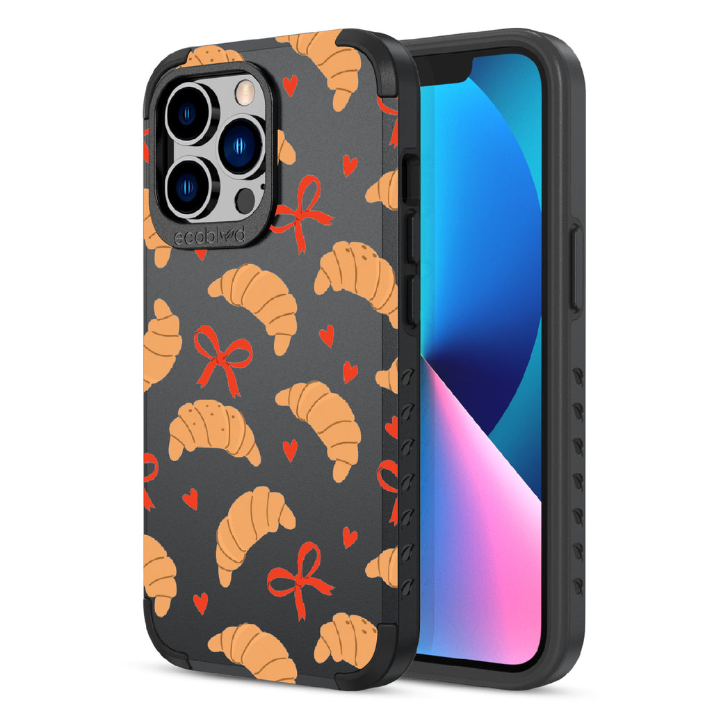 Good taste deserves the perfect recipe like the Croissant Couture design on our Mojave rugged and compostable iPhone 13 Pro case! Softly folded croissants, tied with dainty red bows and sprinkled with sweet hearts, evoke the lightness and care of a true delicacy.