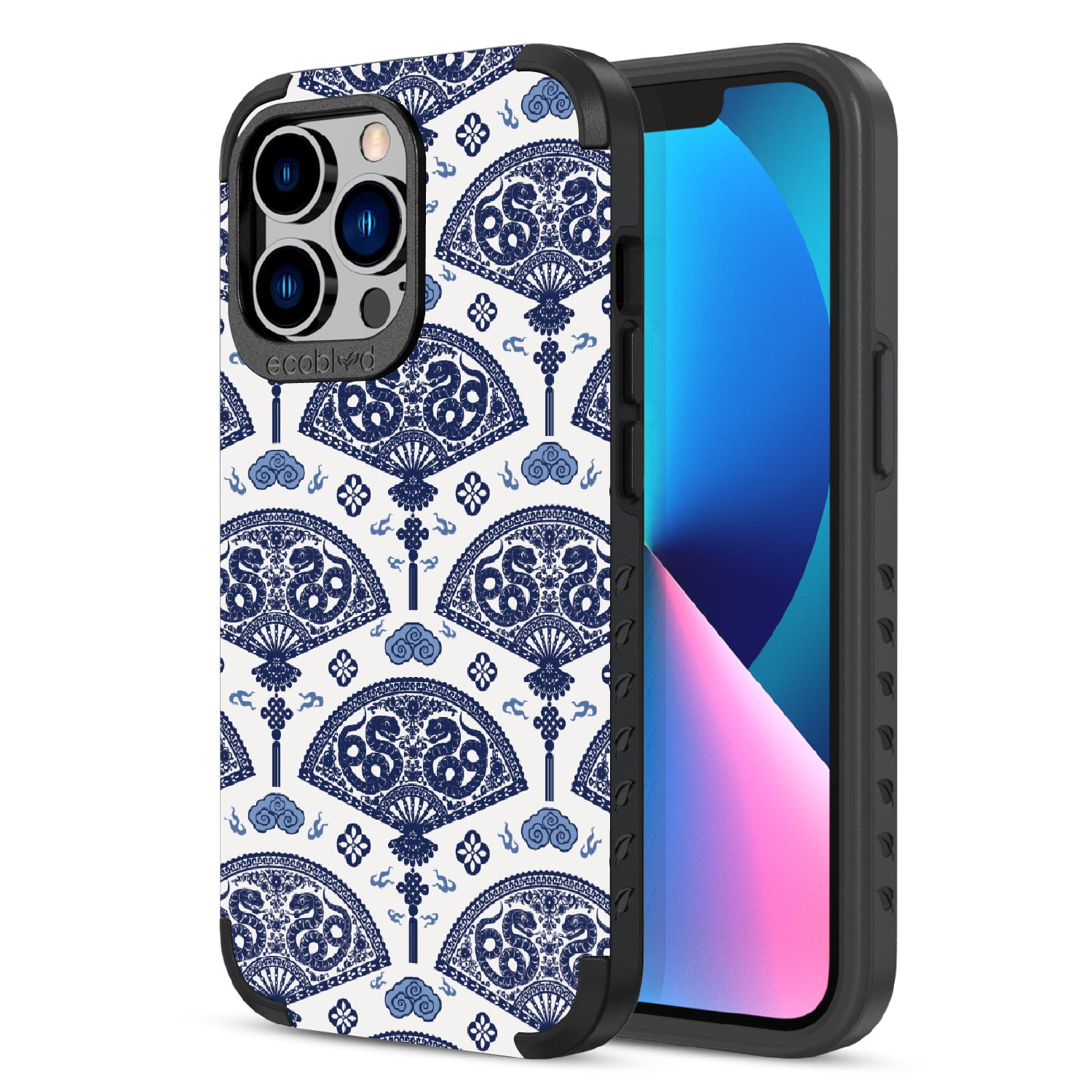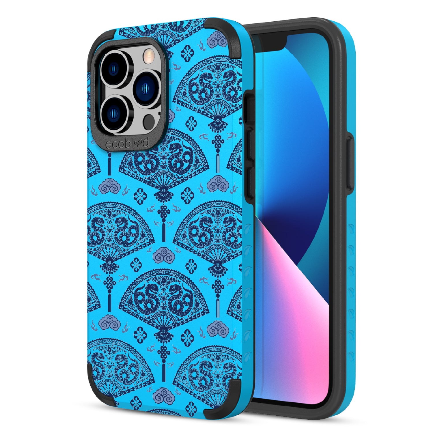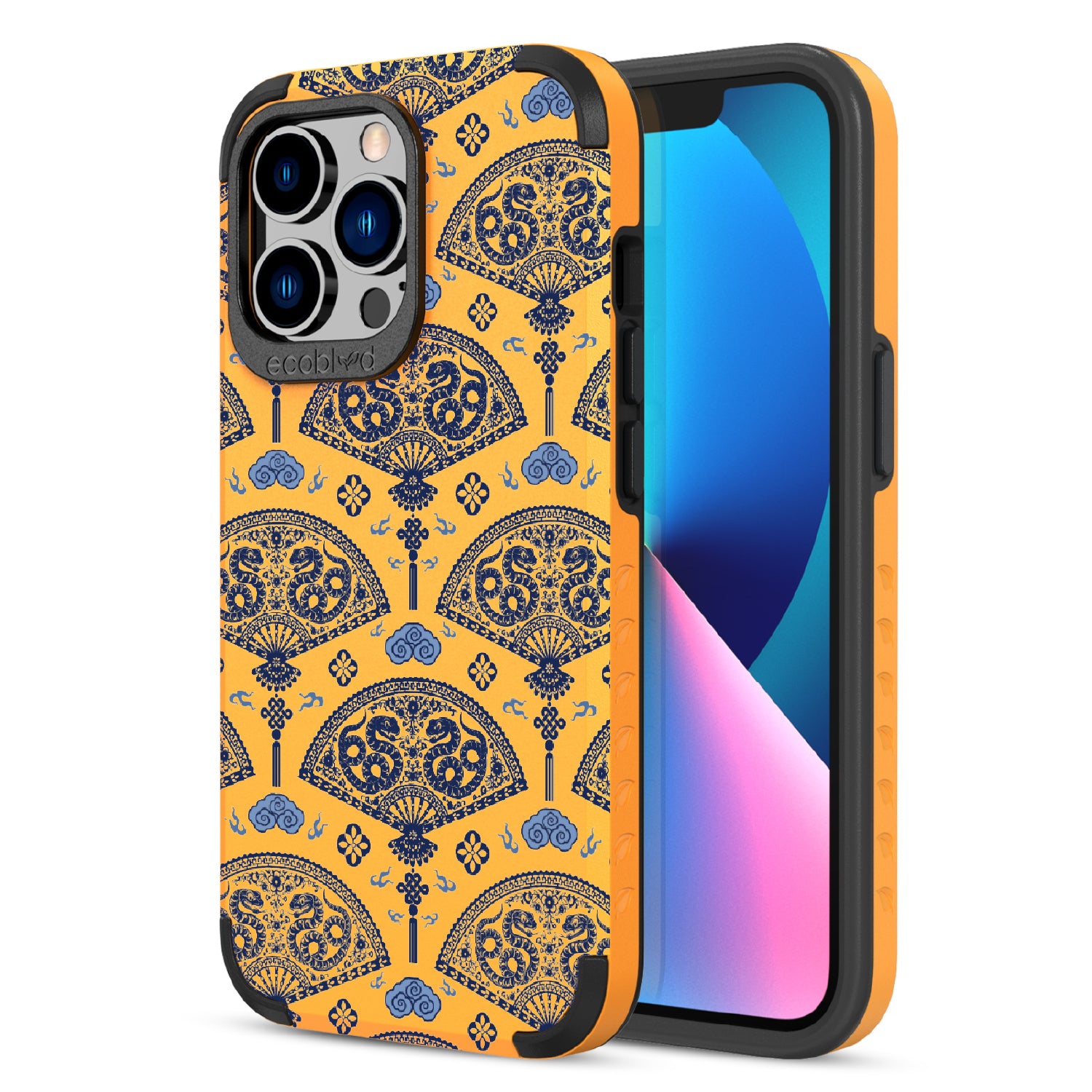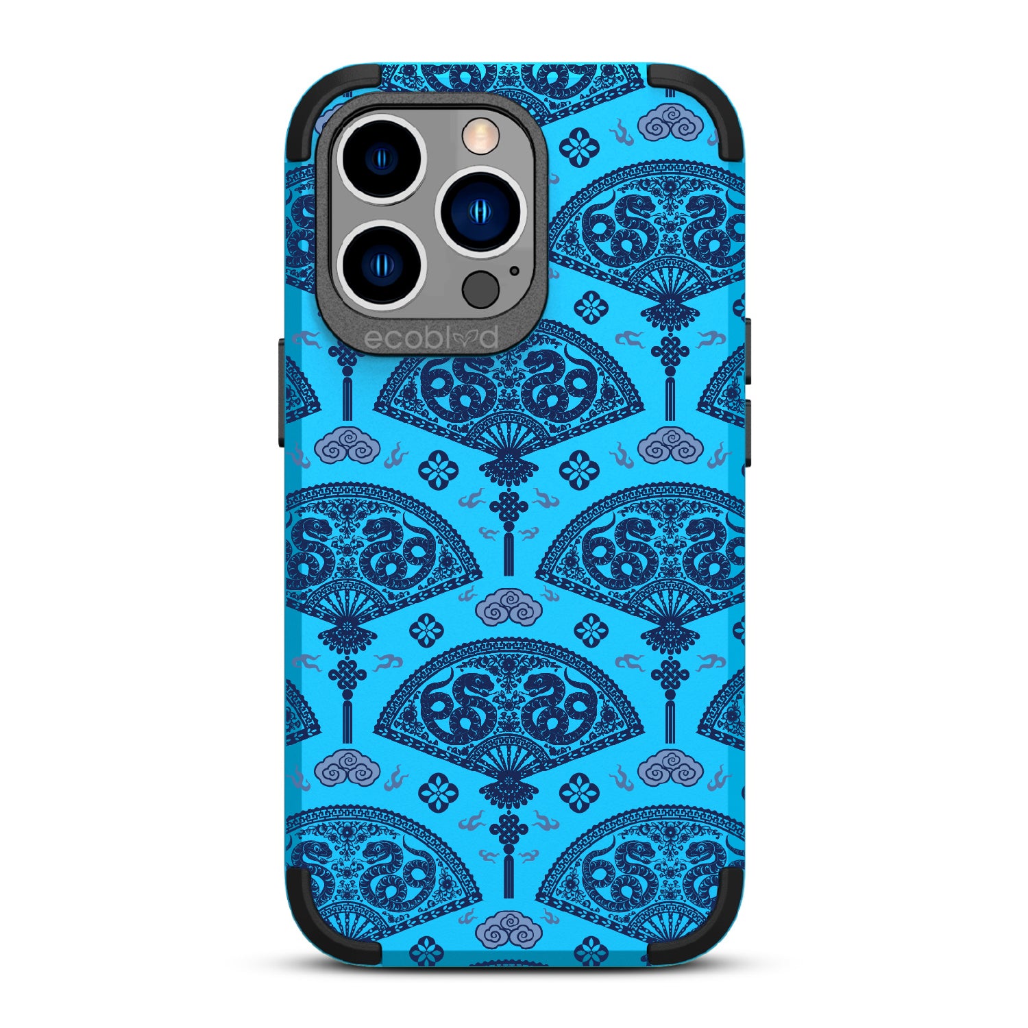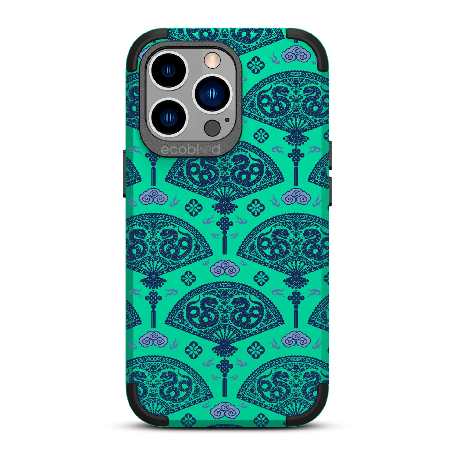 Let the winds of good fortune blow your way with the Fanning Fortune design on our Mojave rugged and compostable iPhone 13 Pro case. Golden serpents coil through beautifully detailed fans, a symbol of protection and prosperity for the Year of the Snake. The blue and yellow hues reflect the harmony between calmness and vitality, setting the tone for a year filled with new opportunities and growth.