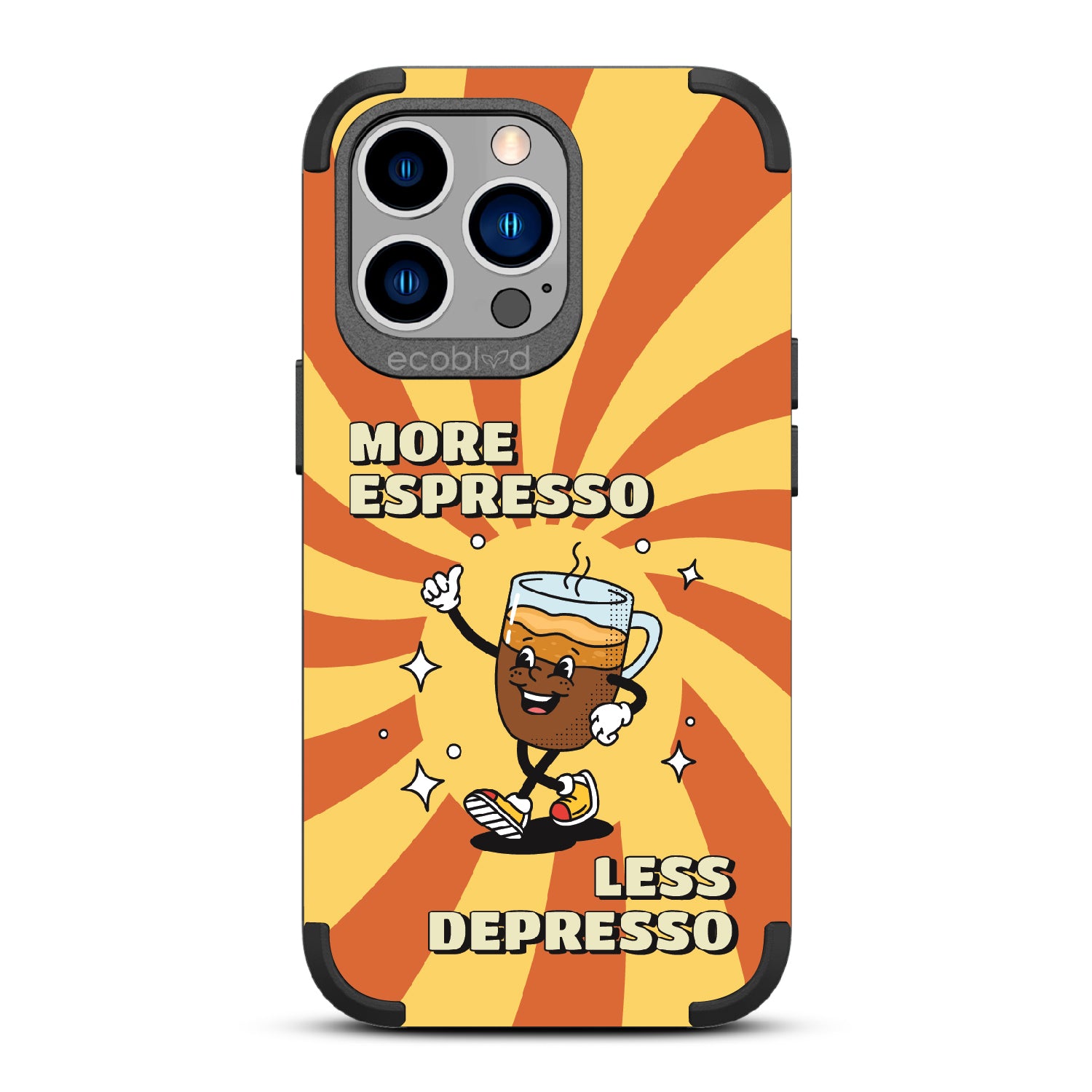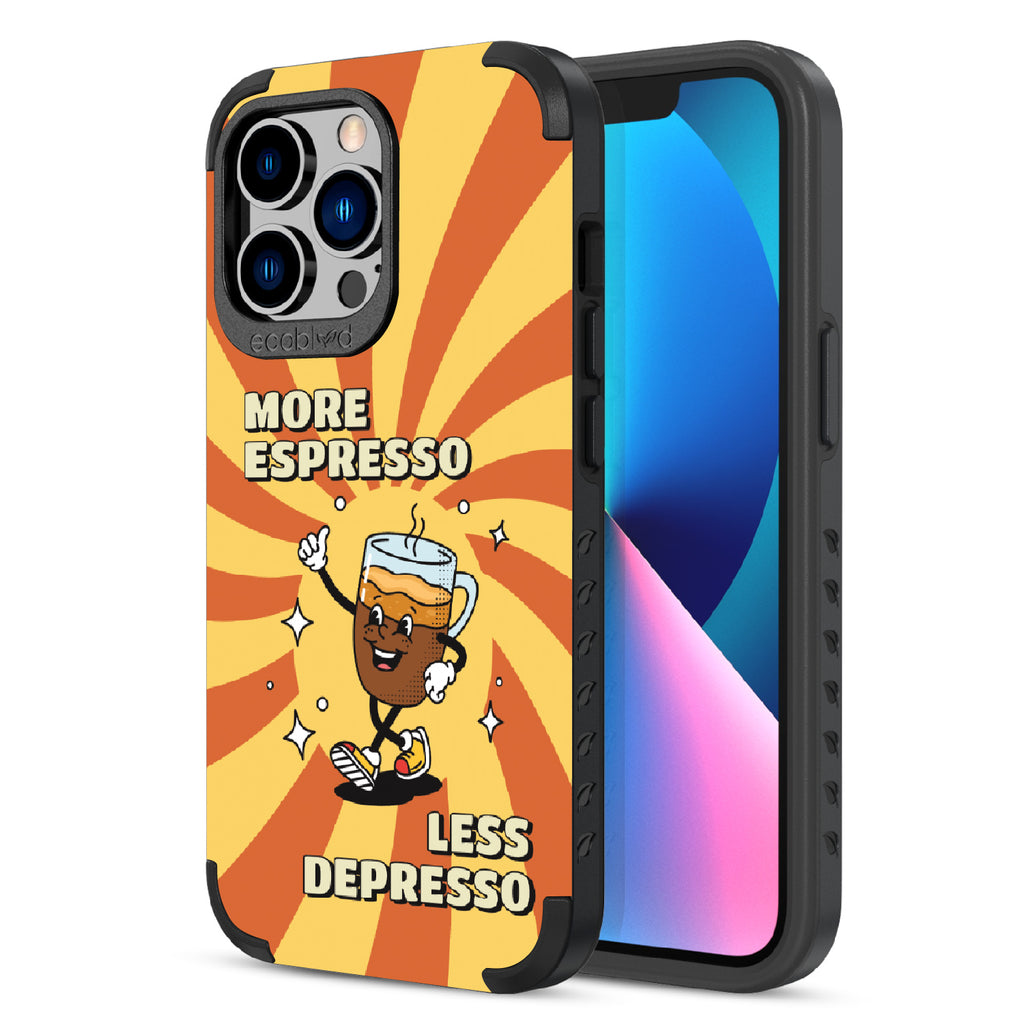 "More espresso, less depresso”—it’s that simple. A cheerful coffee mug and your new daily mantra bring good vibes to life with this playful design on our Mojave rugged and compostable iPhone 13 Pro case. Brew positivity and energy into every moment with a look that’s as bold as your first cup.
