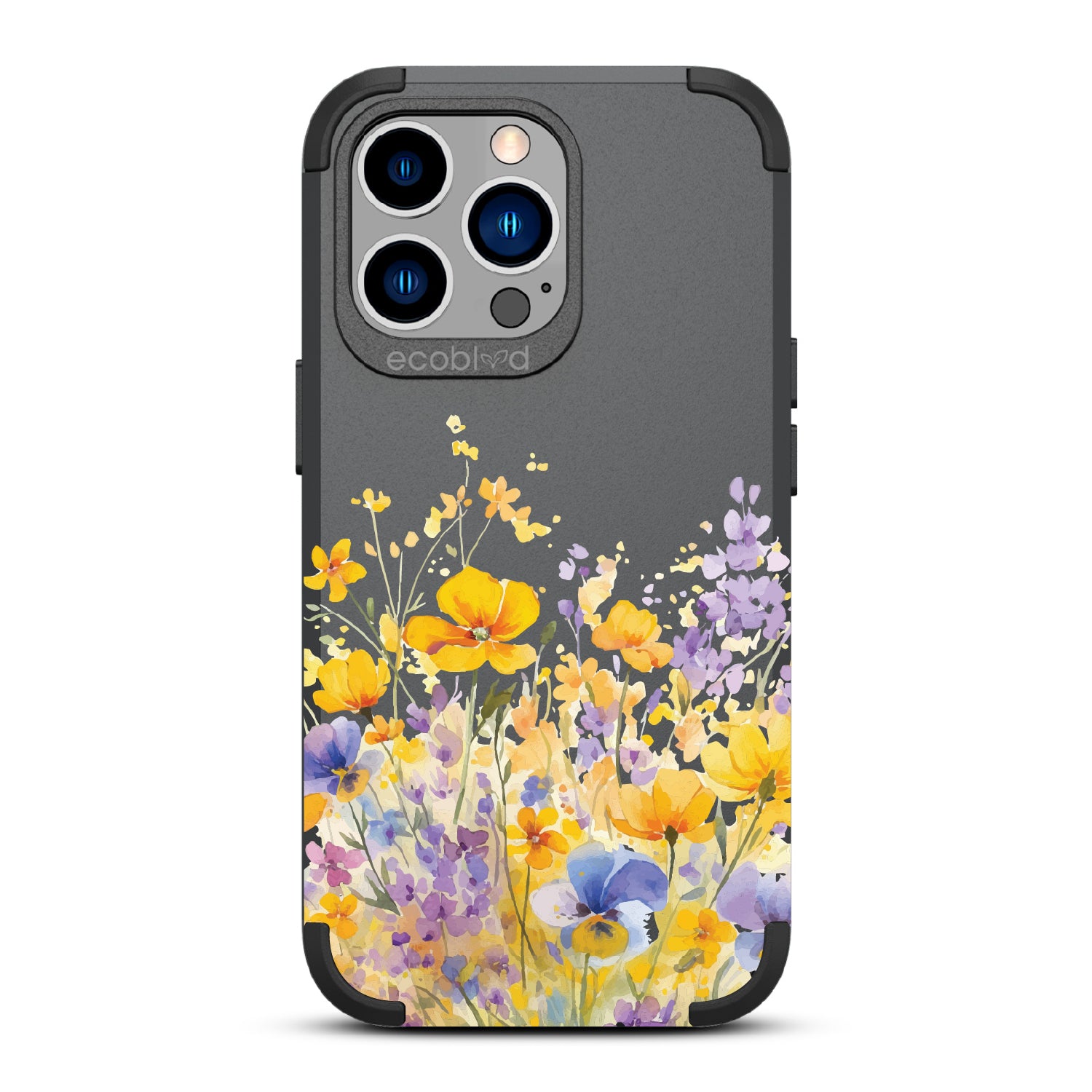 A moment in the light never looked so wild. The Meadowlight design on our Mojave rugged and compostable iPhone 13 Pro case lets soft florals run free in a watercolor wash of gold and lavender. A design that glows like a field at its most unfiltered.