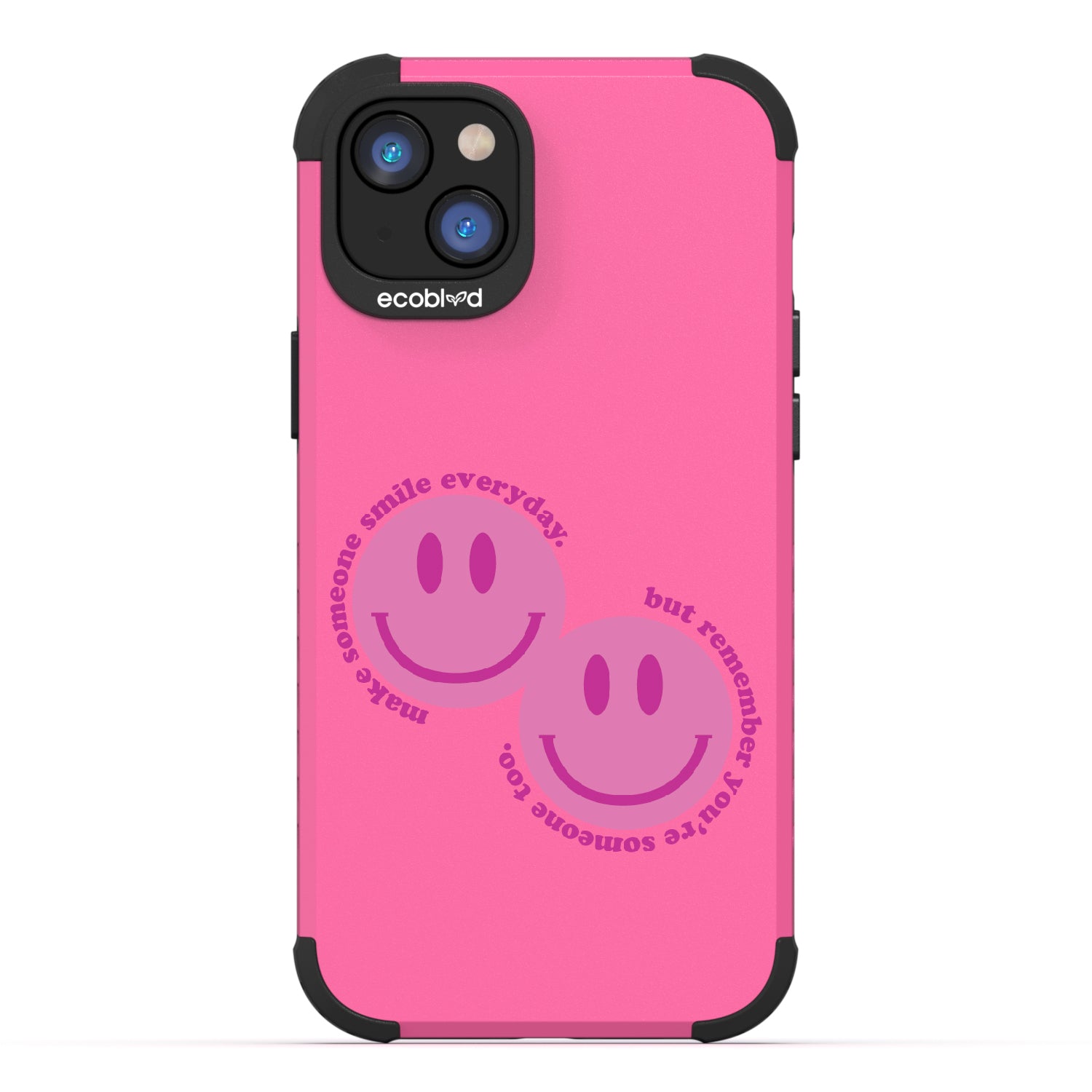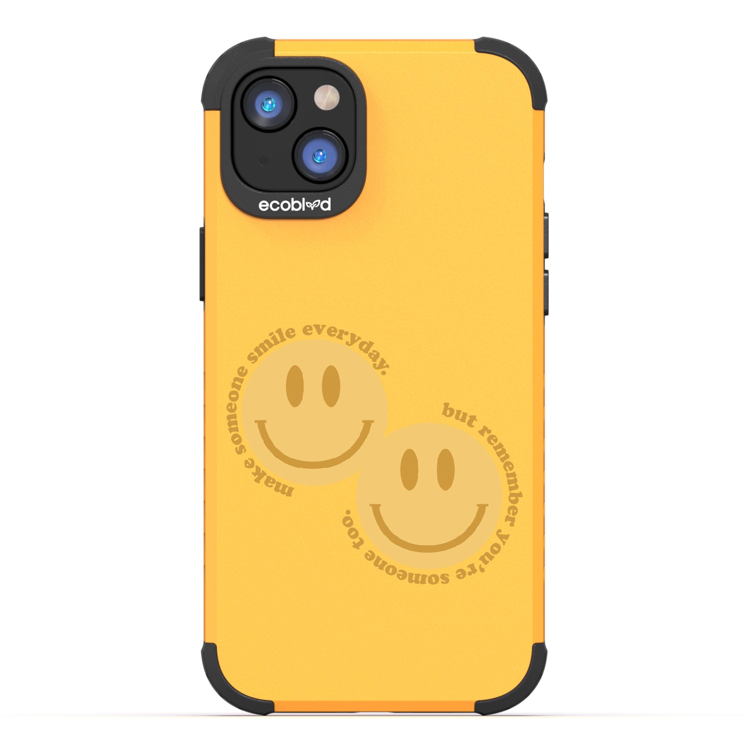 Spread happiness with the Make Someone Smile design on our Mojave rugged and compostable iPhone 16e, iPhone 14, and iPhone 13 phone case. Featuring two cheerful smiley faces, this design prompts you to be a source of joy for others. While you make someone else smile, recognize that you too are deserving of moments filled with happiness.