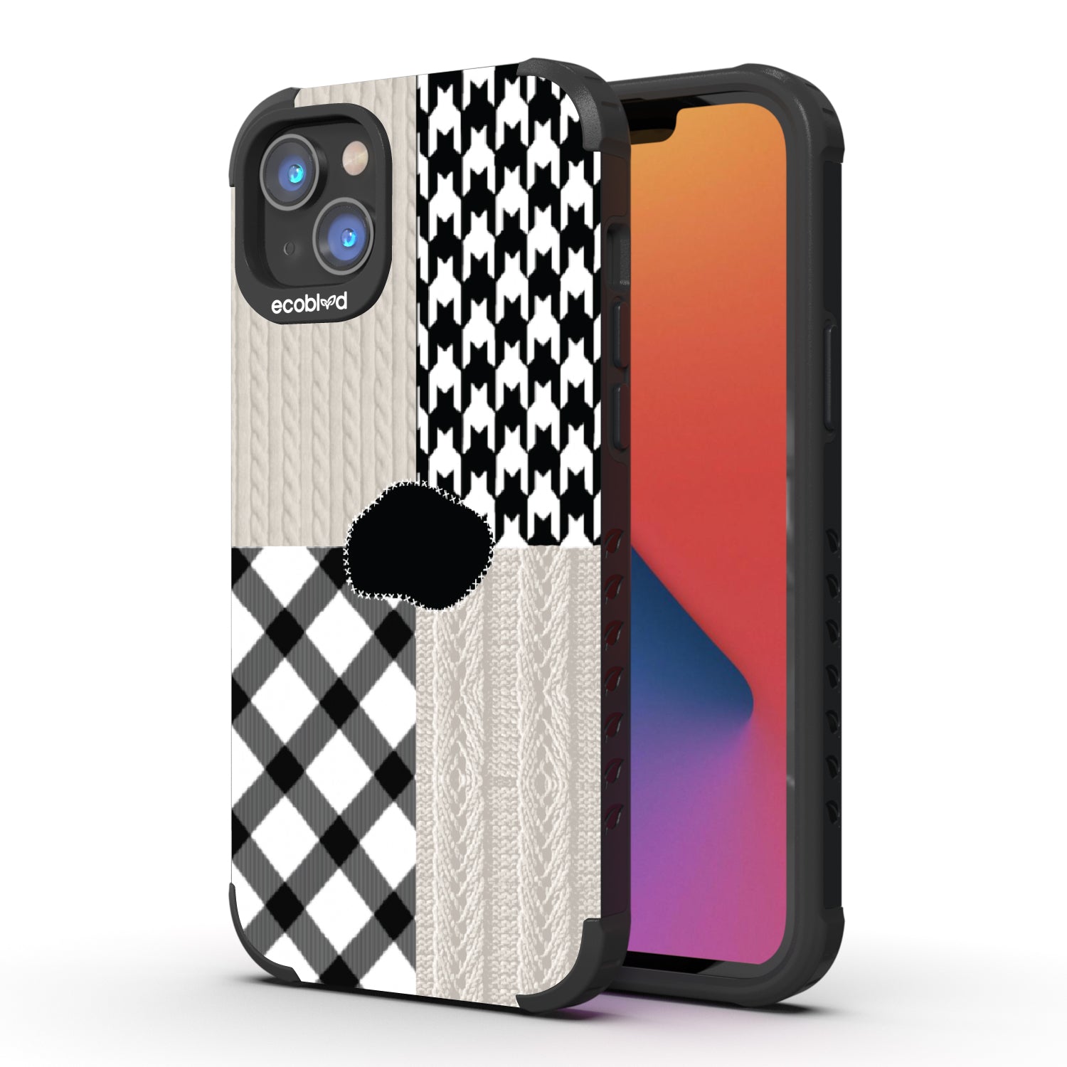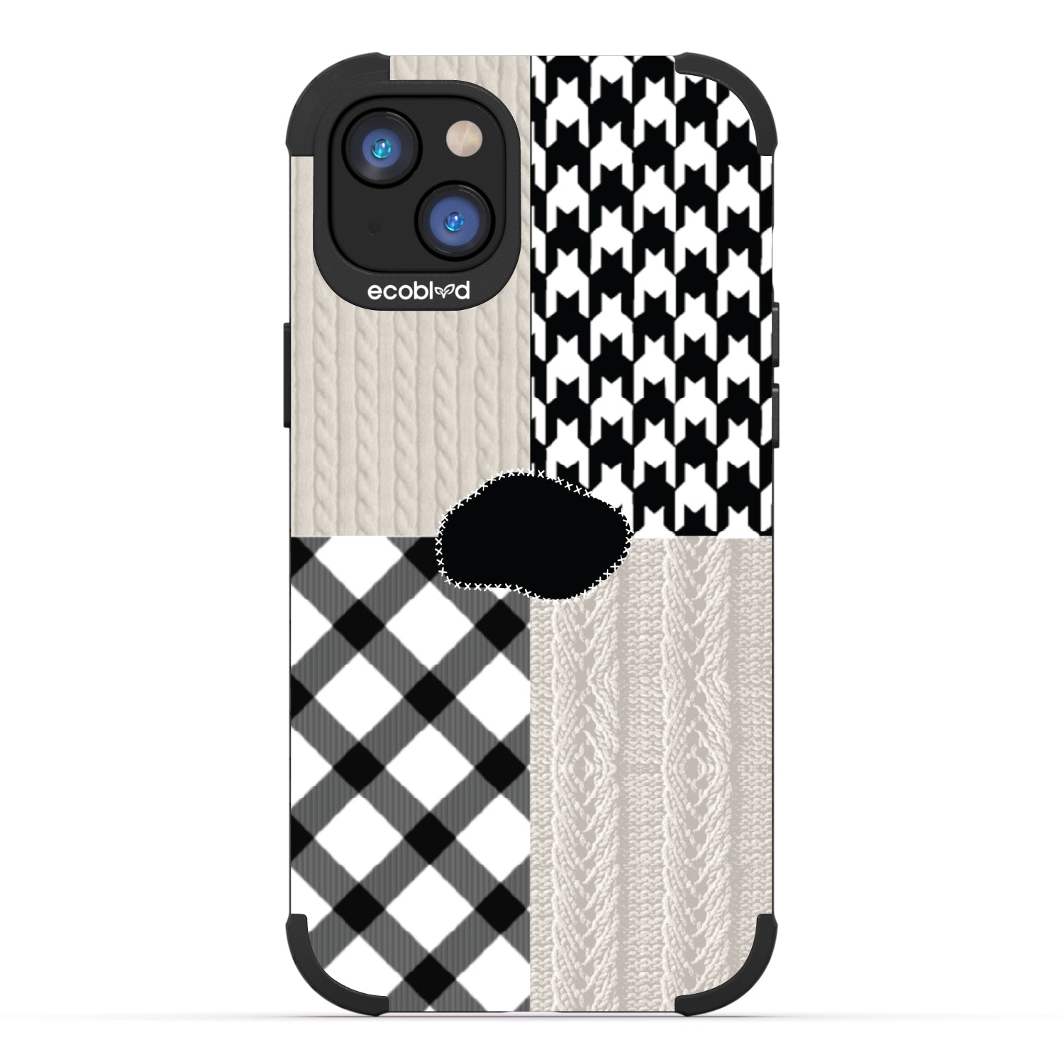 Mix and match your phone's style with the Pattern Play design on our Mojave rugged and compostable iPhone 16e, iPhone 14, and iPhone 13 case. It's where cozy cable knit meets classic houndstooth, plaid dances with more cable knit, and the black uneven patch is the unexpected twist that makes your phone's look uniquely fabulous.