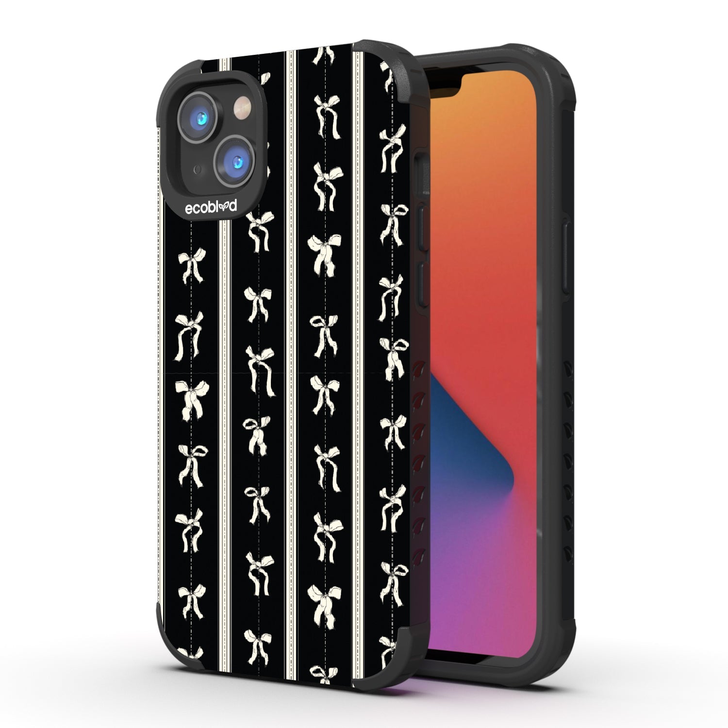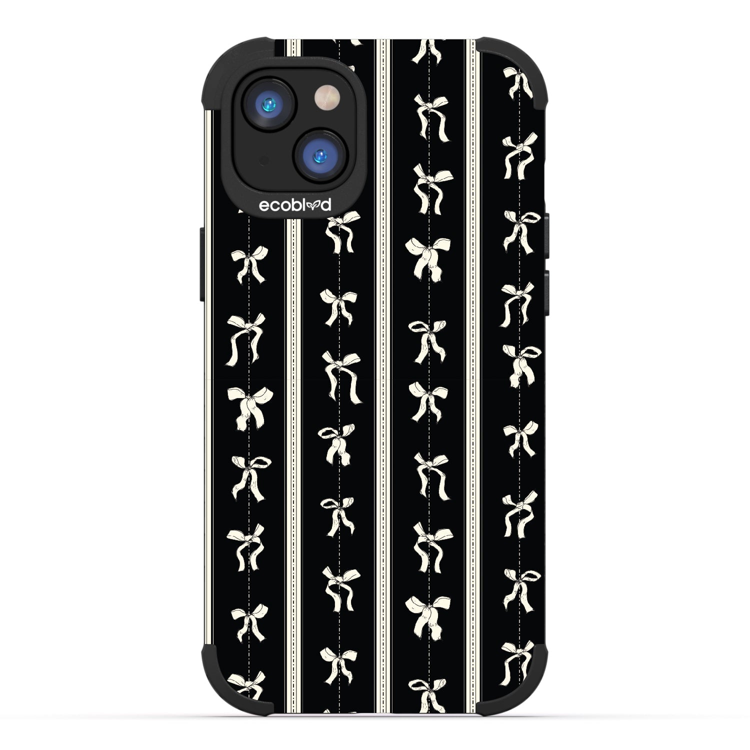 Twirl like no one’s watching with the Ribbon Twirl design on our Mojave rugged and compostable iPhone 16e, iPhone 14, and iPhone 13 phone case. Ribbons gracefully swirl on a sleek black lace backdrop, infusing your look with dainty sophistication. These twirling ribbons will make every step feel like a stylish dance.