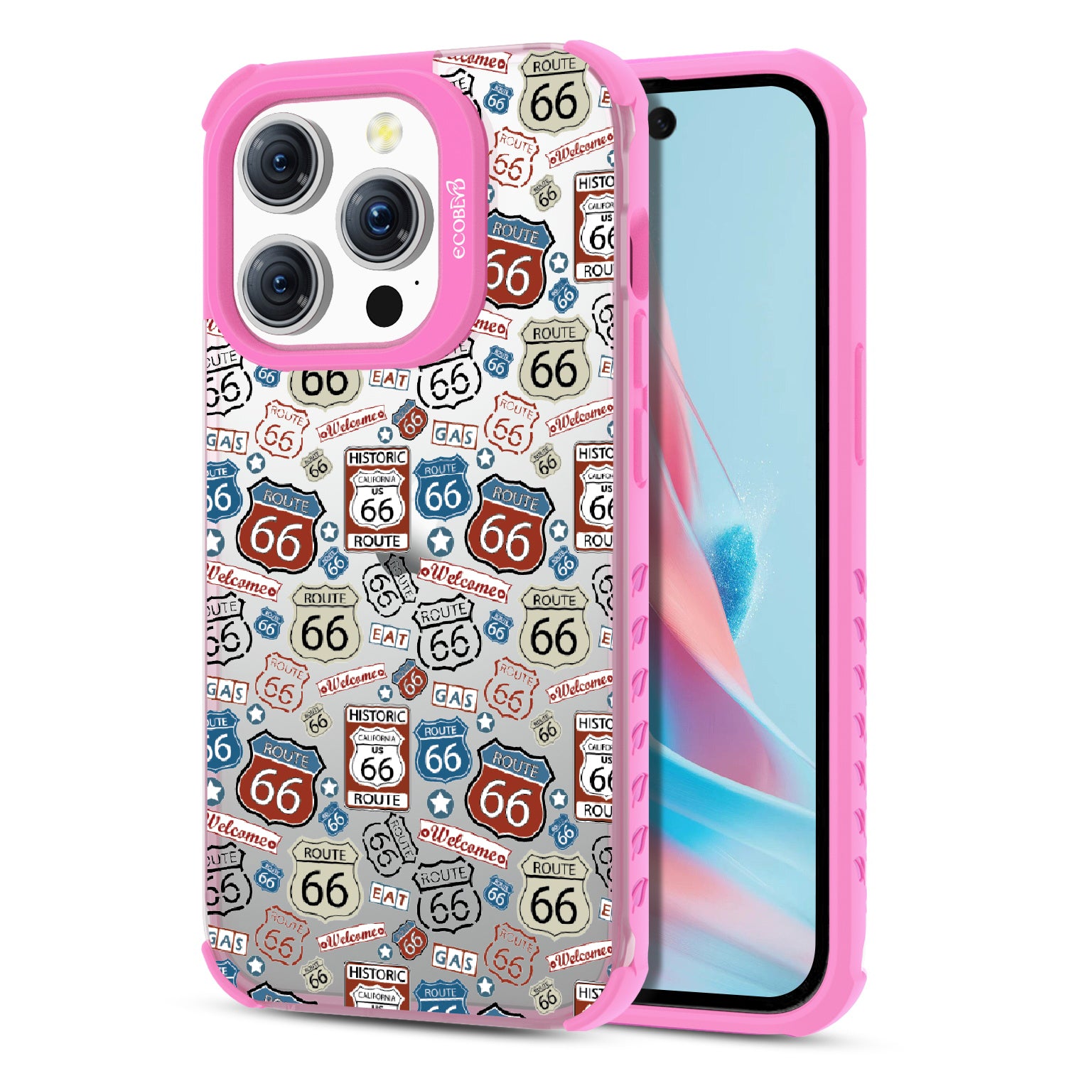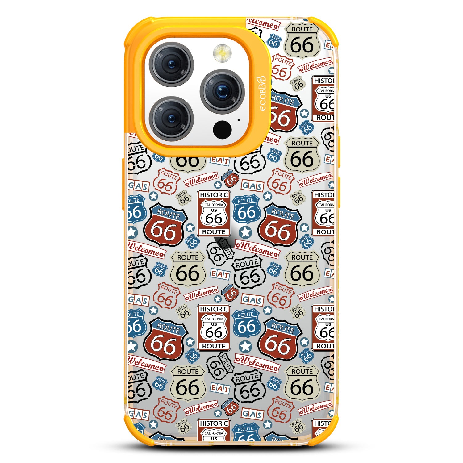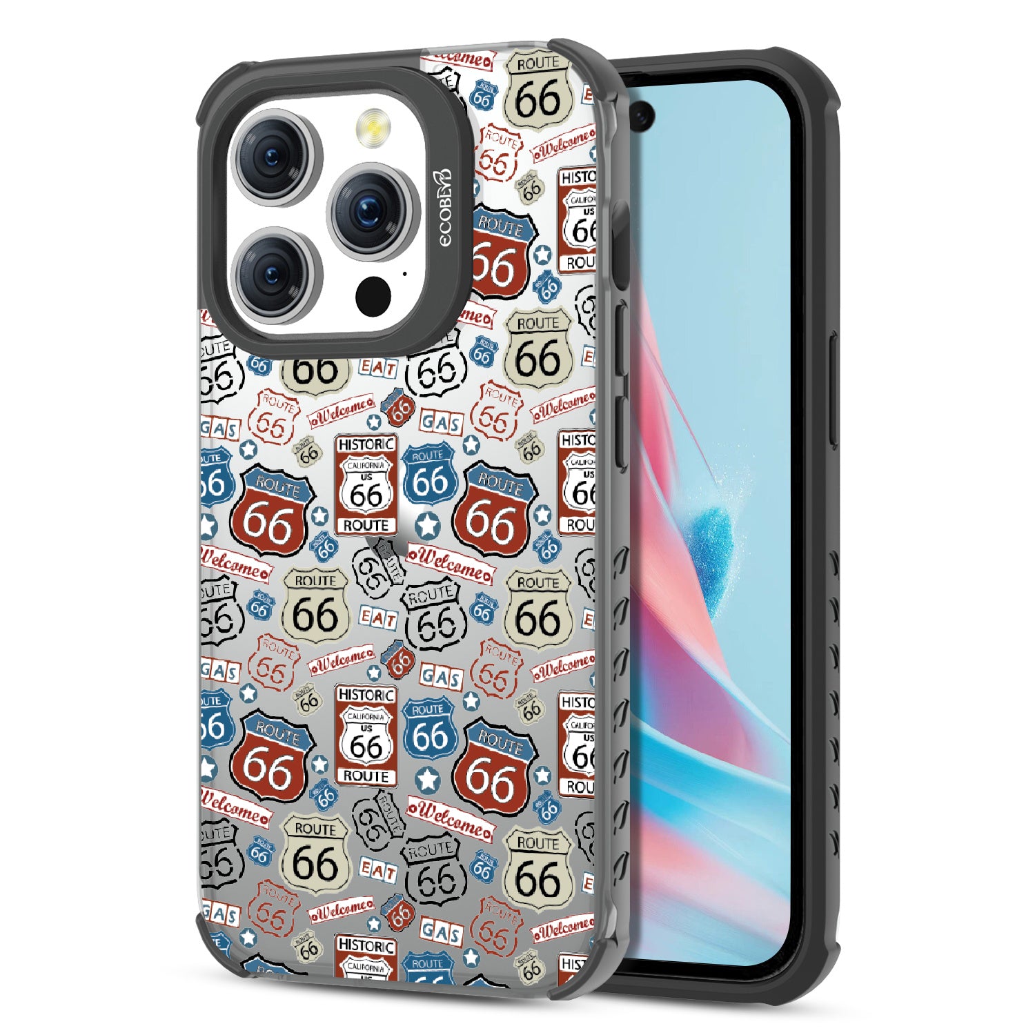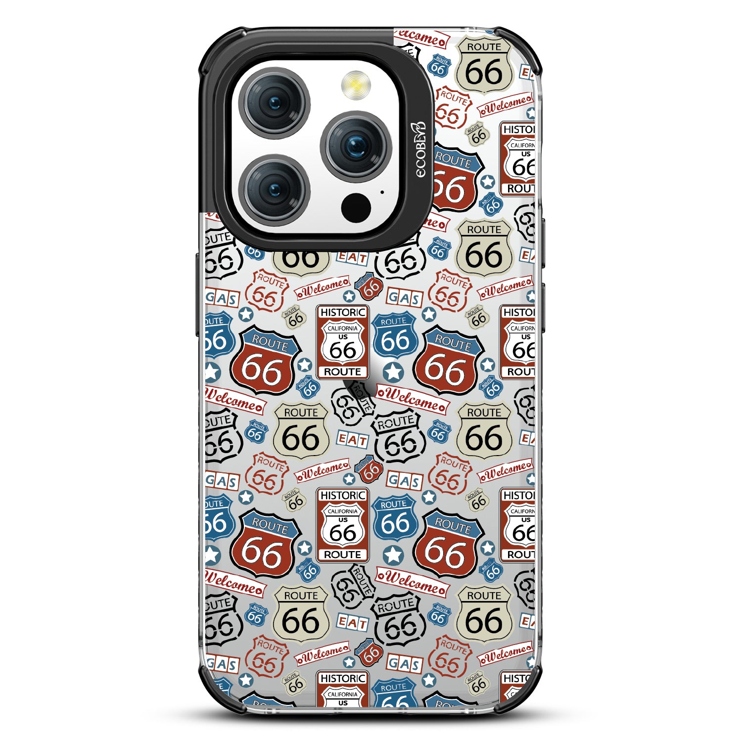 Travel the famed Route 66 with our Country Roads design on our Laguna clear iPhone 15 Pro phone case. Showcasing iconic Route 66 signs, rustic road markers, and scenic stops, this design celebrates the timeless appeal of America’s most famous highway.