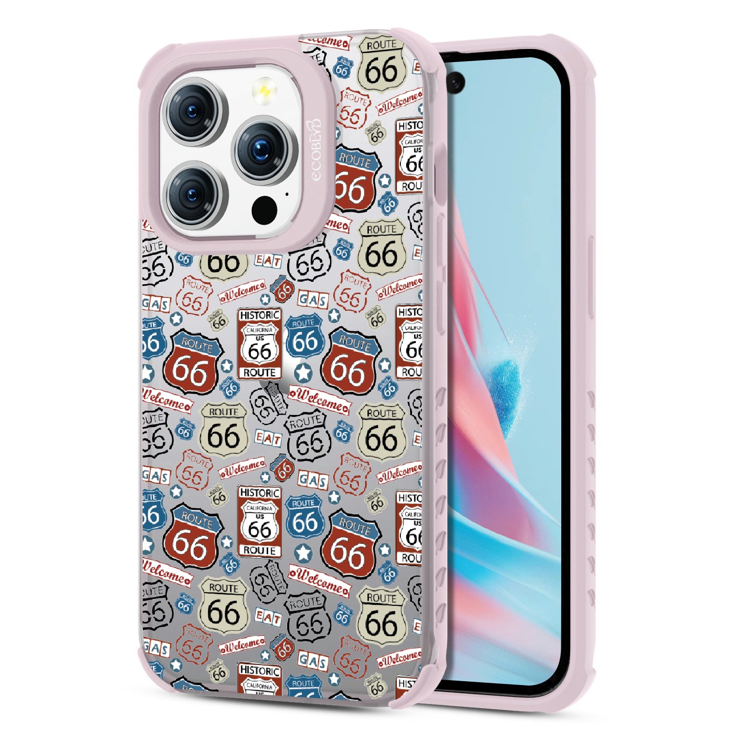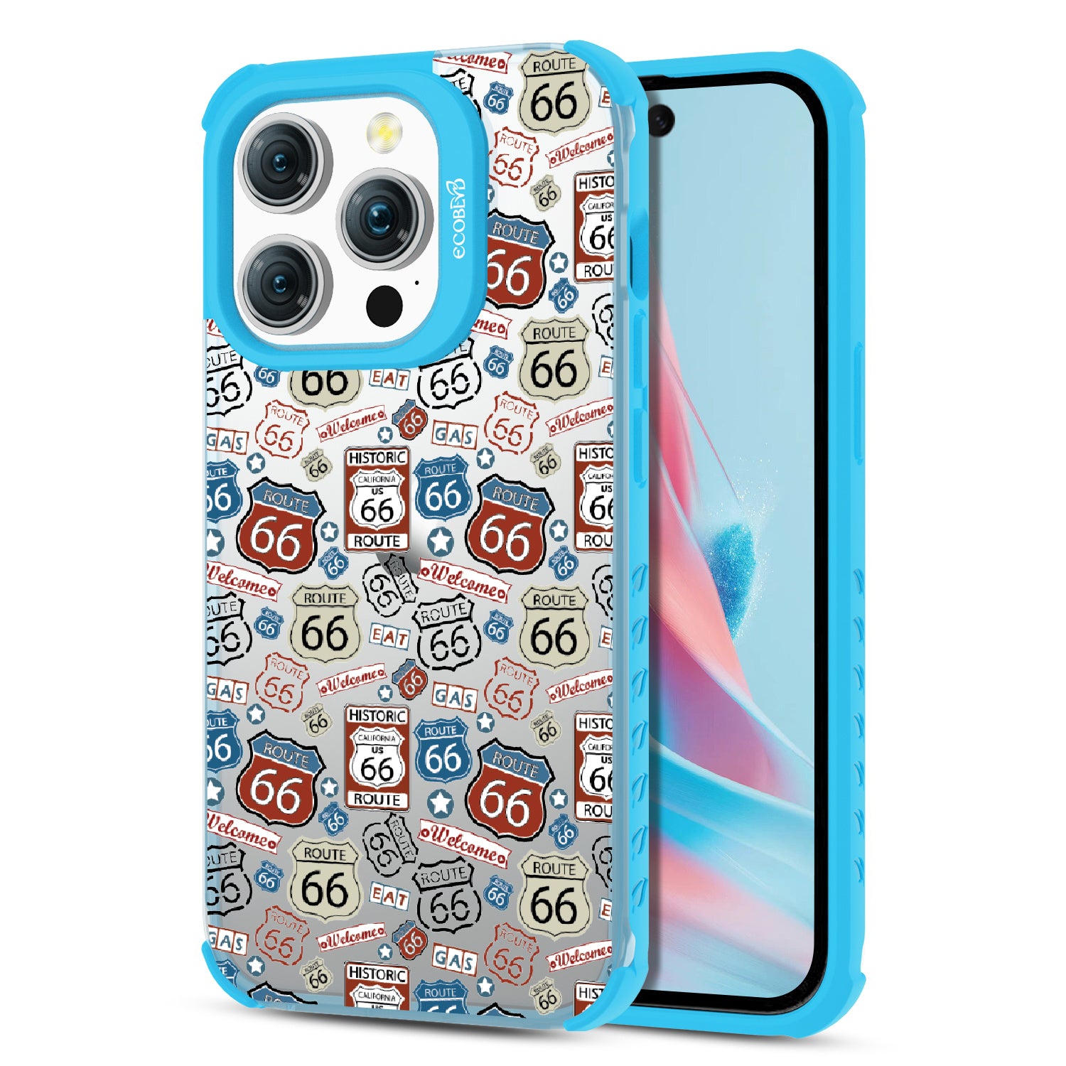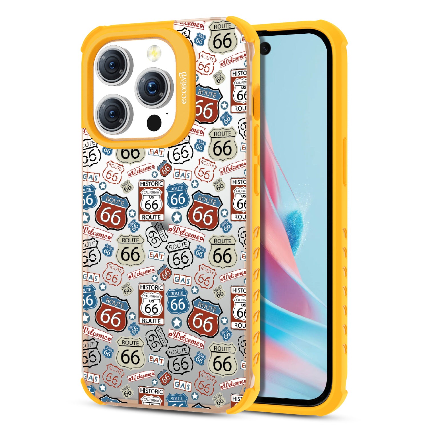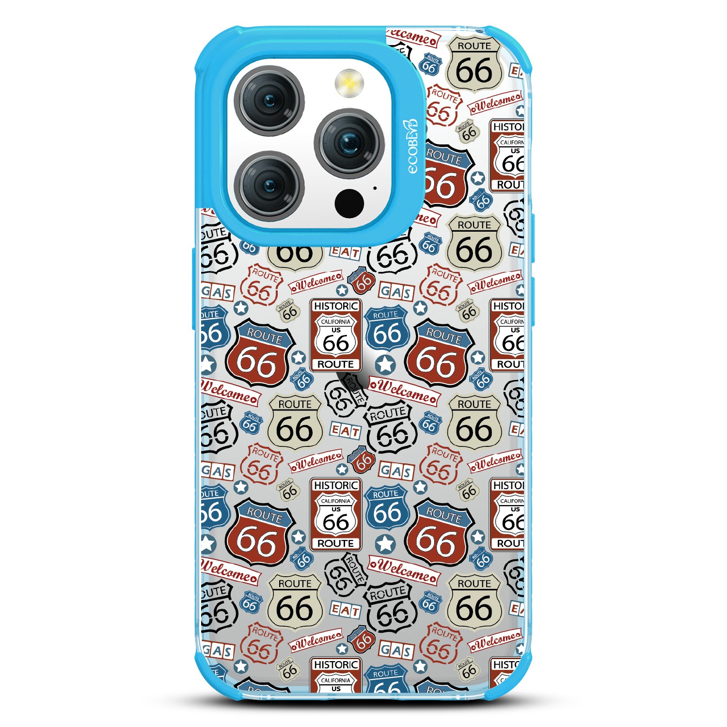 Travel the famed Route 66 with our Country Roads design on our Laguna clear iPhone 15 Pro phone case. Showcasing iconic Route 66 signs, rustic road markers, and scenic stops, this design celebrates the timeless appeal of America’s most famous highway.