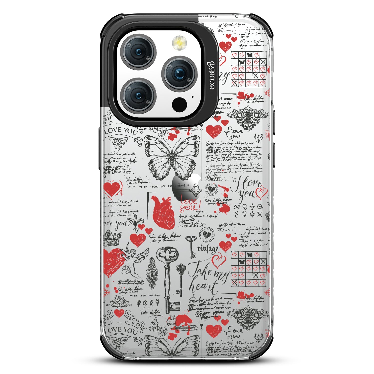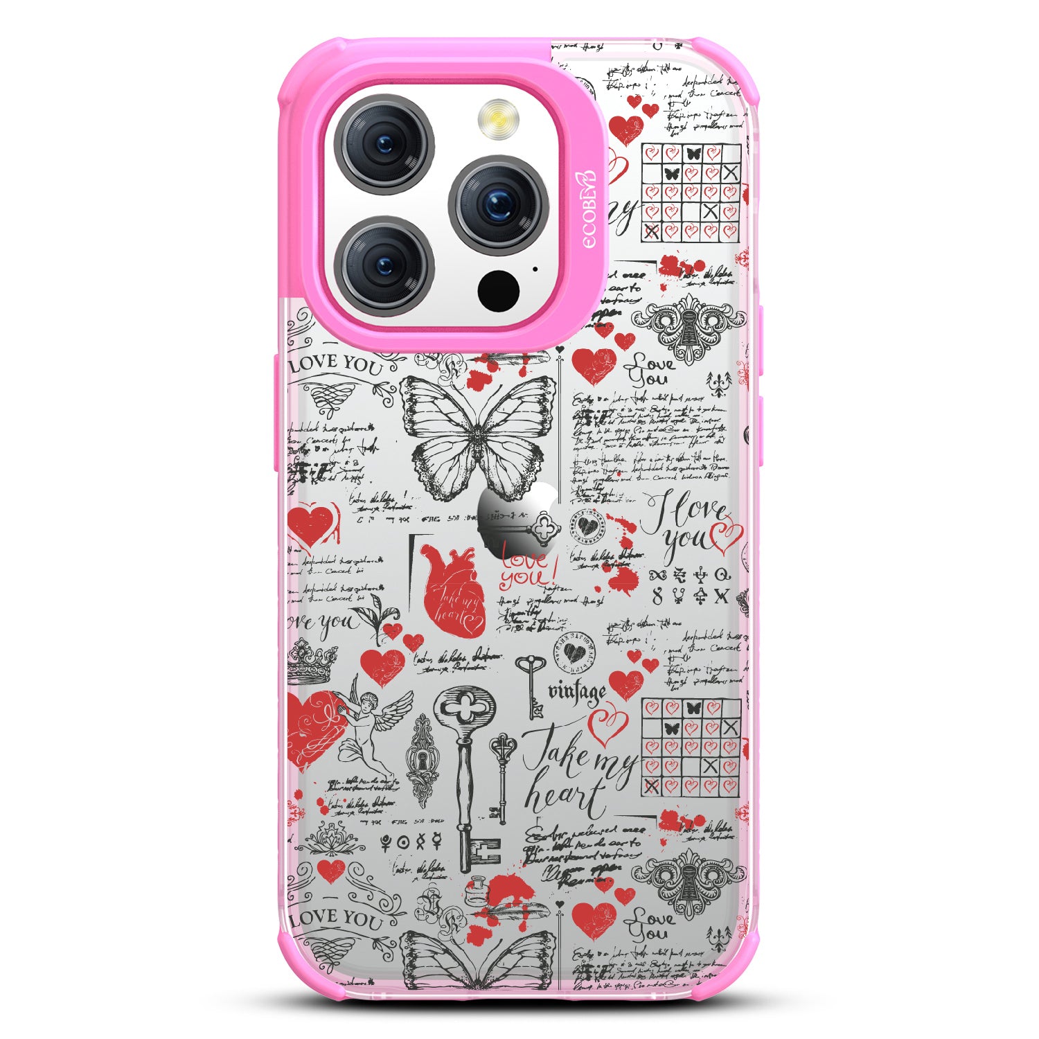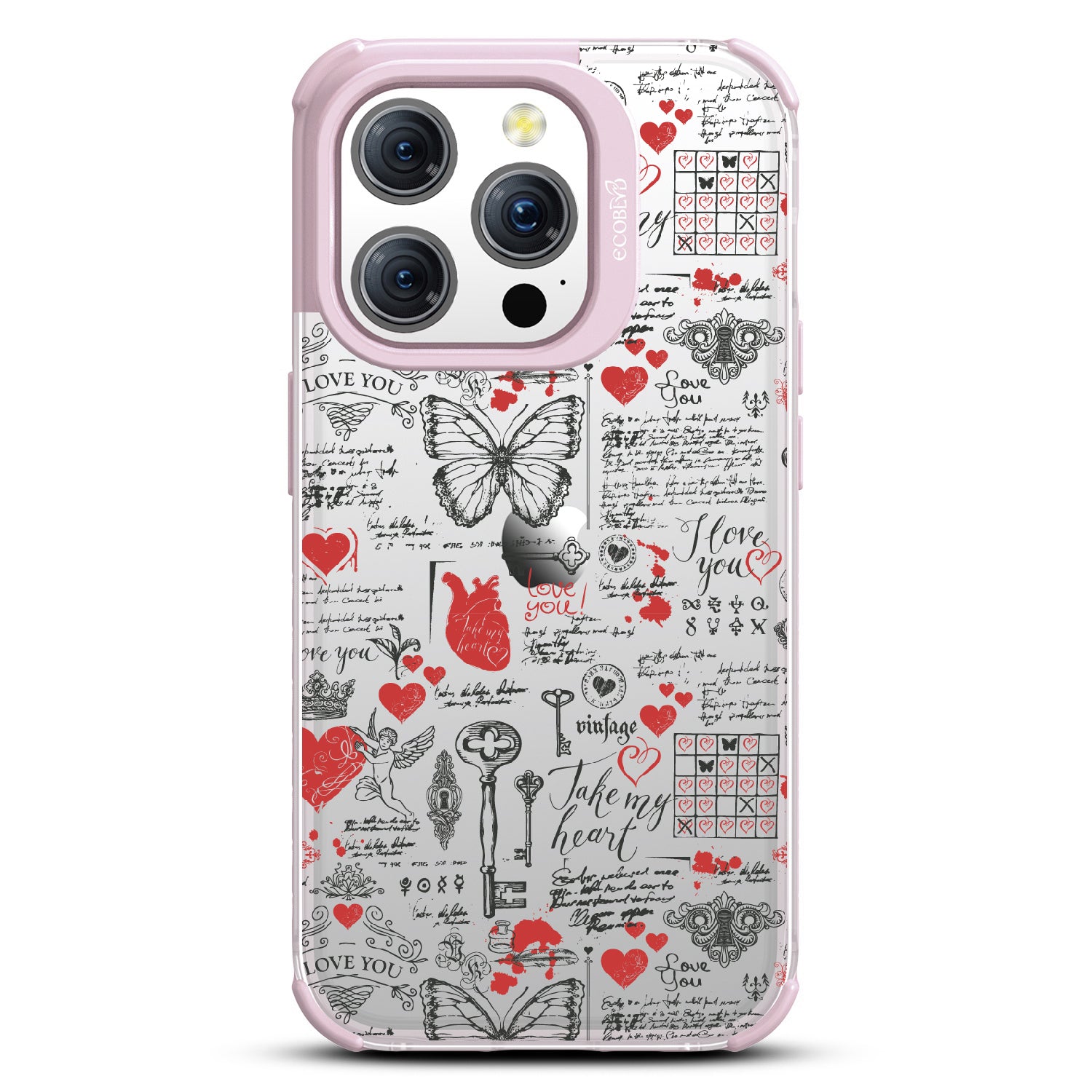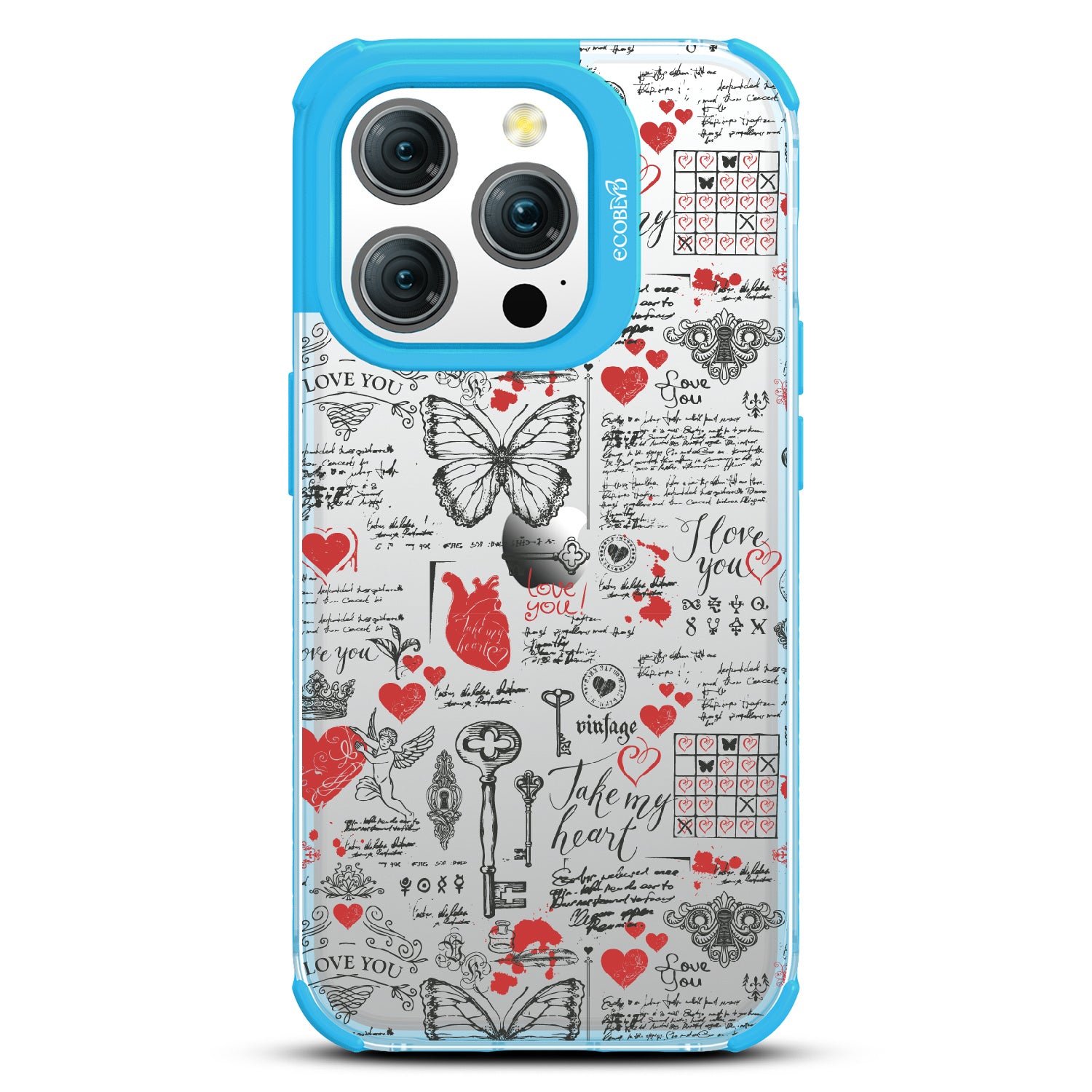 Write your emotions with the Love Notes design on our Laguna clear iPhone 15 Pro phone case. This cute scrapbook-style collage, featuring vintage stamps capturing cupid, hearts, butterflies, and phrases like "take my heart" and "I love you," encourages you to express your feelings through written expressions, turning your phone into a cherished collection of love notes.