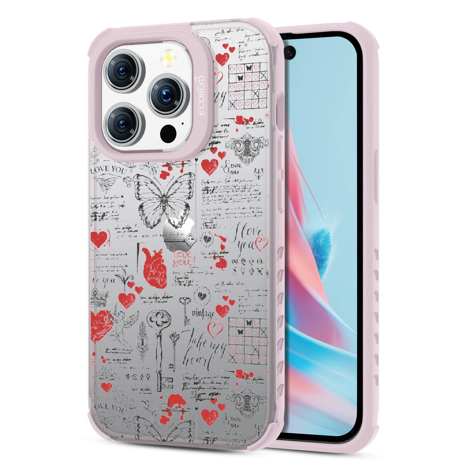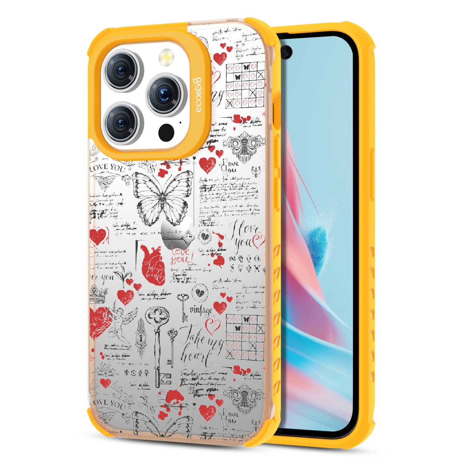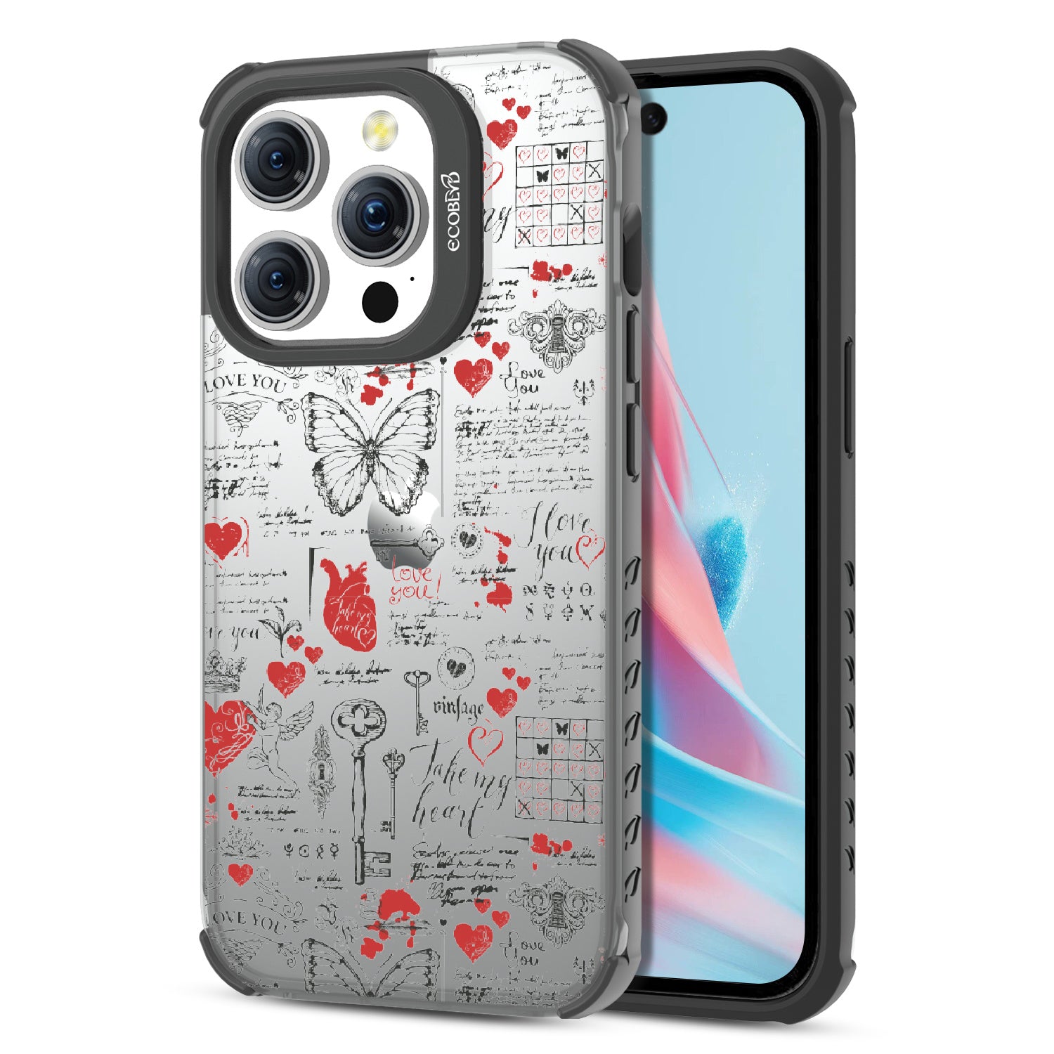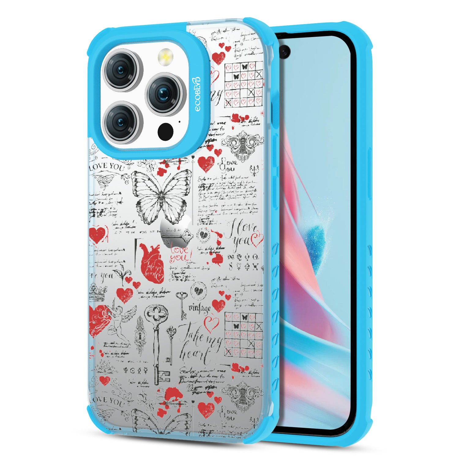 Write your emotions with the Love Notes design on our Laguna clear iPhone 15 Pro phone case. This cute scrapbook-style collage, featuring vintage stamps capturing cupid, hearts, butterflies, and phrases like "take my heart" and "I love you," encourages you to express your feelings through written expressions, turning your phone into a cherished collection of love notes.