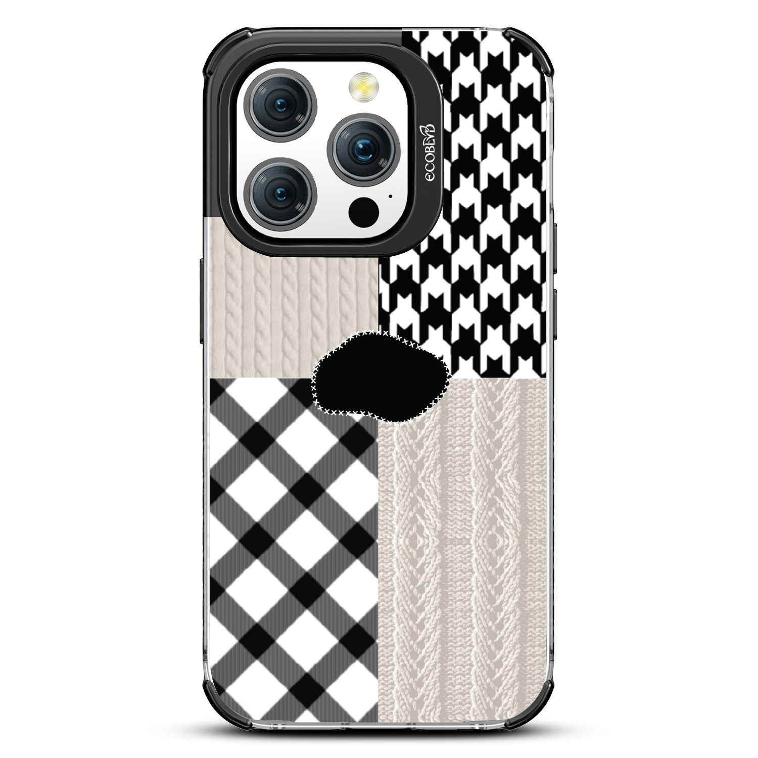 Mix and match your phone's style with the Pattern Play design on our Laguna clear iPhone 15 Pro case. It's where cozy cable knit meets classic houndstooth, plaid dances with more cable knit, and the black uneven patch is the unexpected twist that makes your phone's look uniquely fabulous.