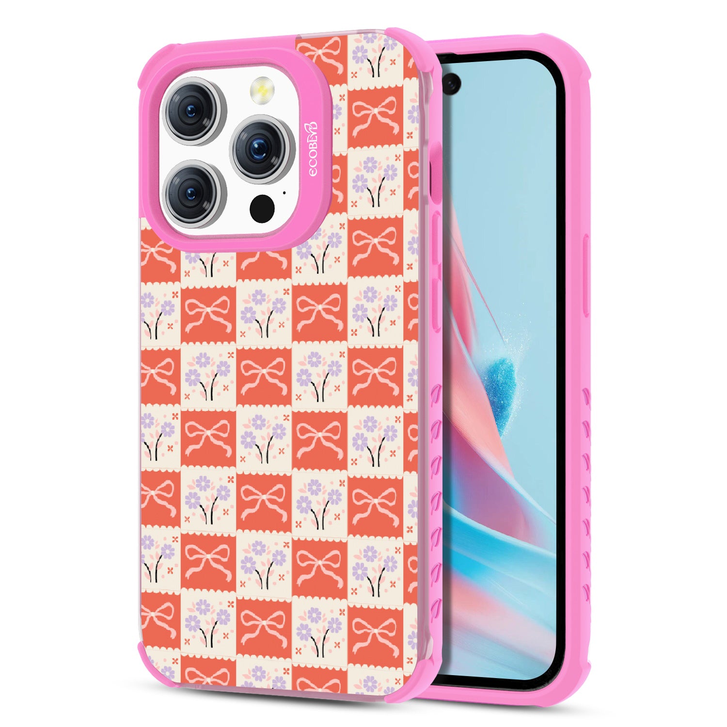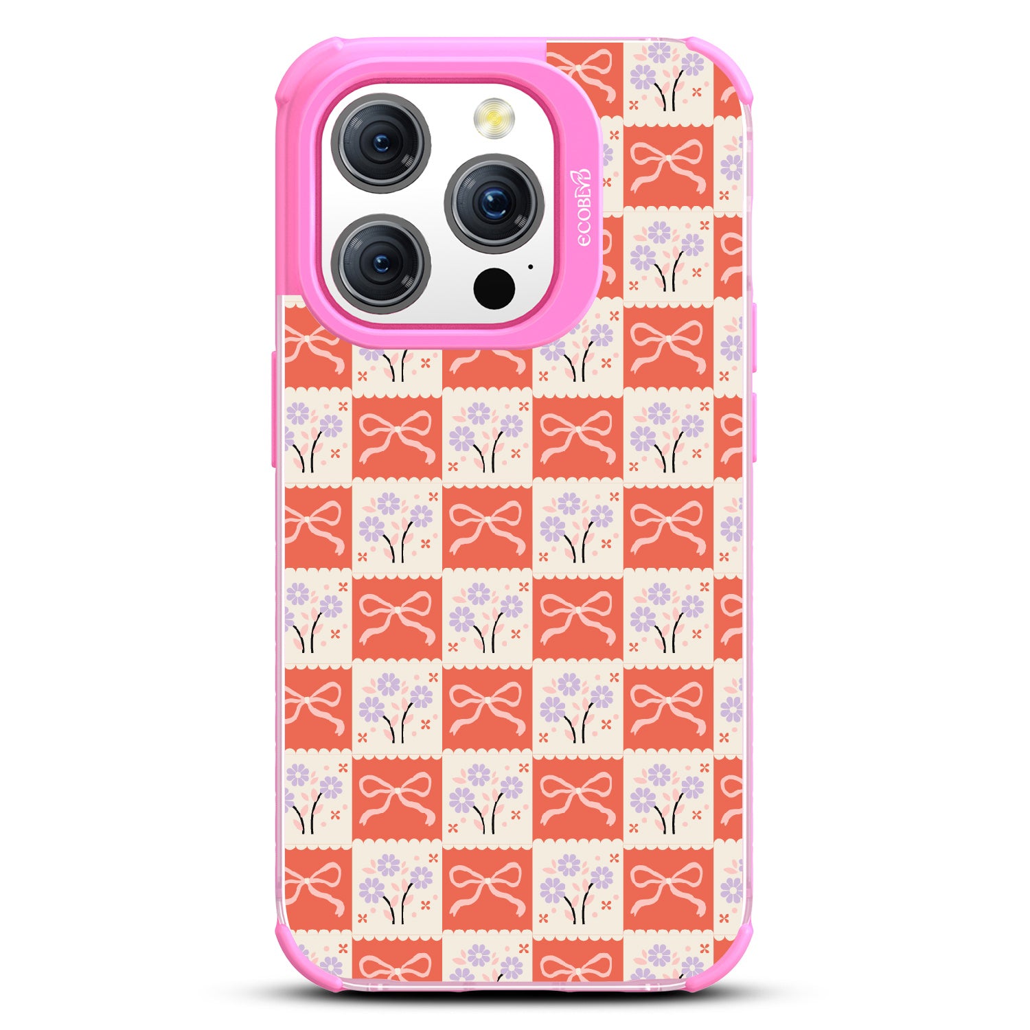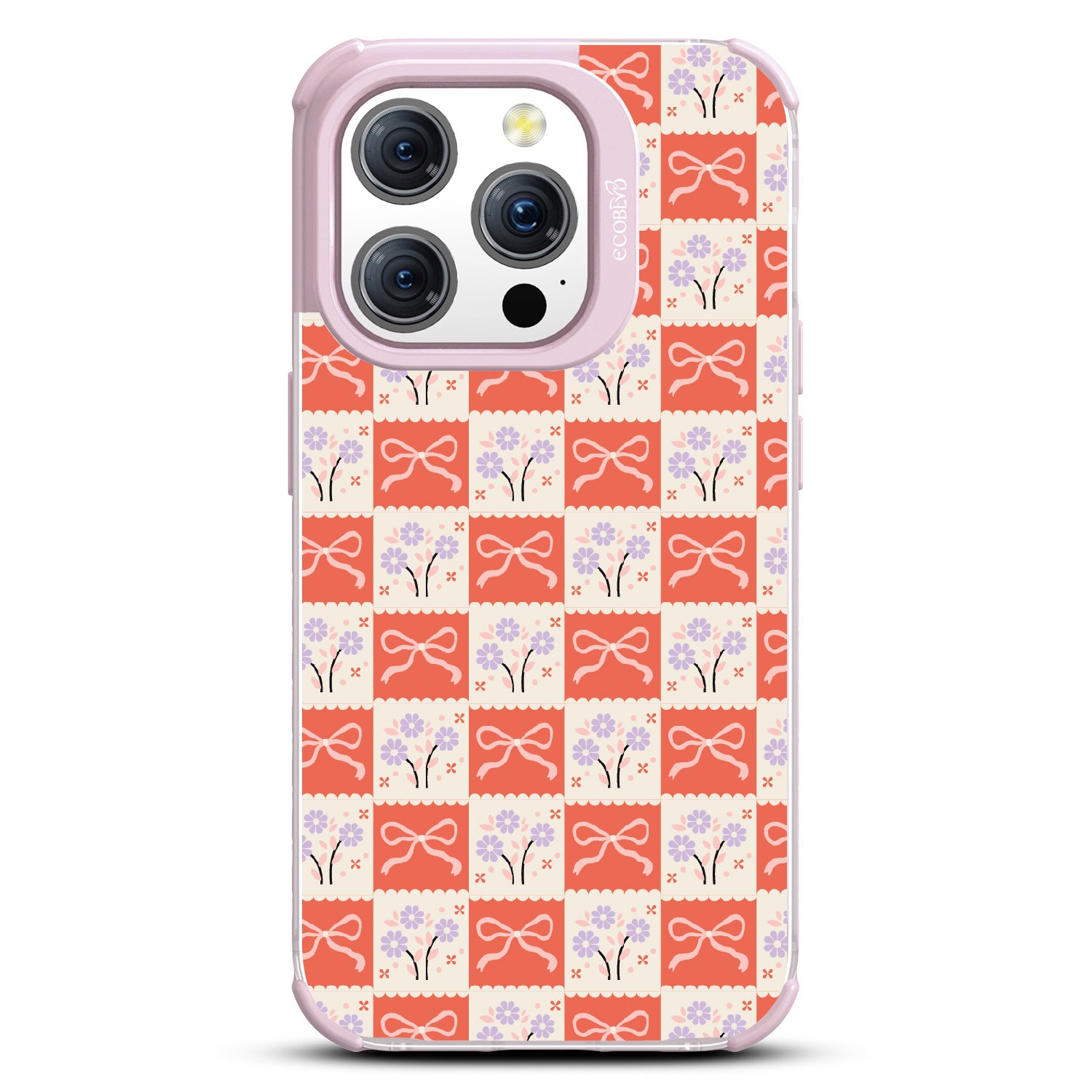 iPhone 15 Pro phone case, featuring a playful mix of stamps with pink bows and purple flowers, evoking the sweet anticipation of receiving a letter. Each stamp-like detail adds a touch of feminine flair, turning your phone into a delightful coquette parcel. Let your phone be the prettiest package in the room.