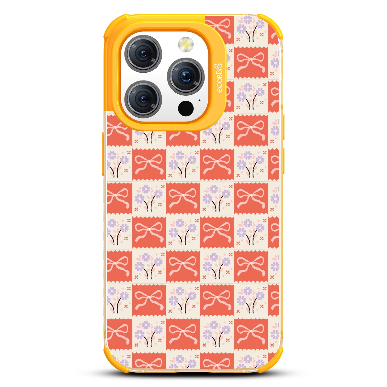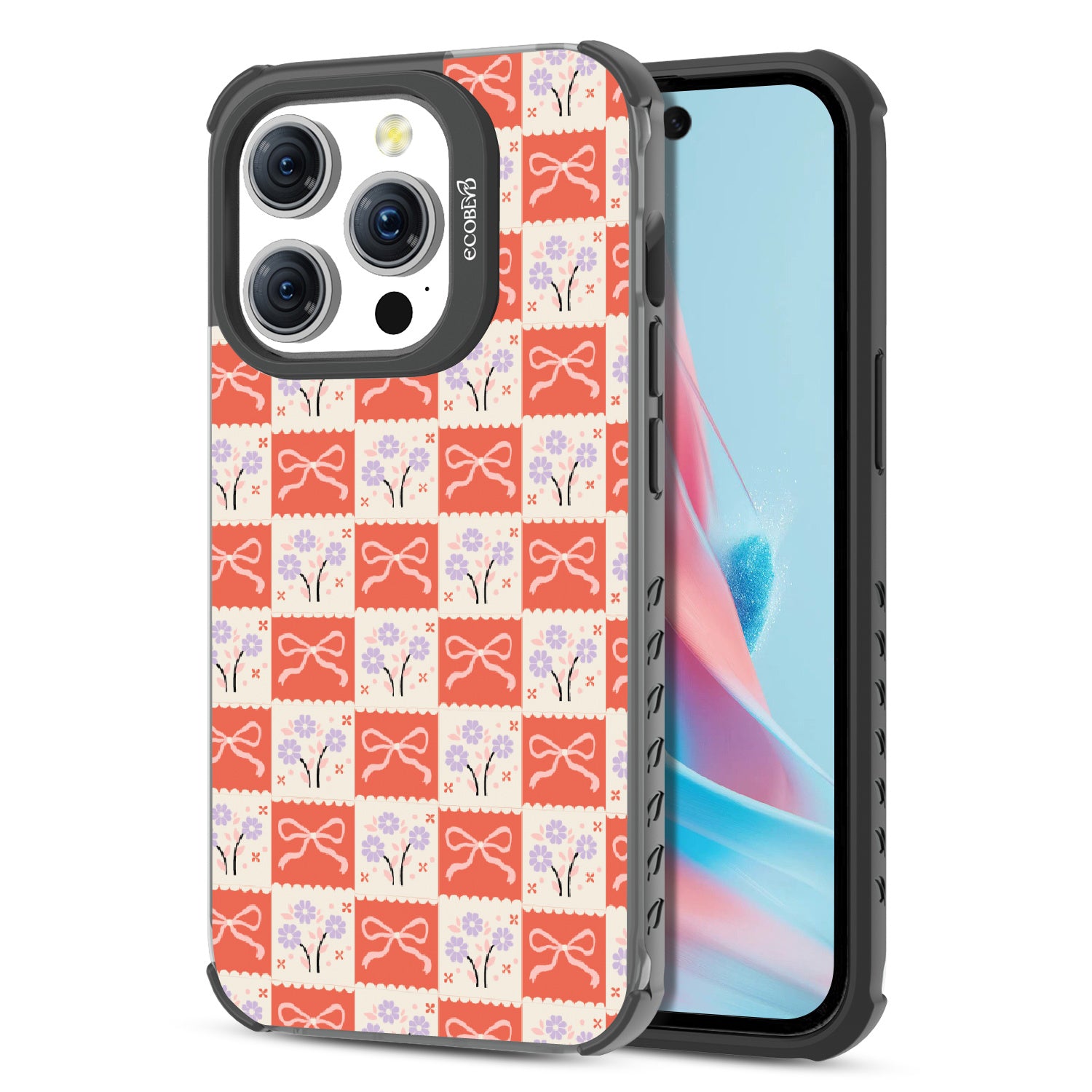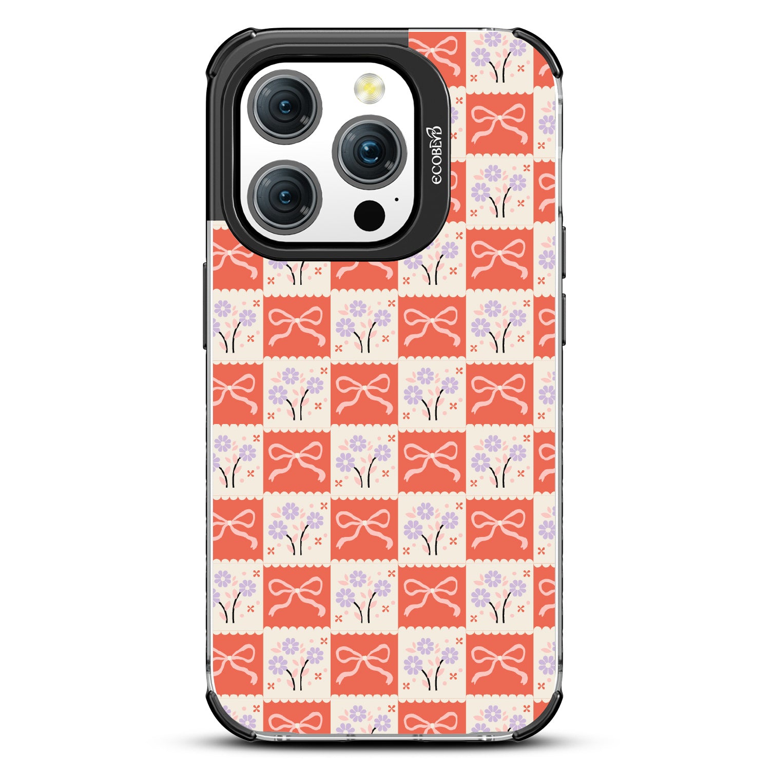 iPhone 15 Pro phone case, featuring a playful mix of stamps with pink bows and purple flowers, evoking the sweet anticipation of receiving a letter. Each stamp-like detail adds a touch of feminine flair, turning your phone into a delightful coquette parcel. Let your phone be the prettiest package in the room.