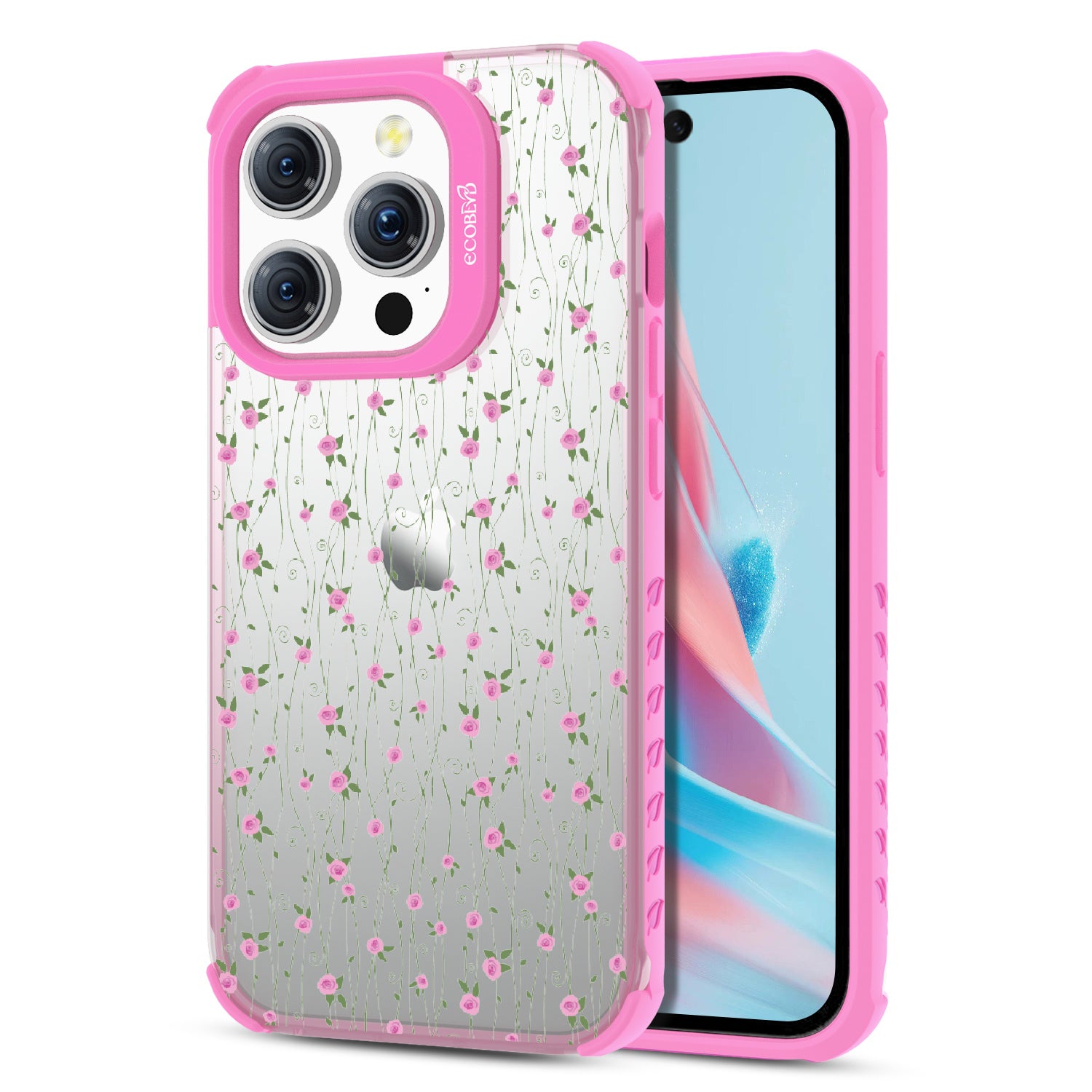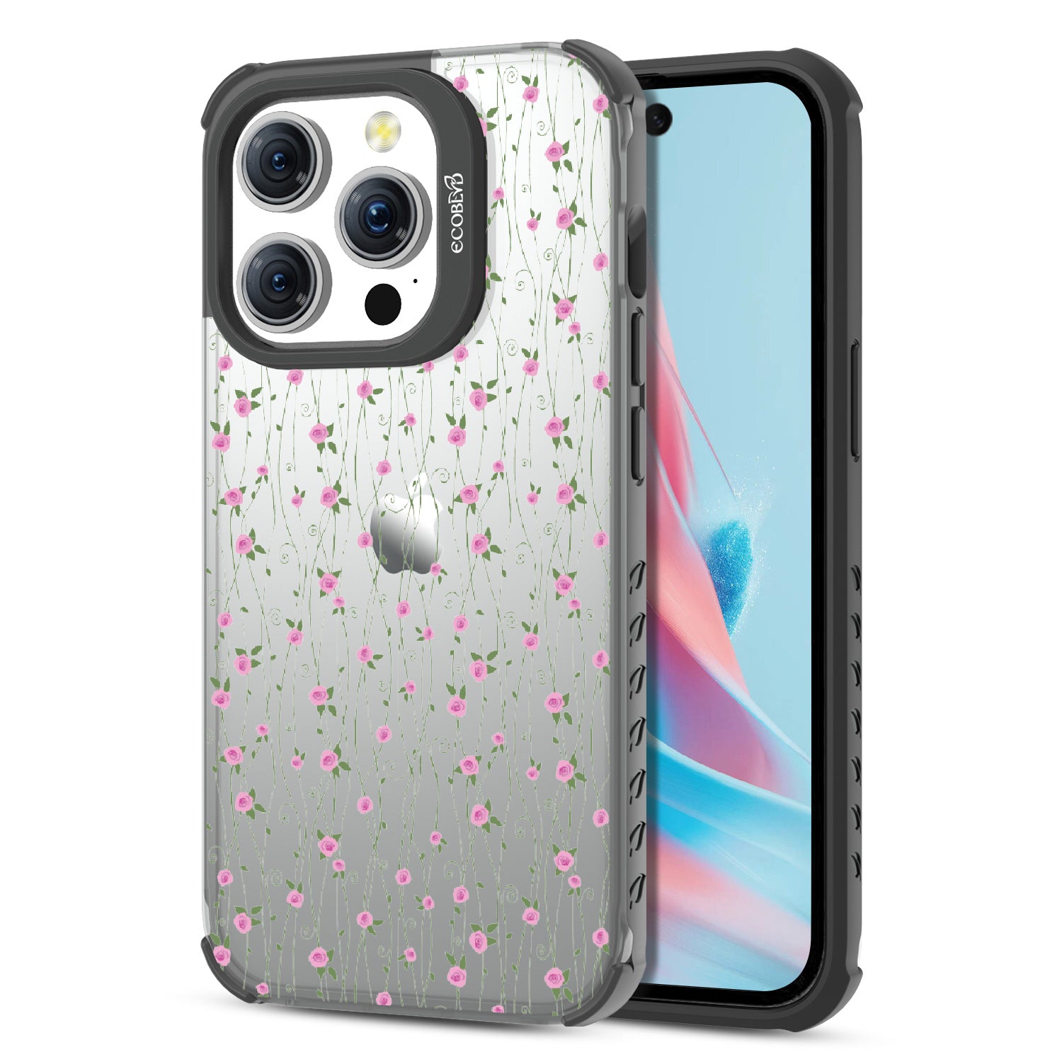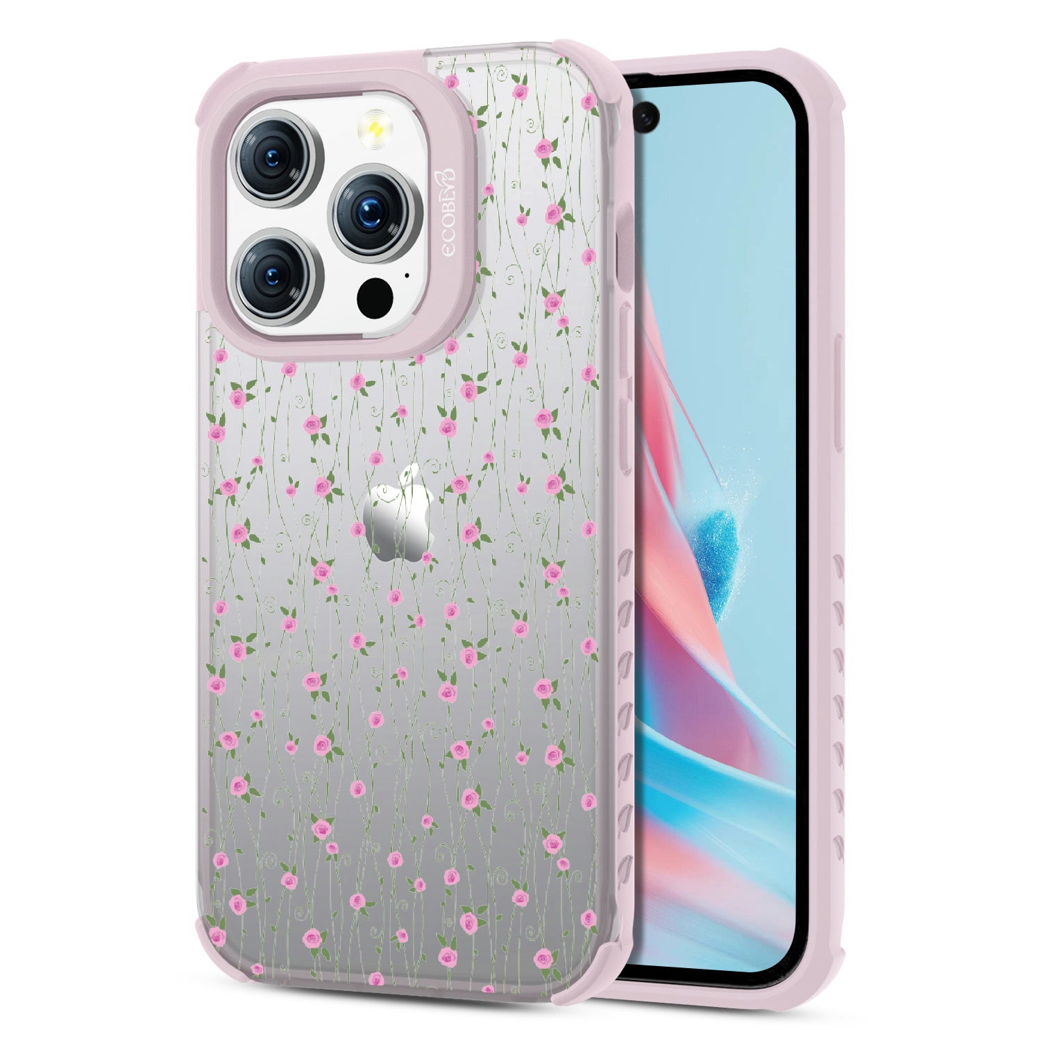 Let the Tangled design on our Laguna clear iPhone 15 Pro case inspire your journey of growth and connection, where pink flowers and vines illustrate the beauty of life's intertwining paths. This design, infused with the vibrant energy of spring, showcases intricate vines and delicate pink flowers as symbols of growth and resilience, painting a picture of natural harmony and flourishing.