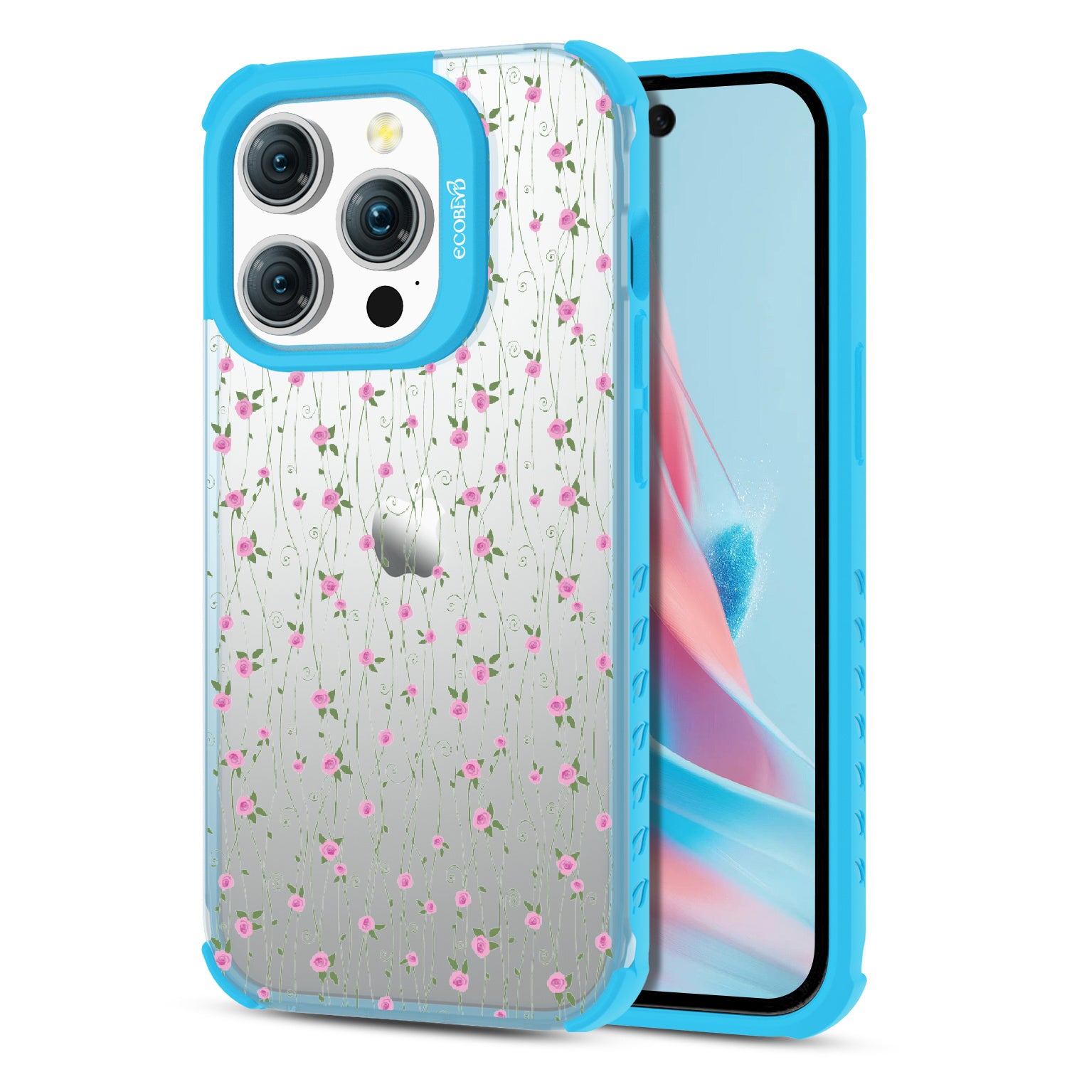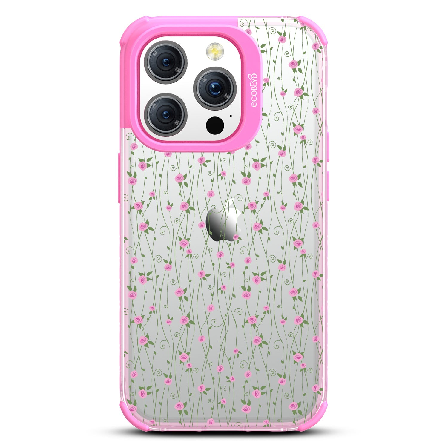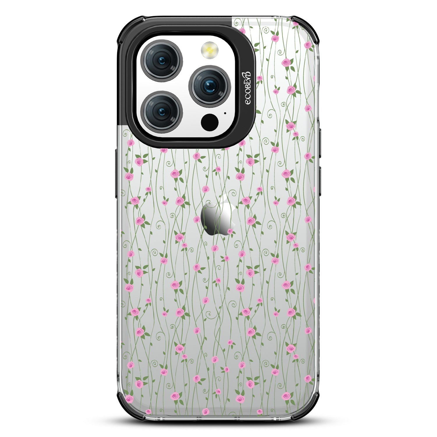 Let the Tangled design on our Laguna clear iPhone 15 Pro case inspire your journey of growth and connection, where pink flowers and vines illustrate the beauty of life's intertwining paths. This design, infused with the vibrant energy of spring, showcases intricate vines and delicate pink flowers as symbols of growth and resilience, painting a picture of natural harmony and flourishing.