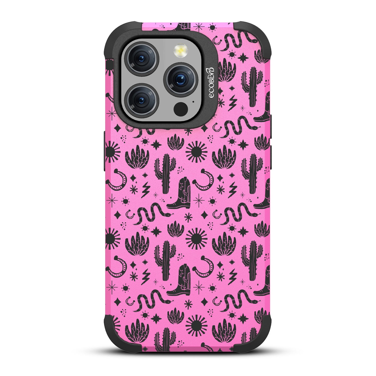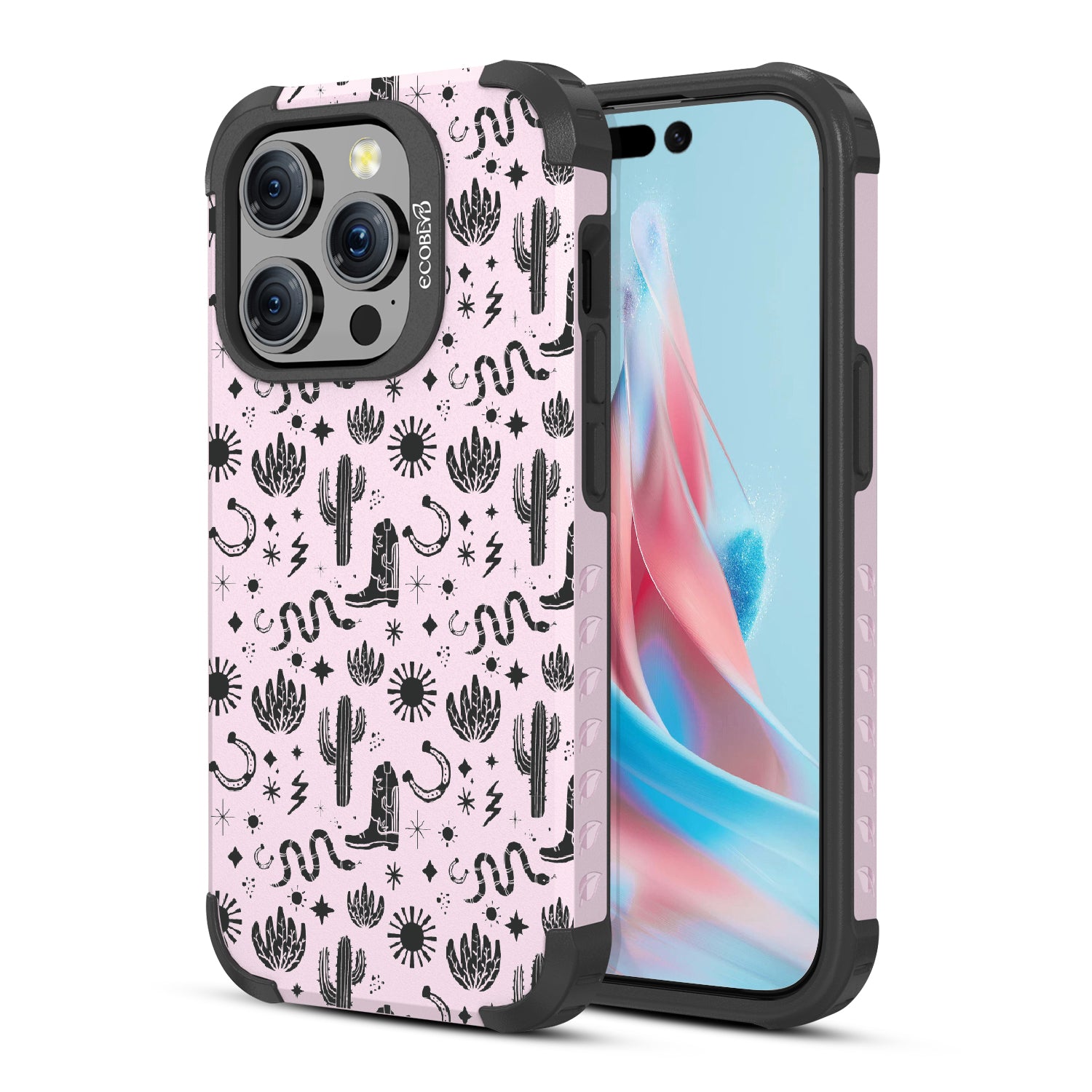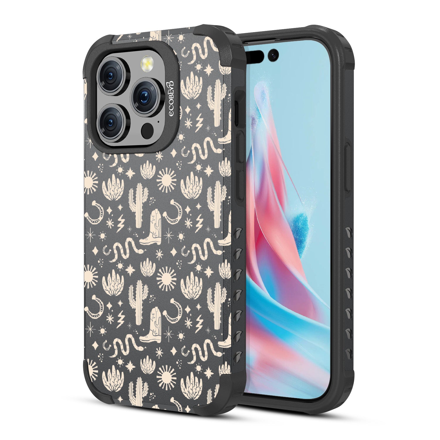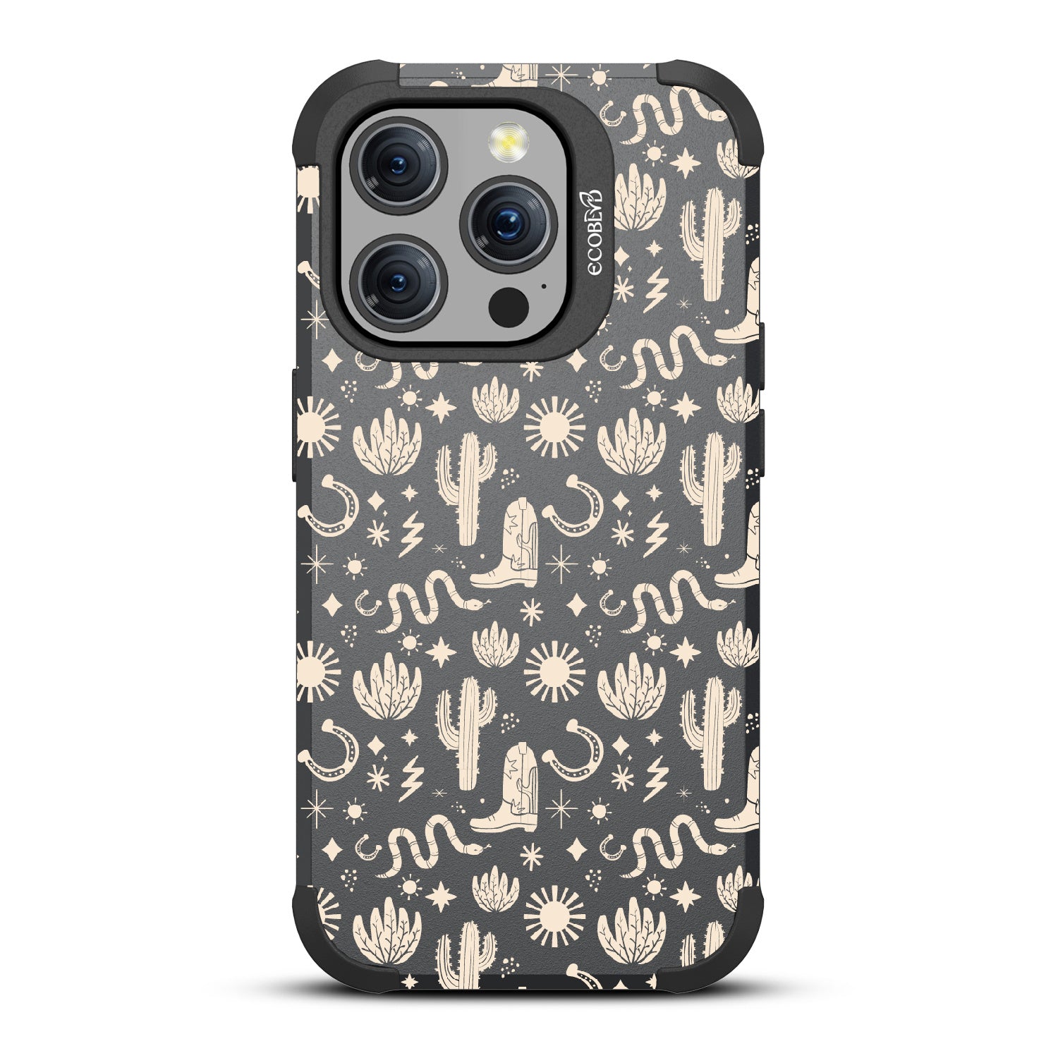 Saddle up your phone with the Mojave Collection's exclusive Wild West design on our rugged and compostable iPhone 15 Pro case, where cacti, cowboy boots, horseshoes, suns, and lightning bolts join forces for a rodeo of rugged charm. Wrangle your protection with Western flair and take on the untamed spirit on every call and adventure. Yee-haw to desert dreams and the Wild West case, where rugged allure meets playful charm for your phone's wild frontiers!