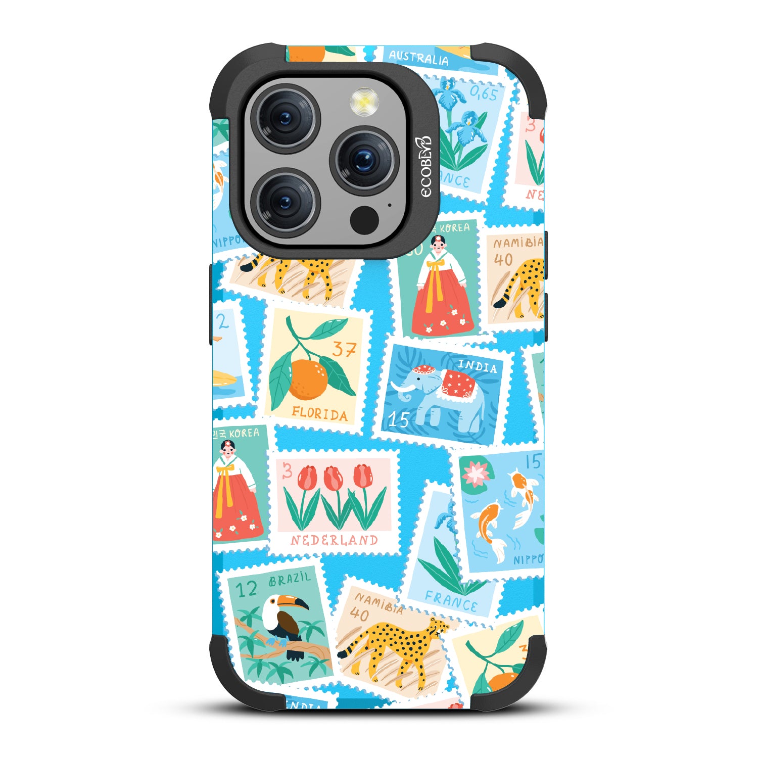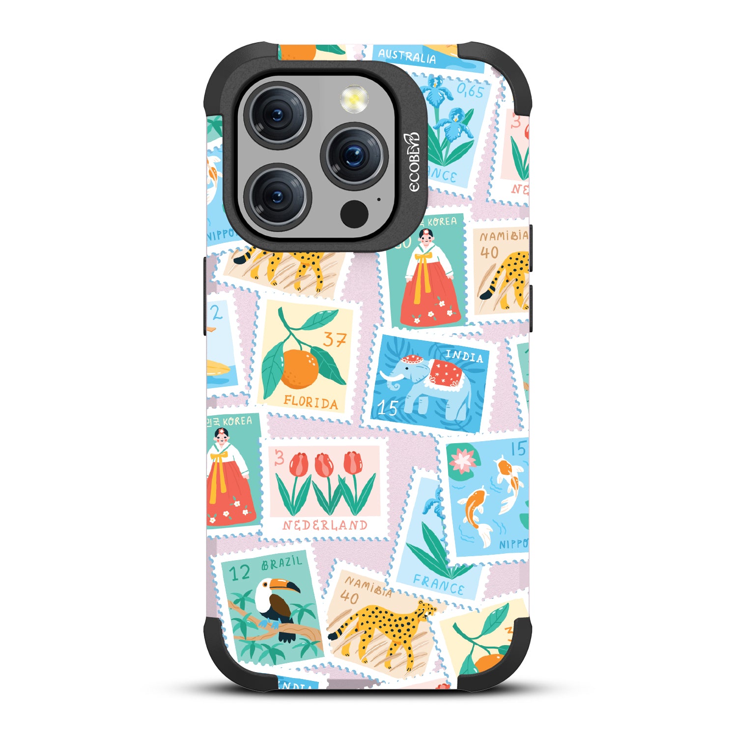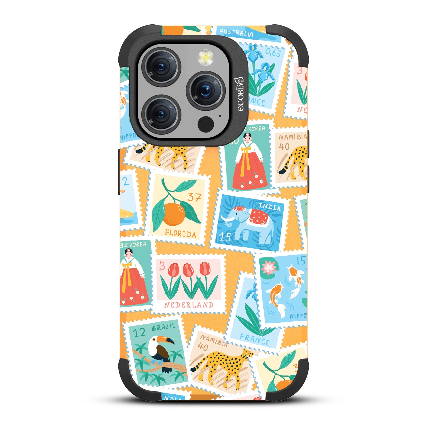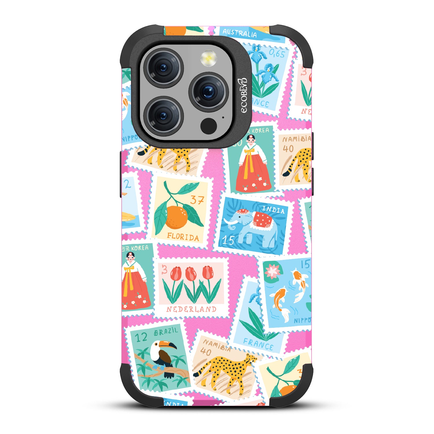 Collect a world of memories with the Wish You Were Here design on our Mojave rugged iPhone 15 Pro MagSafe case, a patchwork of postcard-perfect stamps from Florida to France. Each stamp is a window into a new world, an invitation to gather stories from far and wide. Decorate your phone with this mosaic of travel logs, and let it be a colorful collage of all the places that whisper, 'Wish you were here.'