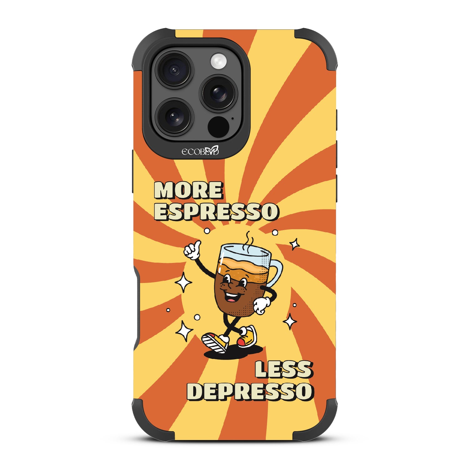 "More espresso, less depresso”—it’s that simple. A cheerful coffee mug and your new daily mantra bring good vibes to life with this playful design on our Reforge rugged iPhone 16 Pro Max case. Brew positivity and energy into every moment with a look that’s as bold as your first cup.