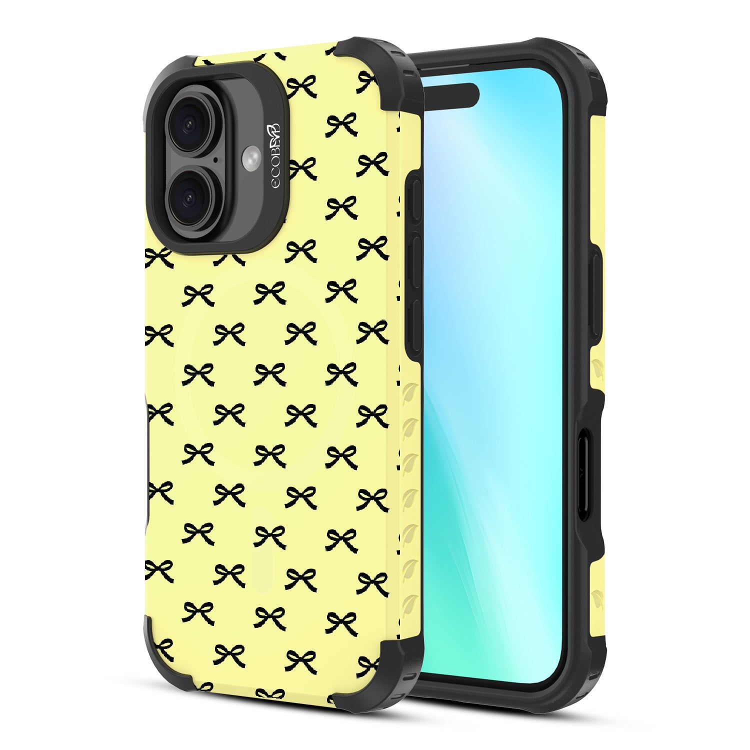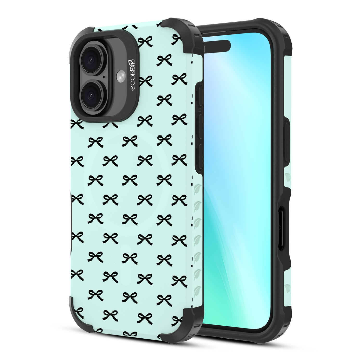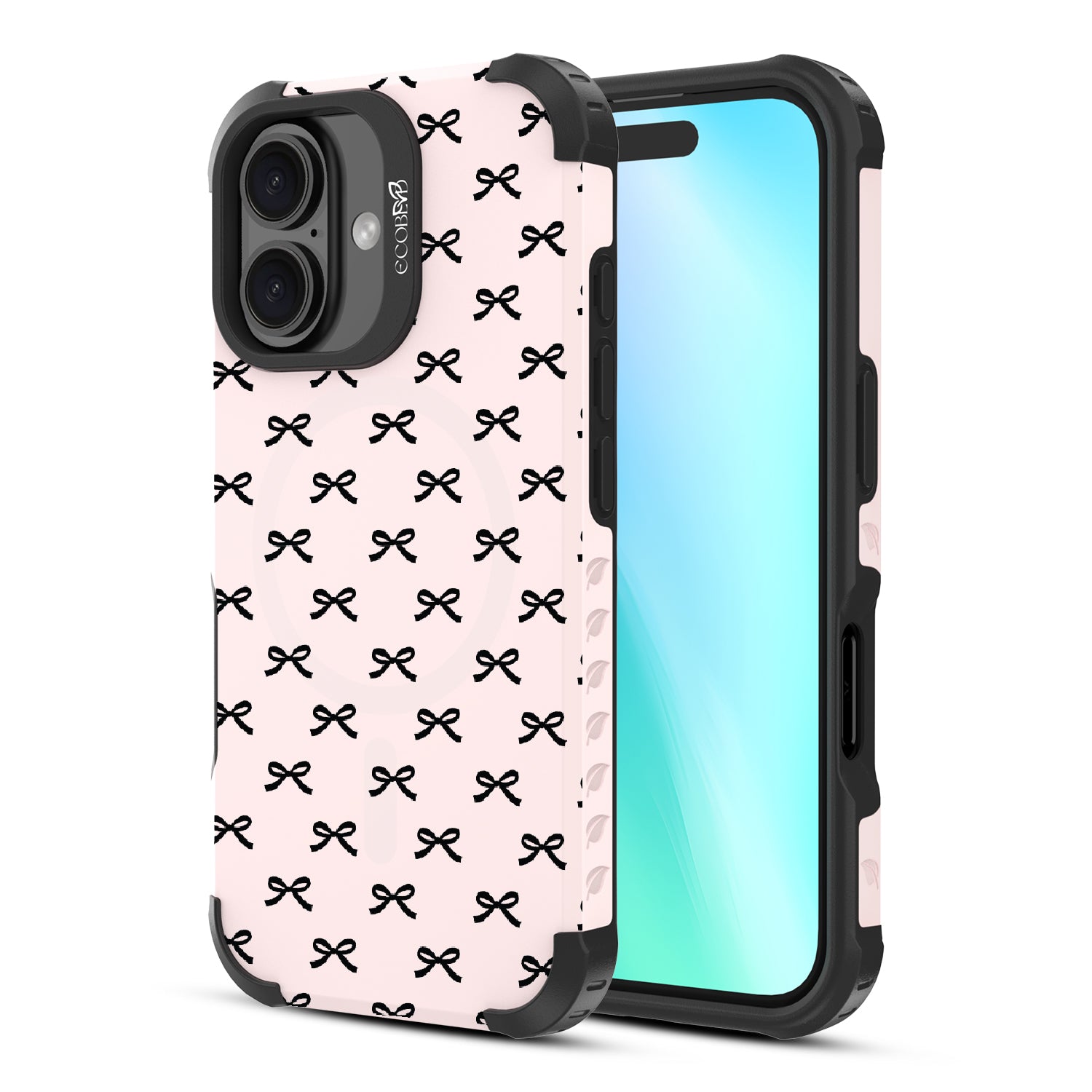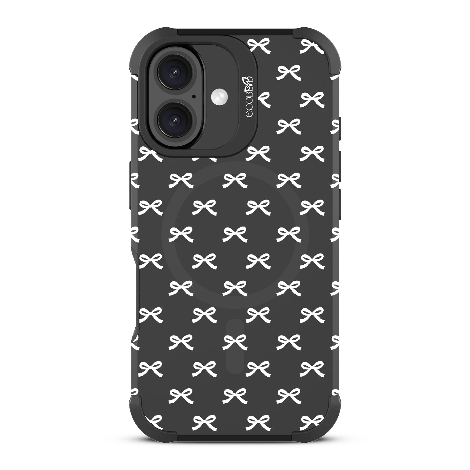 Get all dressed up to adorn and adore with the Coquette design on our Reforge rugged iPhone 16 case Let the cute black bows be the stars of the show, gracing your phone with their dainty presence. As you hold your device, you'll feel the subtle embrace of everlasting bonds formed by each dainty knot, creating a sense of feminine connection and girlhood that goes beyond mere aesthetics.