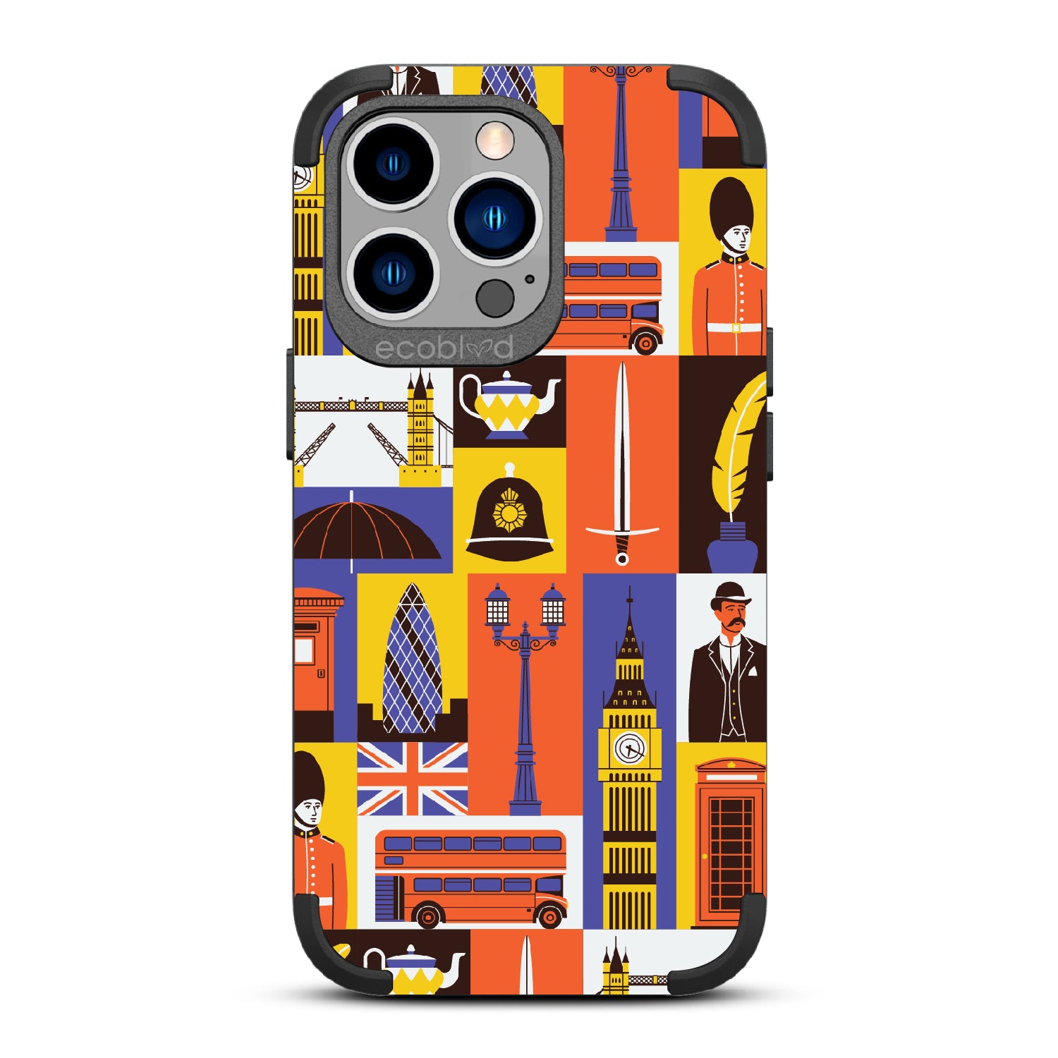 Climb onto the top deck of your own tour bus with the London Town design on our Mojave rugged iPhone 12 Pro Max phone case & iPhone 13 Pro Max phone case, where every box offers a new sight to be seen. From the grand silhouette of Big Ben to the solemn beauty of the Royal Guards, and the quaint charm of the traditional red telephone box, this design is your all-access pass to the city’s most storied landmarks.