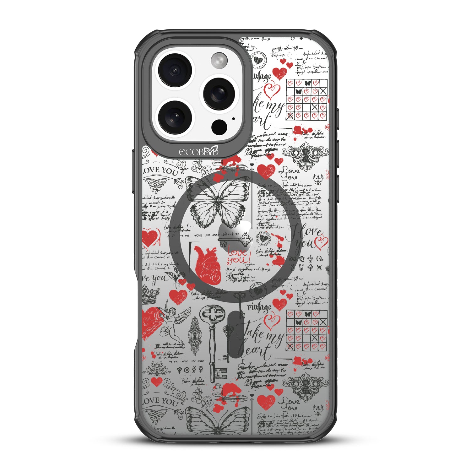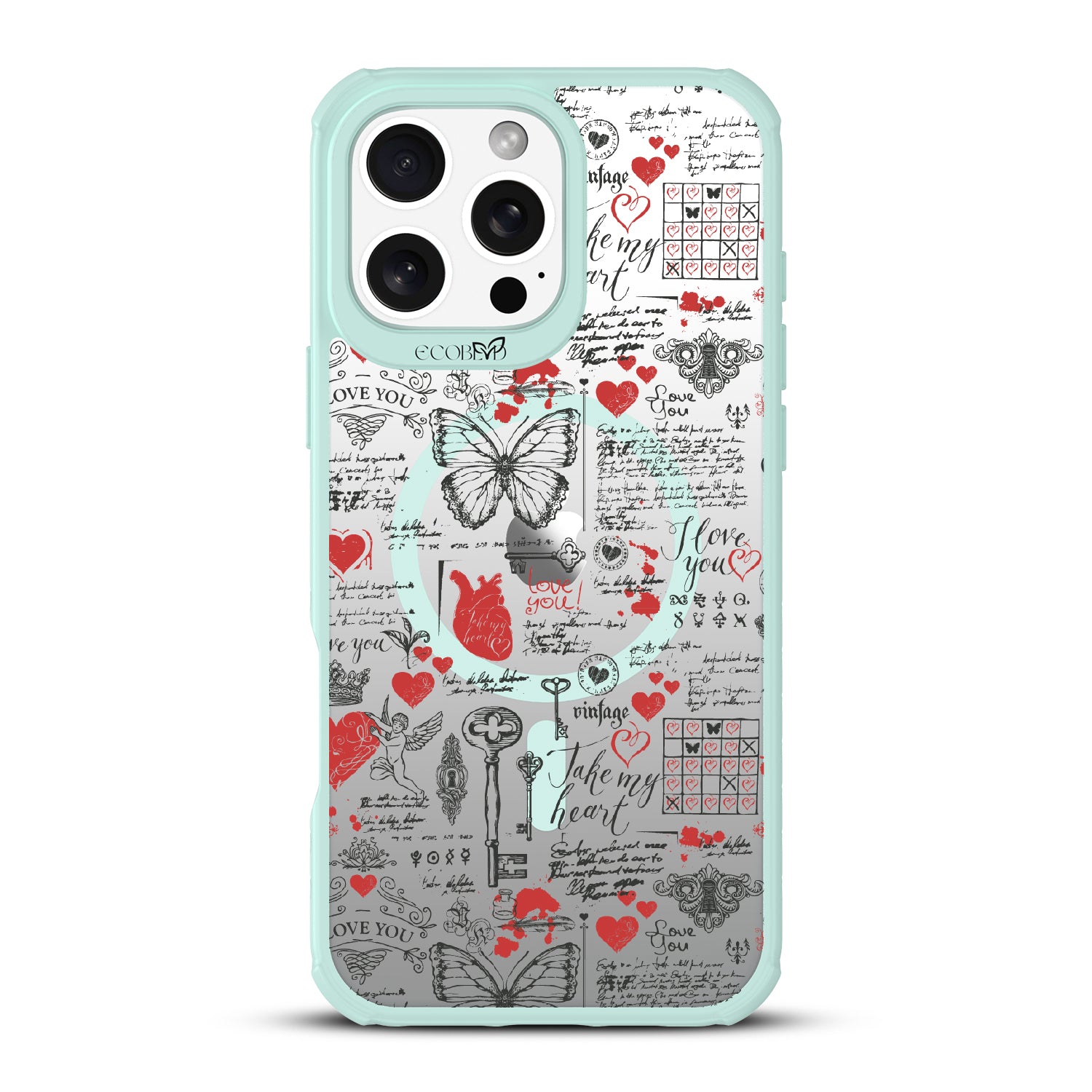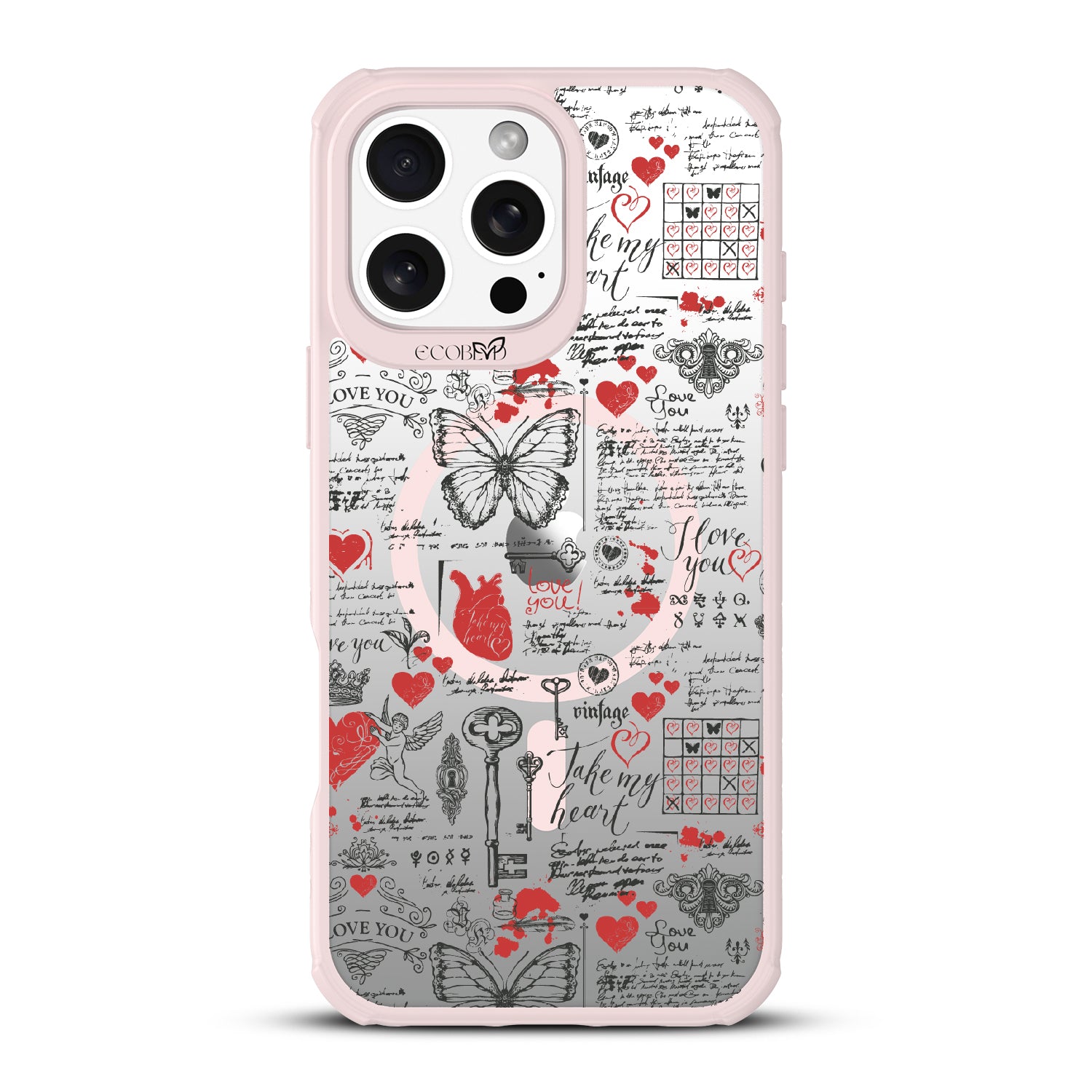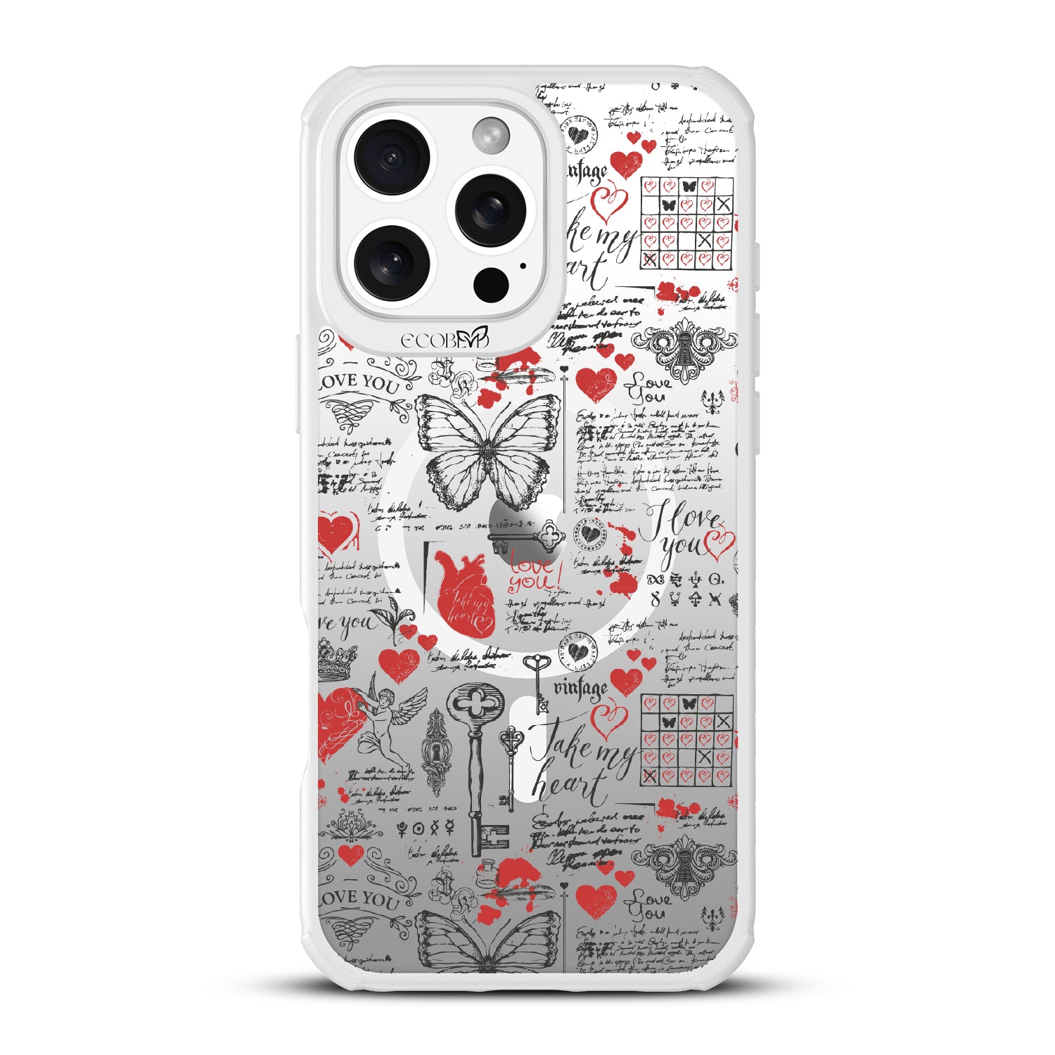 Write your emotions with the Love Notes design on our Revive clear iPhone 16 Pro Max phone case. This cute scrapbook-style collage, featuring vintage stamps capturing cupid, hearts, butterflies, and phrases like "take my heart" and "I love you," encourages you to express your feelings through written expressions, turning your phone into a cherished collection of love notes.