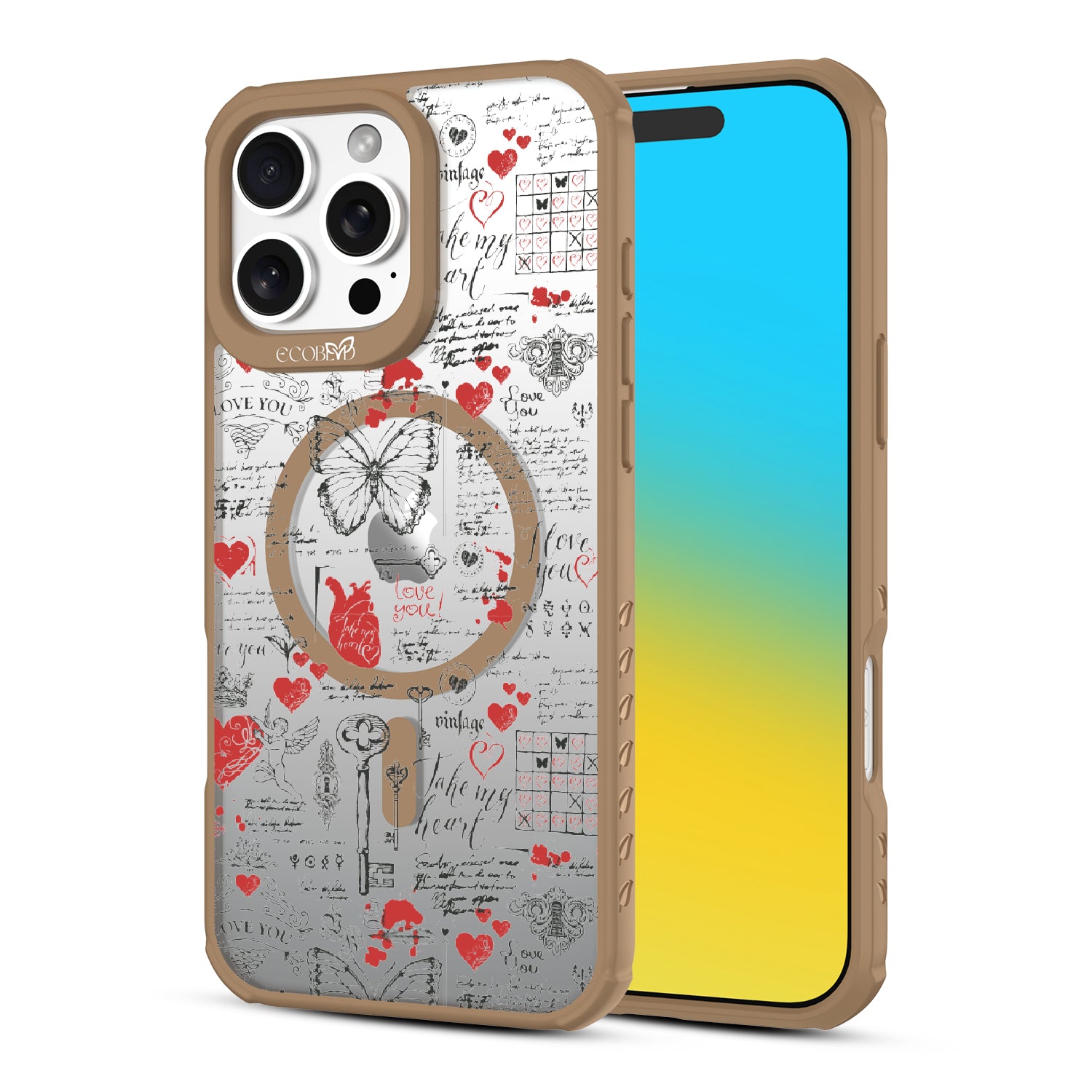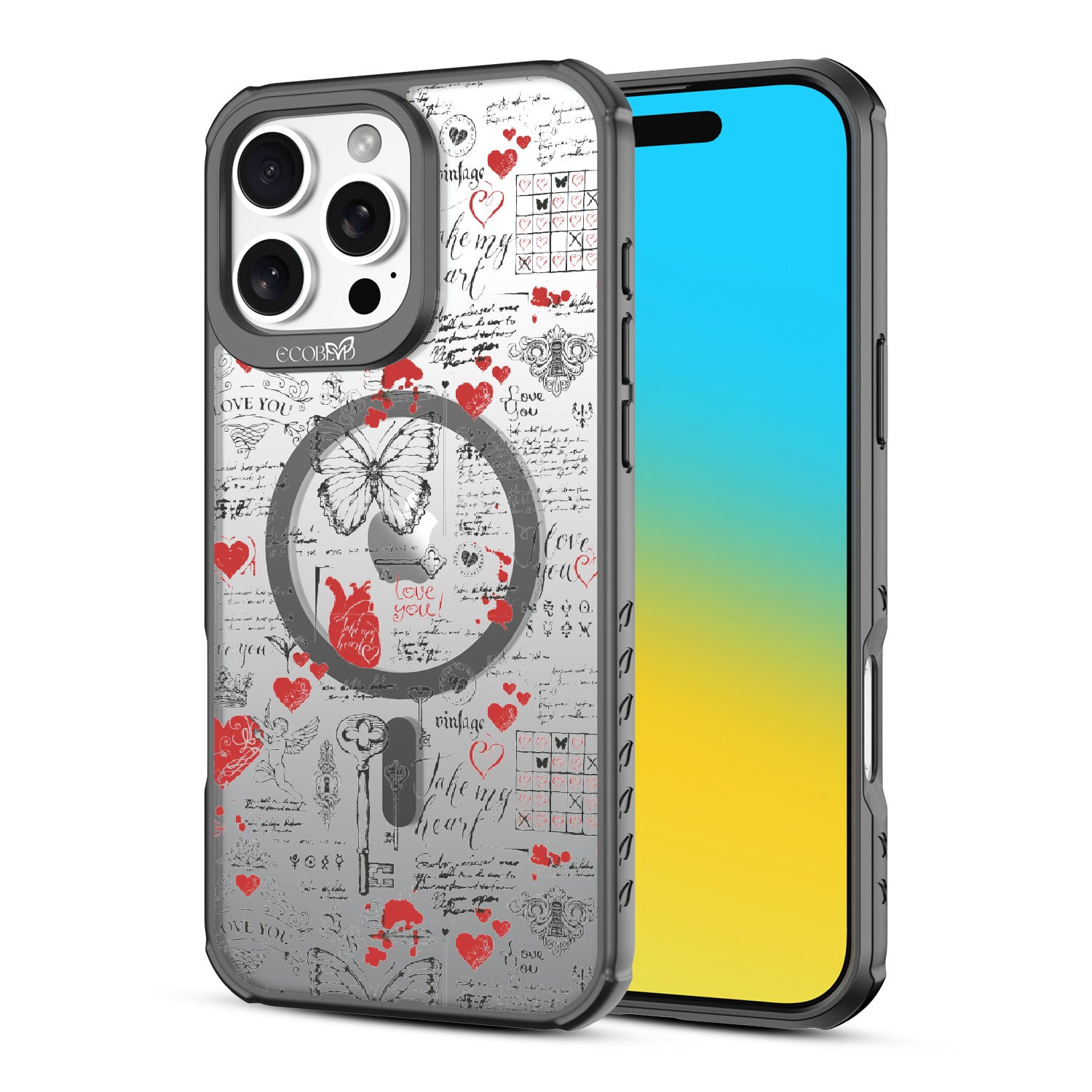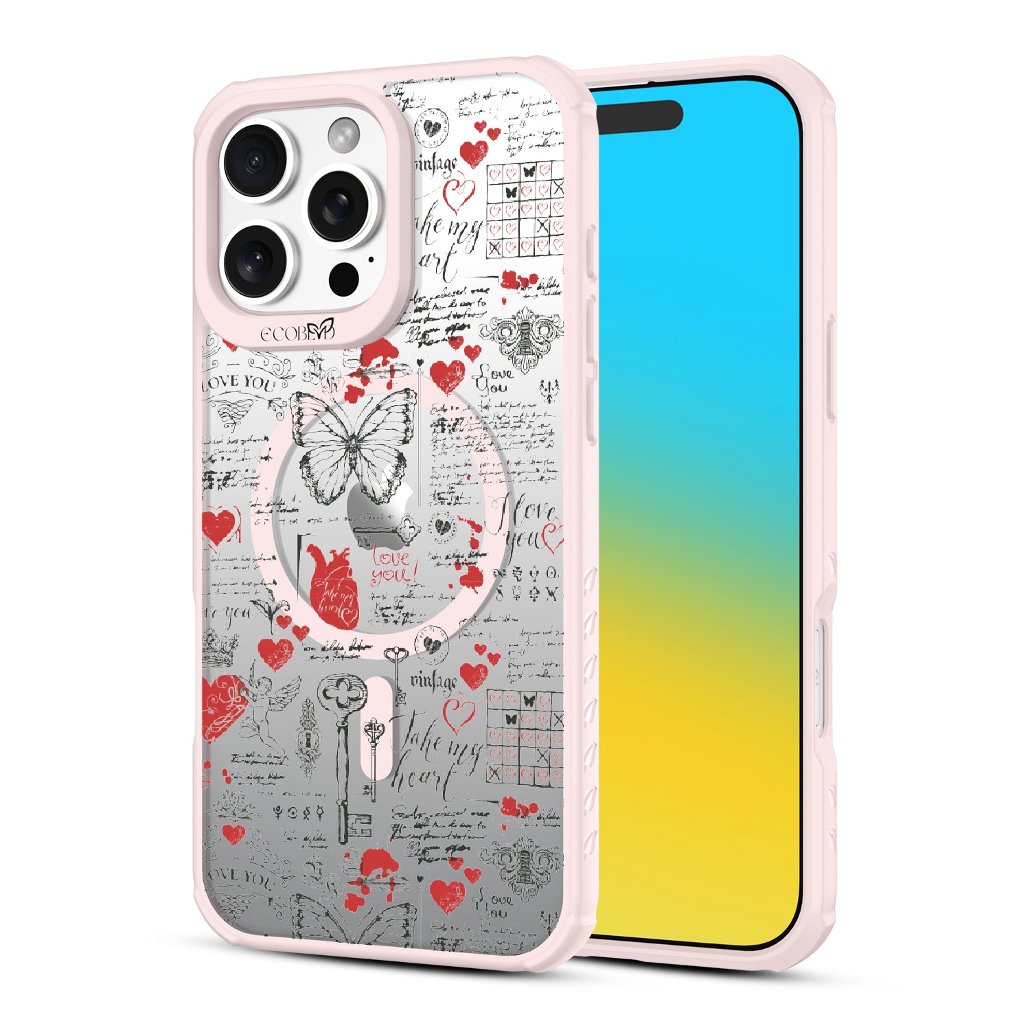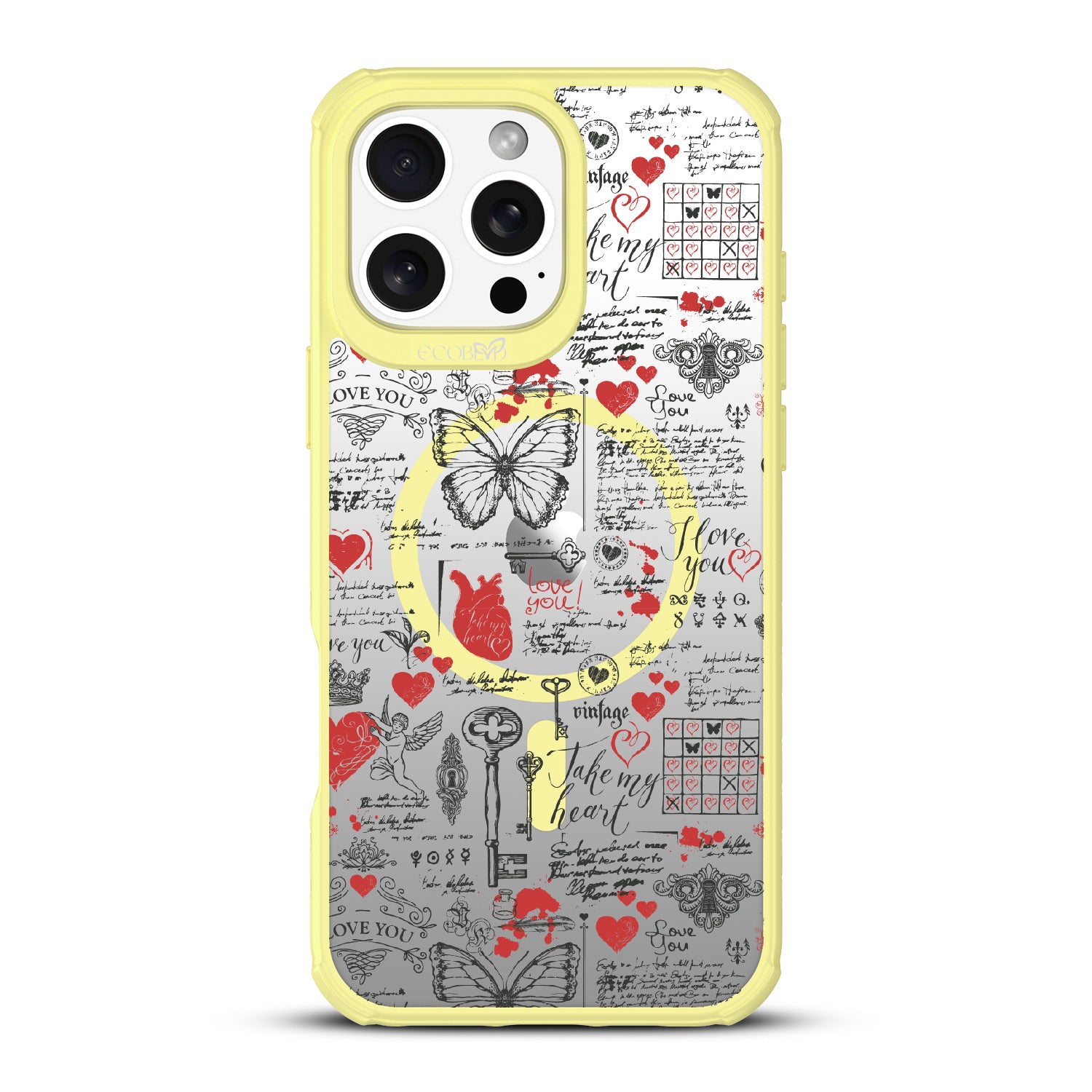 Write your emotions with the Love Notes design on our Revive clear iPhone 16 Pro Max phone case. This cute scrapbook-style collage, featuring vintage stamps capturing cupid, hearts, butterflies, and phrases like "take my heart" and "I love you," encourages you to express your feelings through written expressions, turning your phone into a cherished collection of love notes.