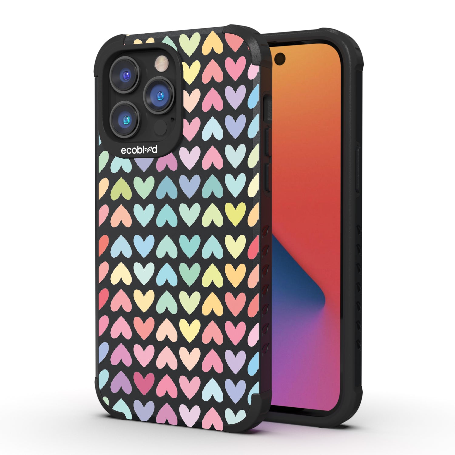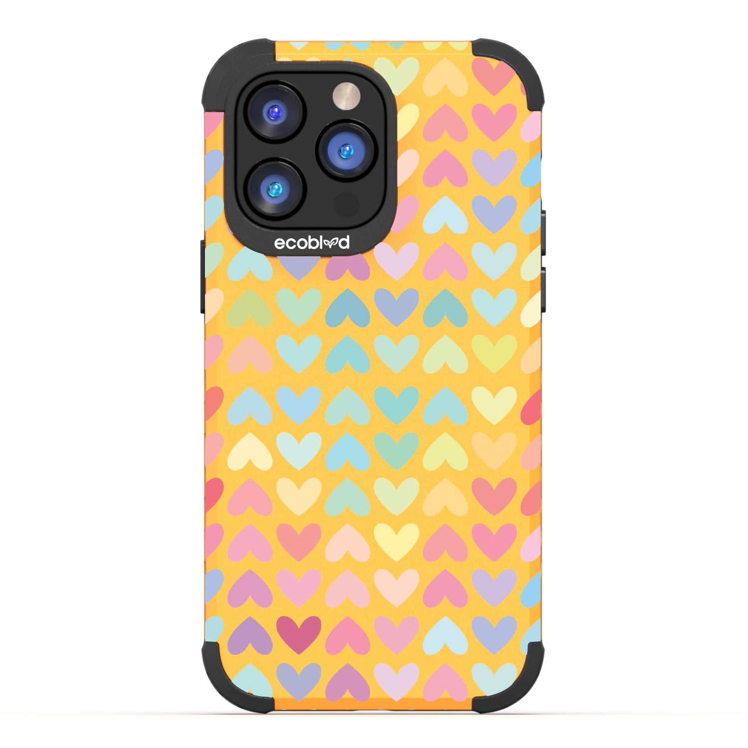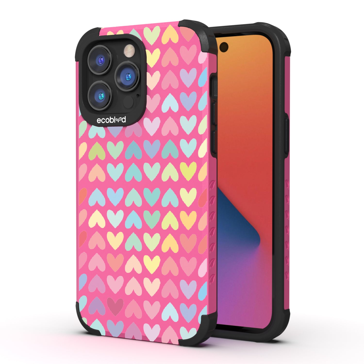 Let your phone and style spread love and equality with the rainbow hearts of the Love Is Love design on our Mojave rugged and compostable iPhone 14 Pro phone case. Choose from five vibrant color options: Midnight Black, Cascade Blue, Foliage Green, Illuminating Yellow, and Wildflower Pink.