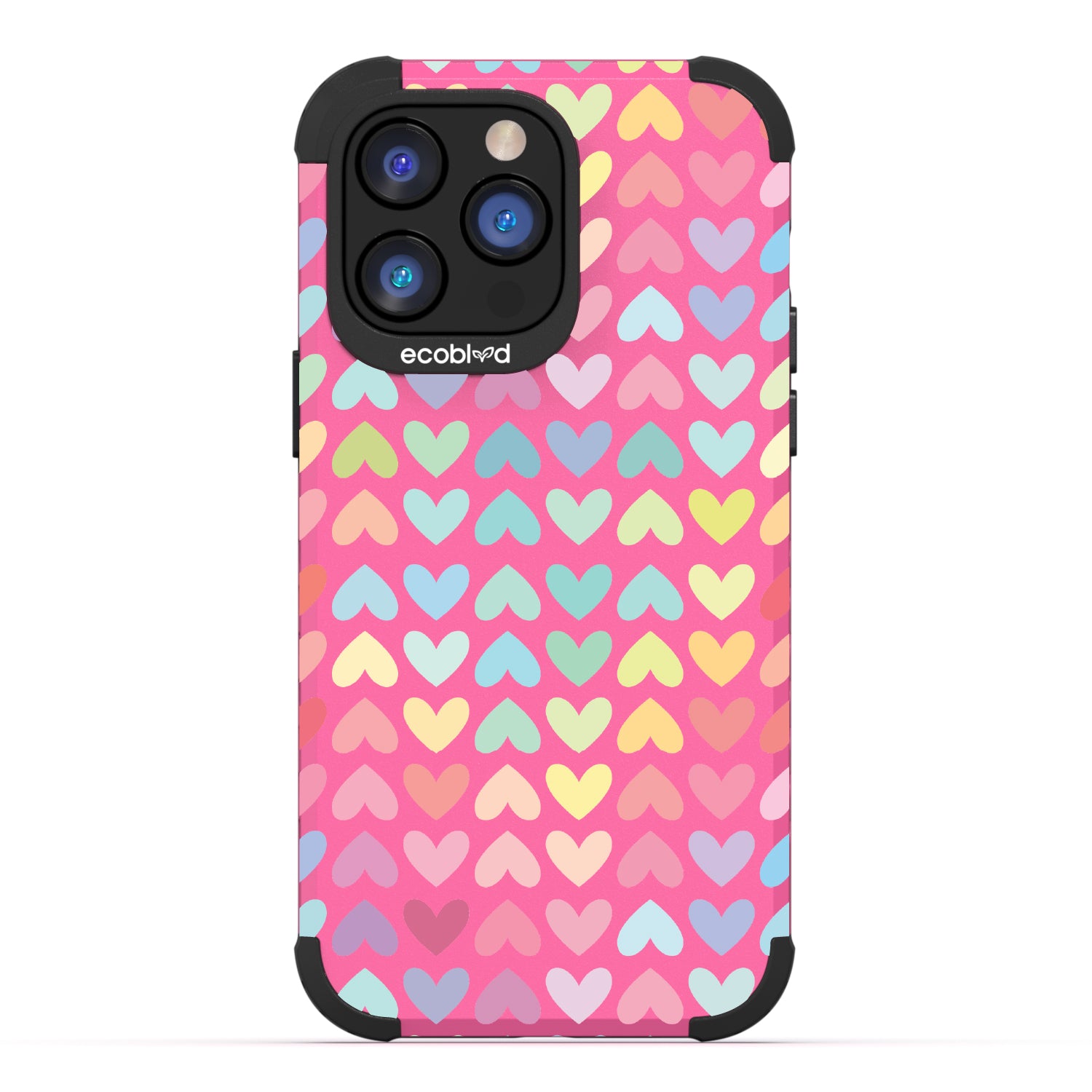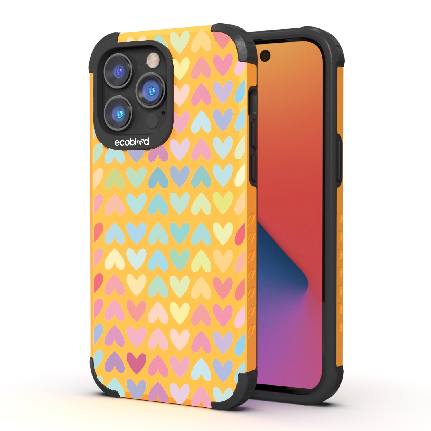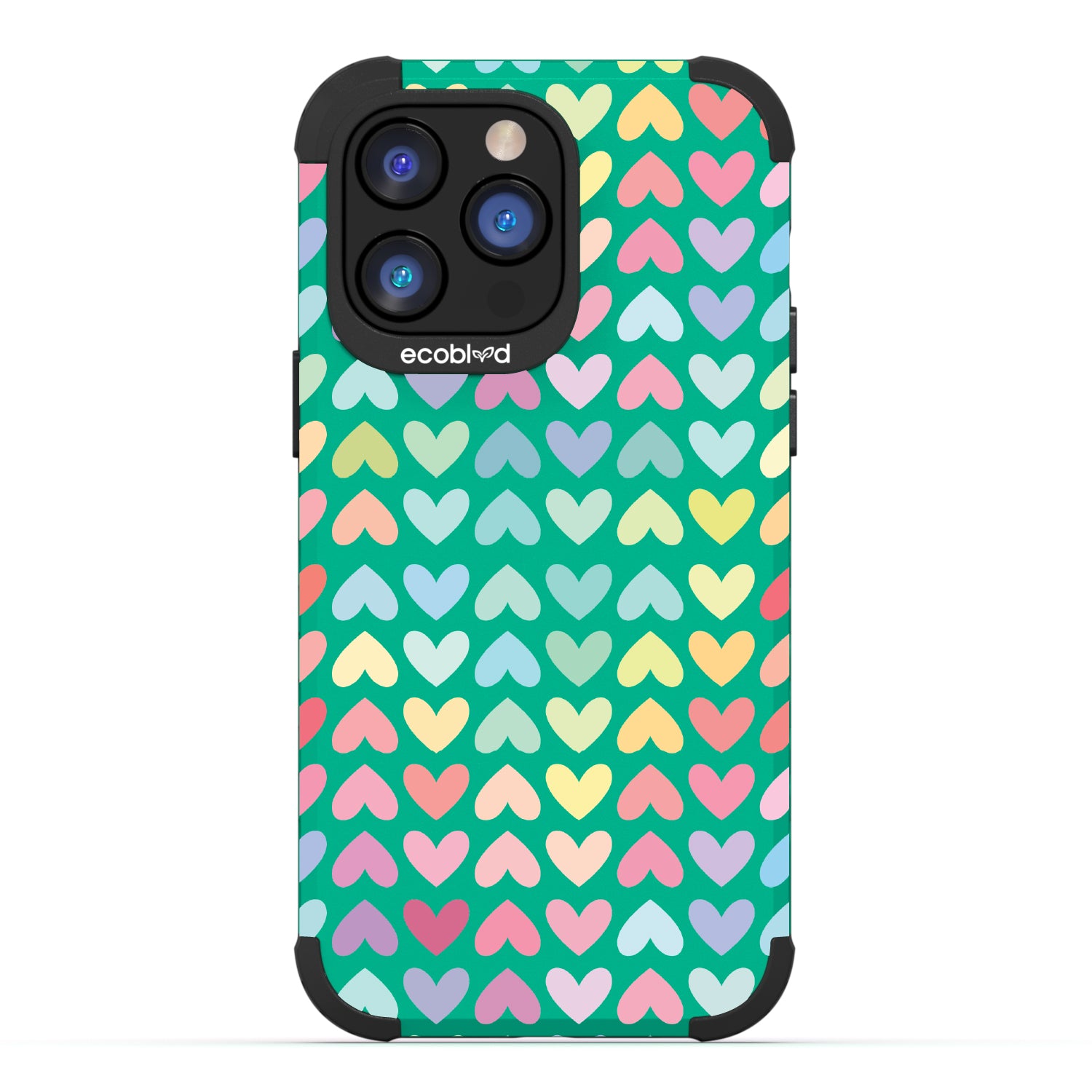 Let your phone and style spread love and equality with the rainbow hearts of the Love Is Love design on our Mojave rugged and compostable iPhone 14 Pro phone case. Choose from five vibrant color options: Midnight Black, Cascade Blue, Foliage Green, Illuminating Yellow, and Wildflower Pink.