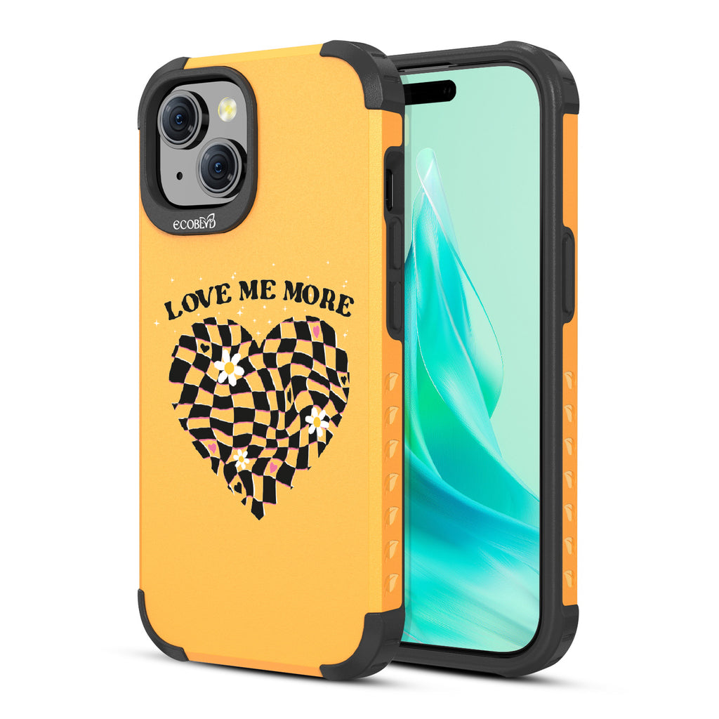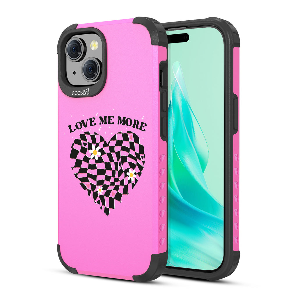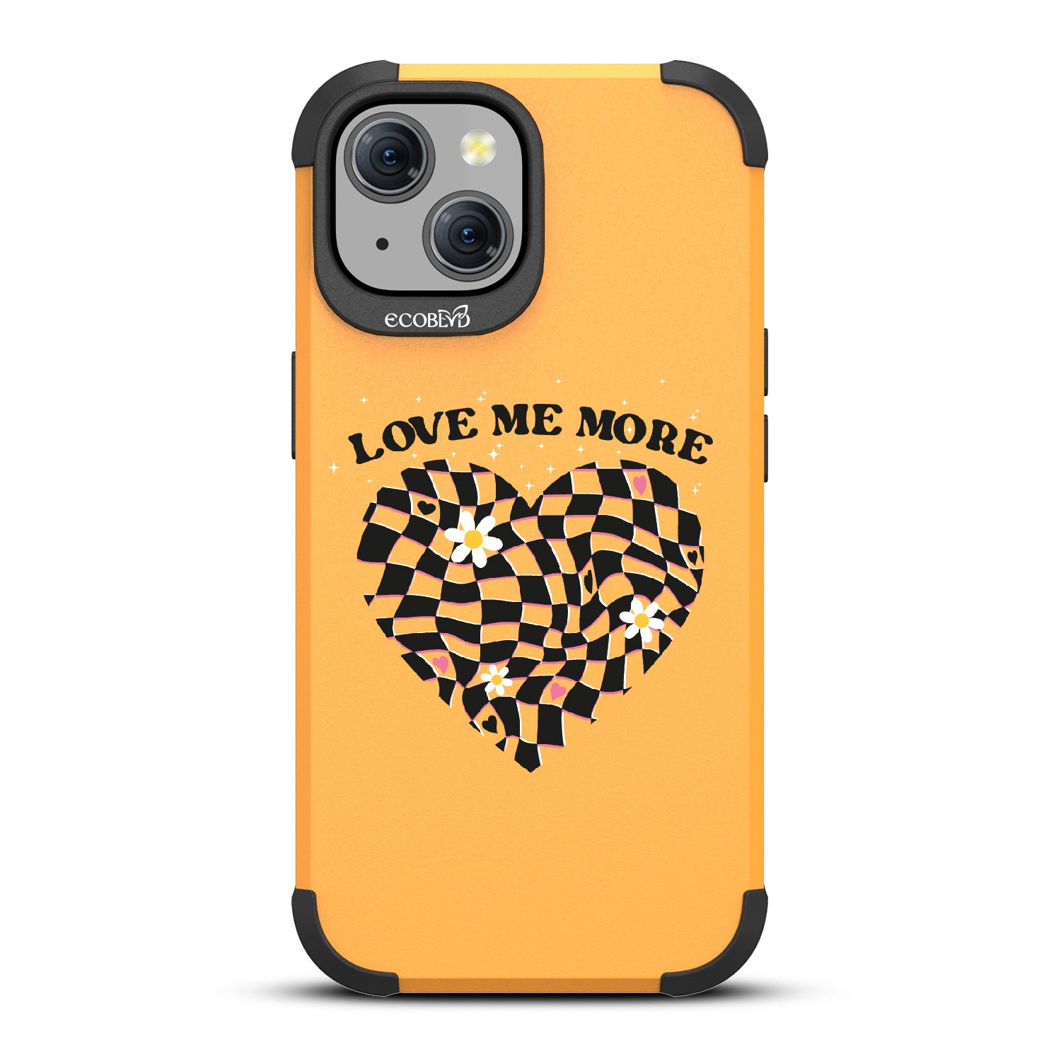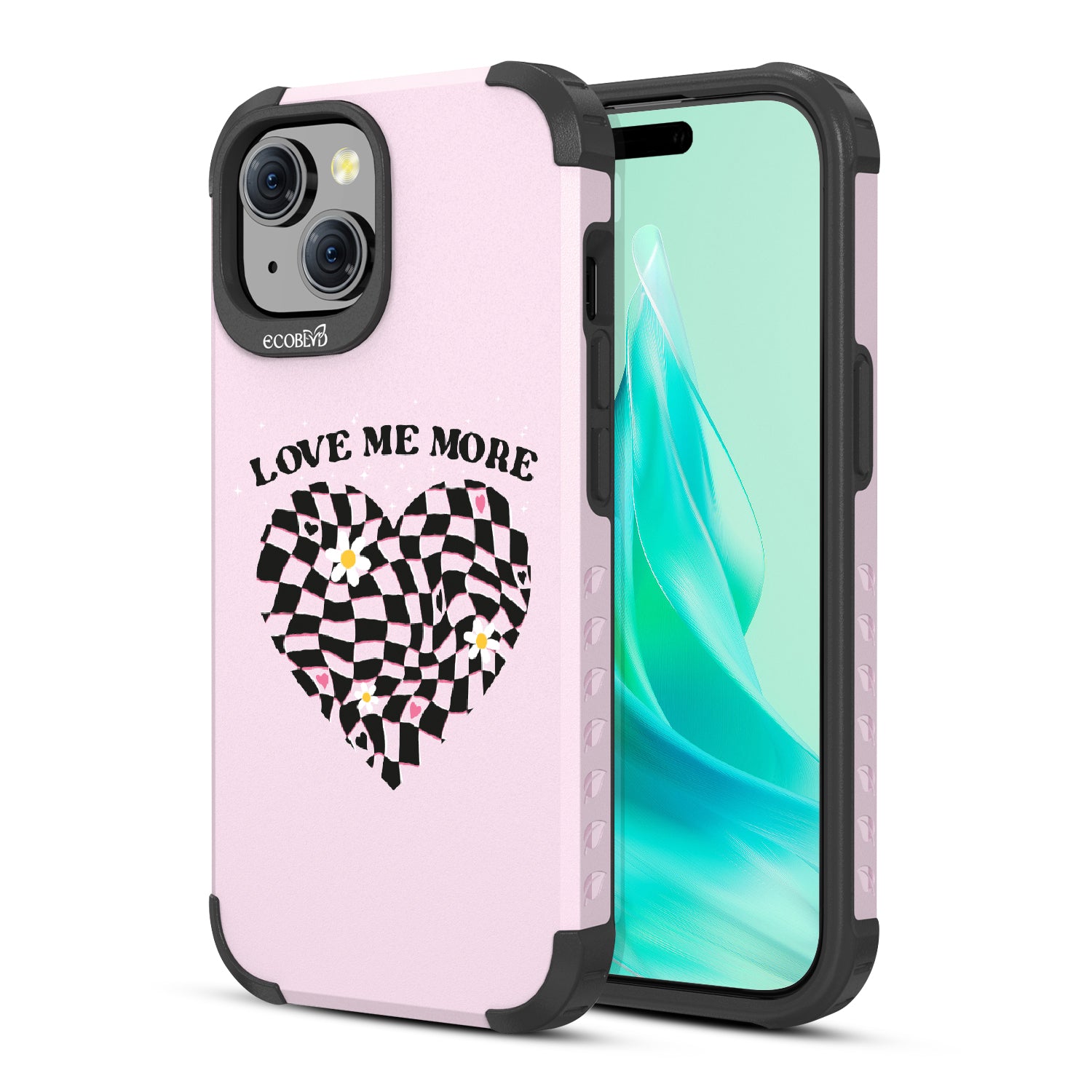 On our Mojave rugged and compostable iPhone 15 MagSafe case, Love Me More intricately portrays the language of desire, with a checkered heart adorned by an intoxicating symphony of blossoms. The patterns speak volumes of yearnings, while the text passionately conveys the plea for more passion, leaving an indelible mark that echoes "Forever in Your Heart."
