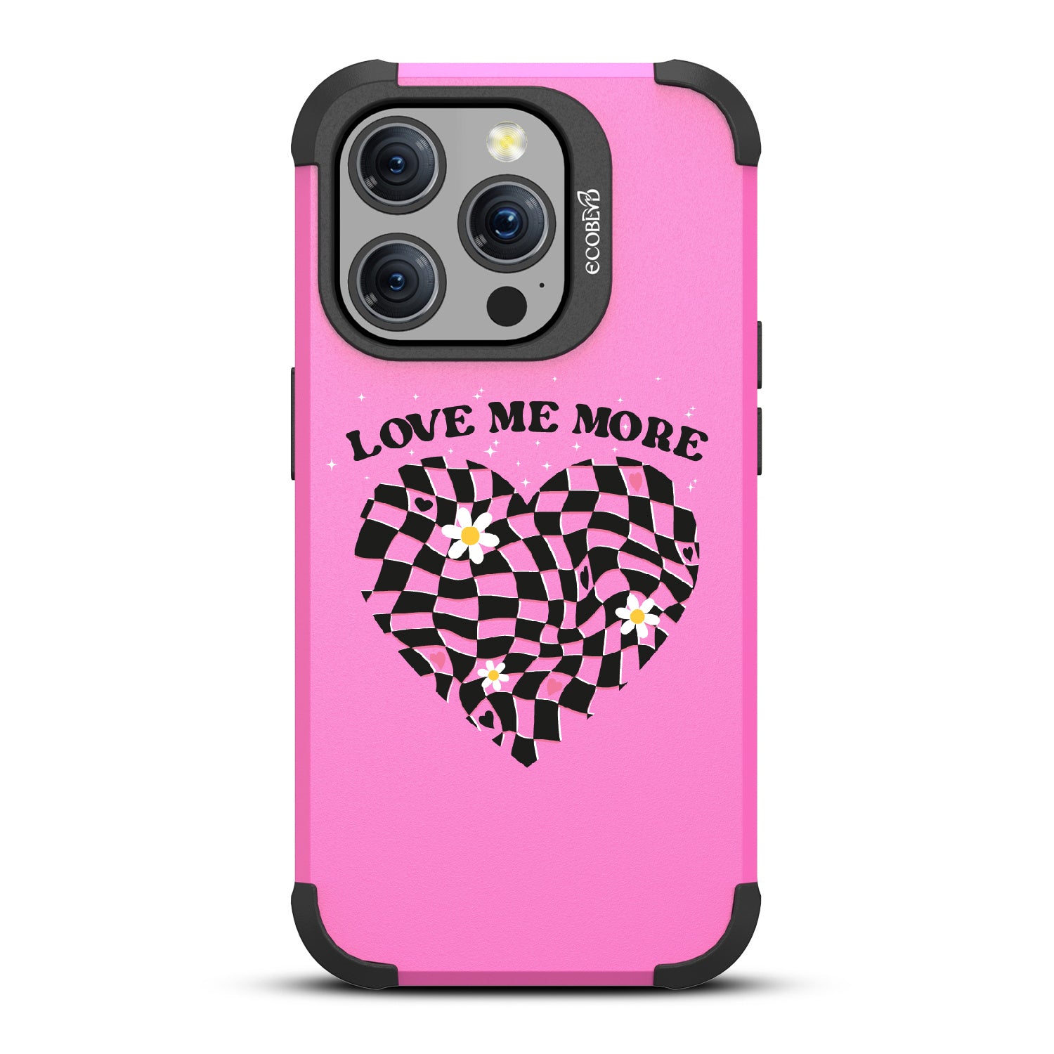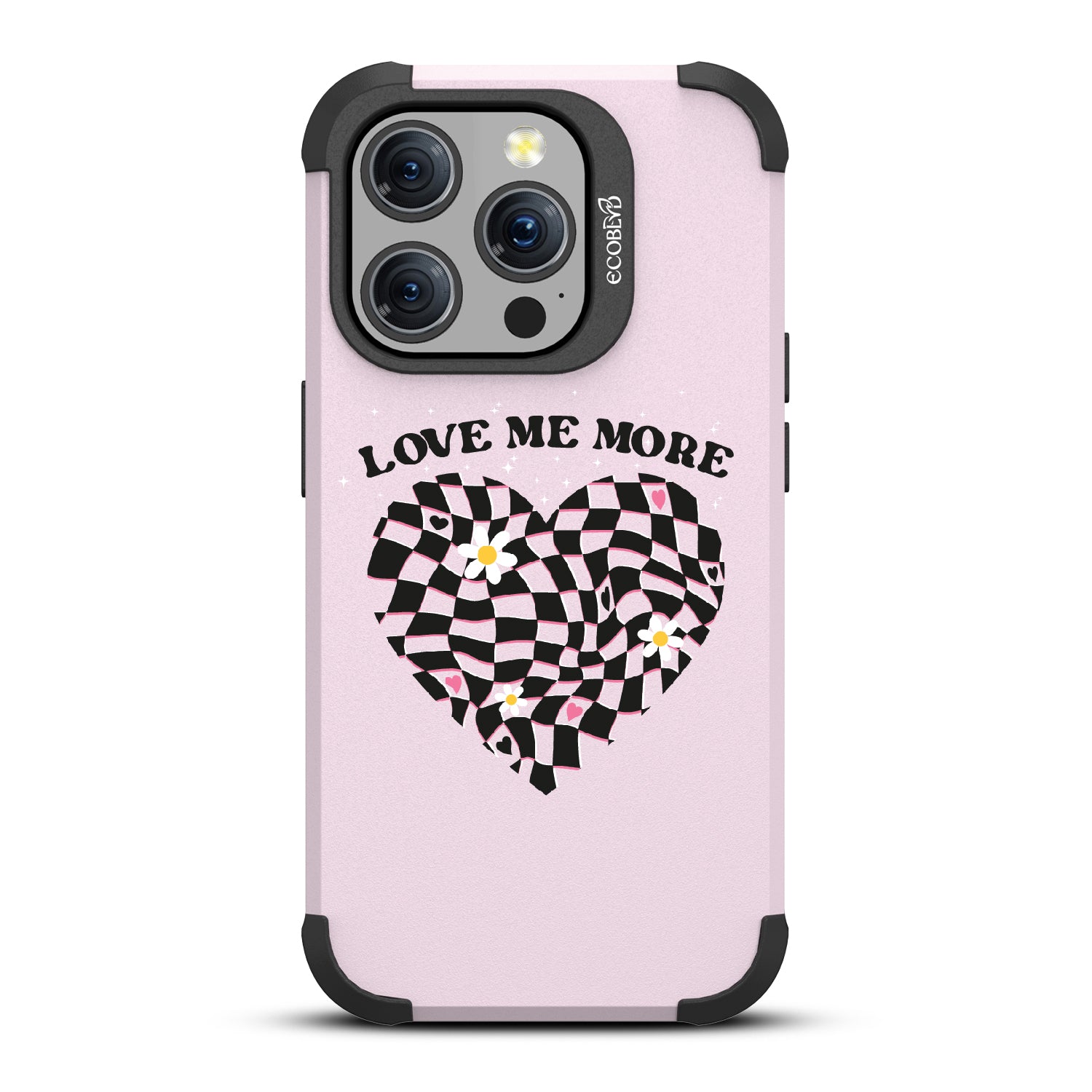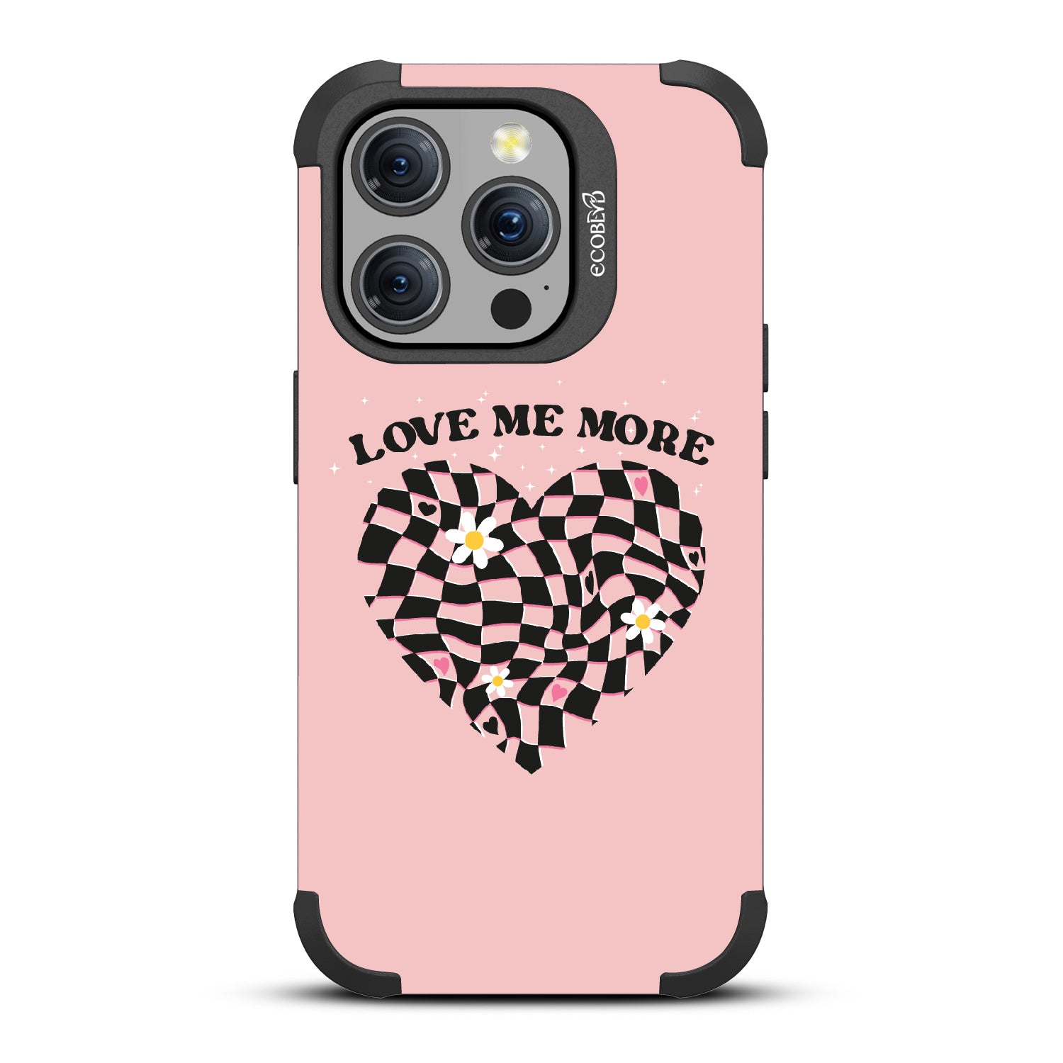 On our Mojave rugged and compostable iPhone 15 Pro MagSafe case, Love Me More intricately portrays the language of desire, with a checkered heart adorned by an intoxicating symphony of blossoms. The patterns speak volumes of yearnings, while the text passionately conveys the plea for more passion, leaving an indelible mark that echoes "Forever in Your Heart."