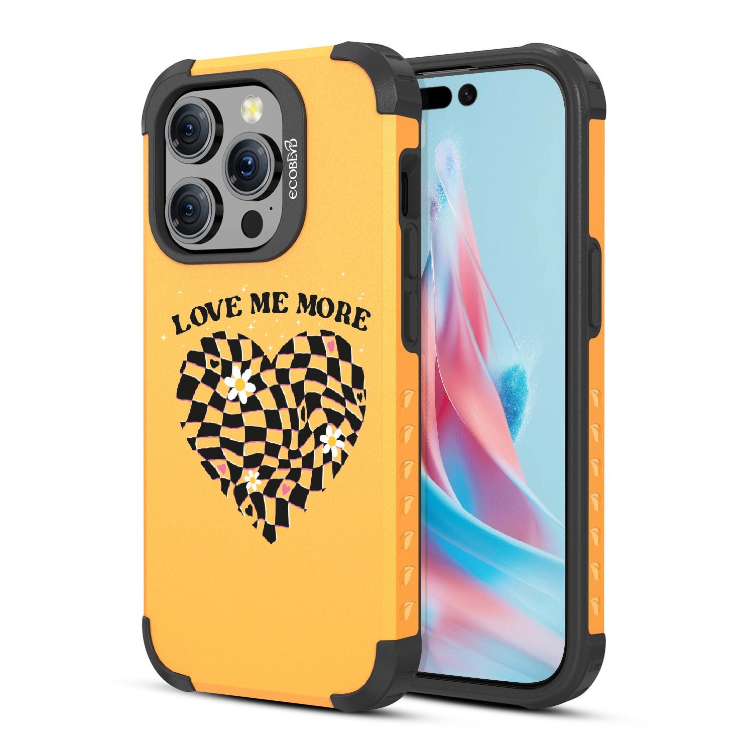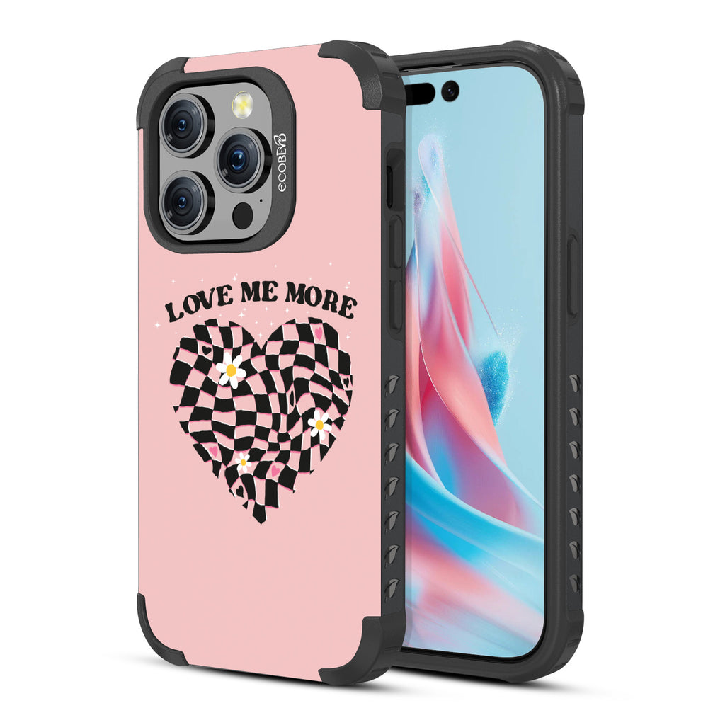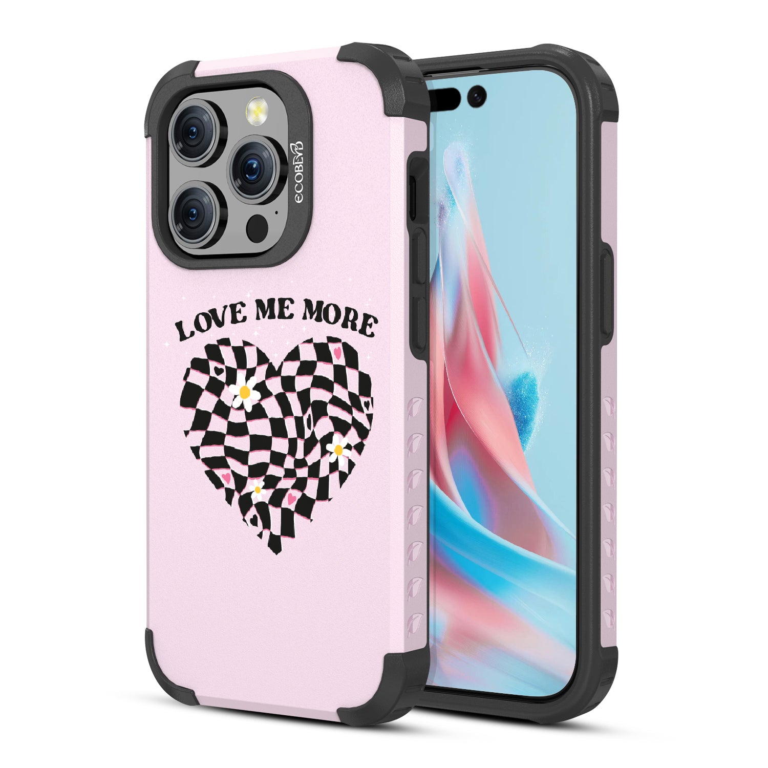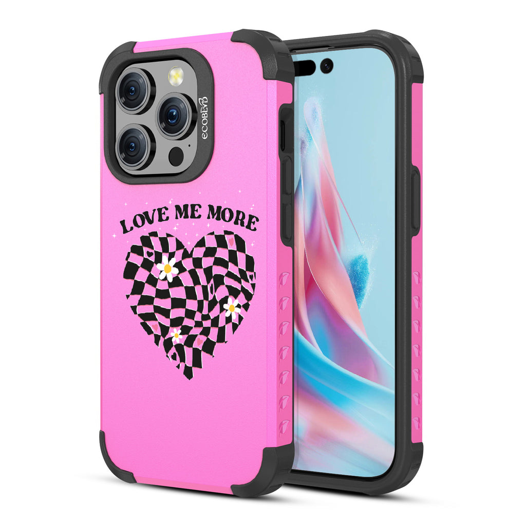 On our Mojave rugged and compostable iPhone 15 Pro MagSafe case, Love Me More intricately portrays the language of desire, with a checkered heart adorned by an intoxicating symphony of blossoms. The patterns speak volumes of yearnings, while the text passionately conveys the plea for more passion, leaving an indelible mark that echoes "Forever in Your Heart."