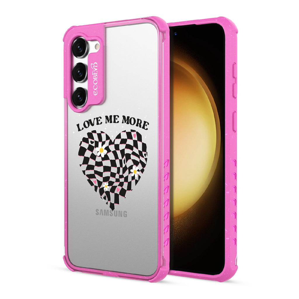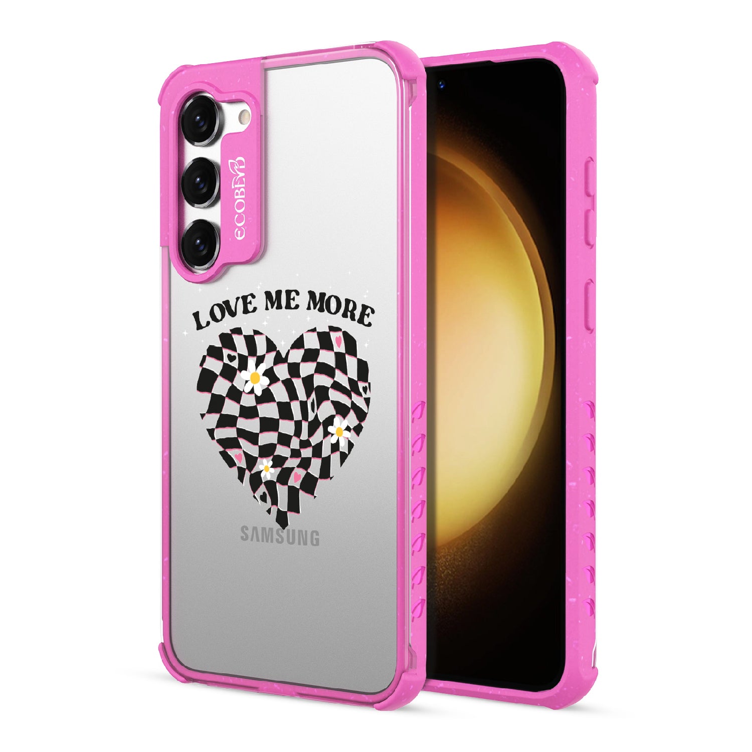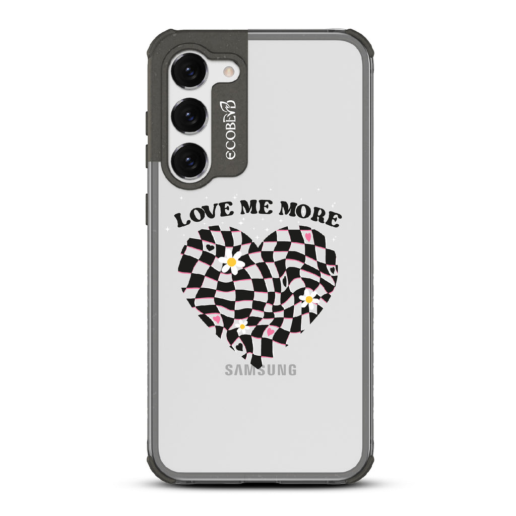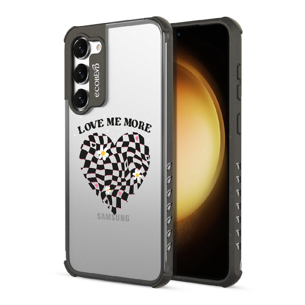 On our Laguna clear Galaxy S23 phone case, Love Me More intricately portrays the language of desire, with a checkered heart adorned by an intoxicating symphony of blossoms. The patterns speak volumes of yearnings, while the text passionately conveys the plea for more passion, leaving an indelible mark that echoes "Forever in Your Heart."