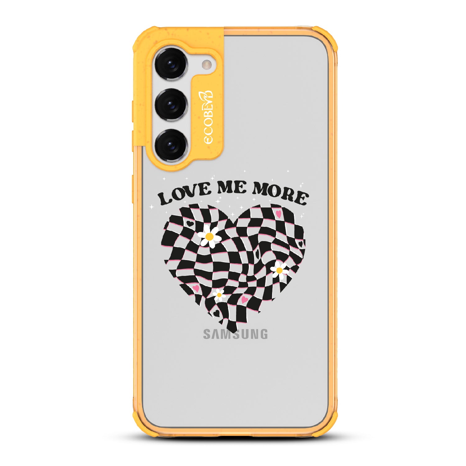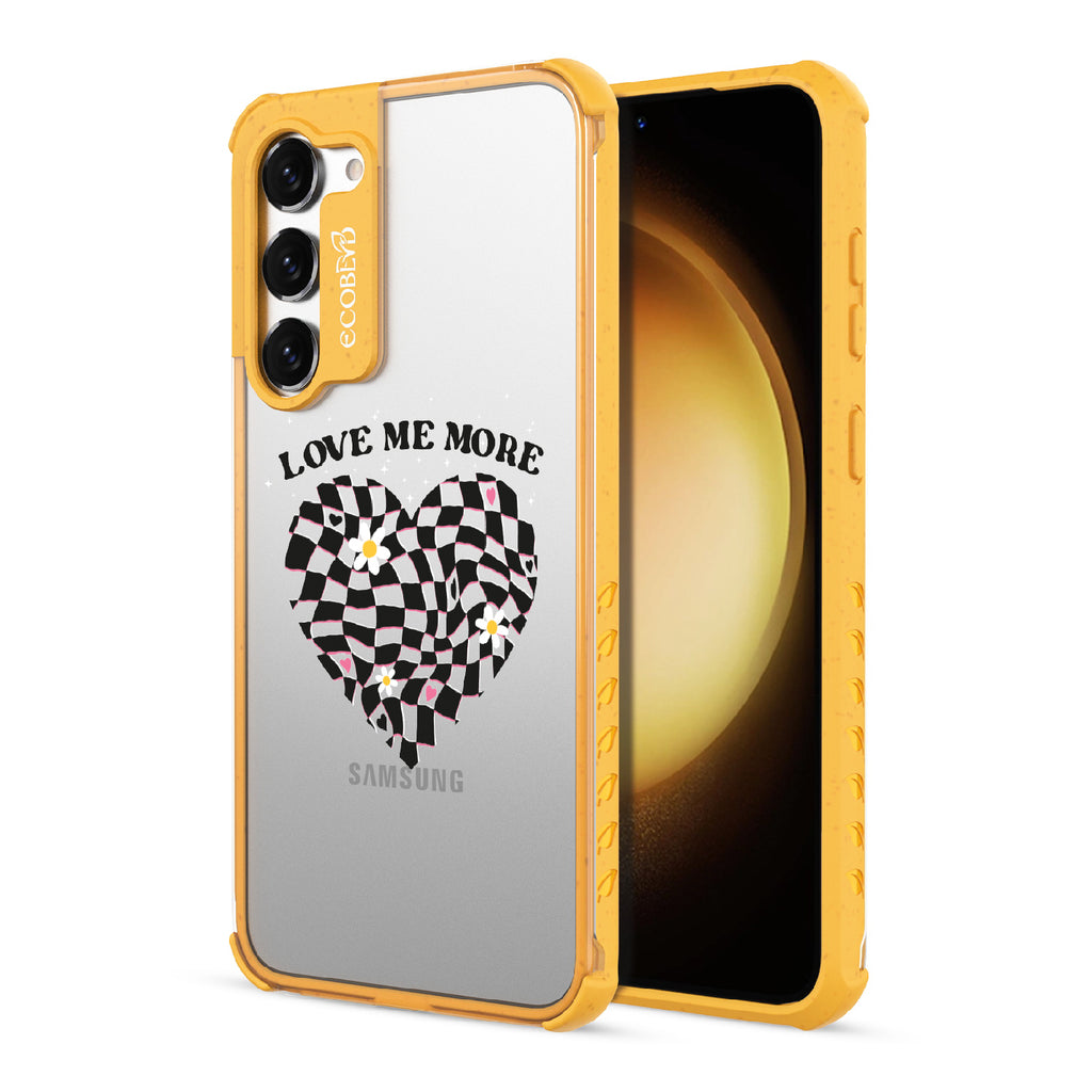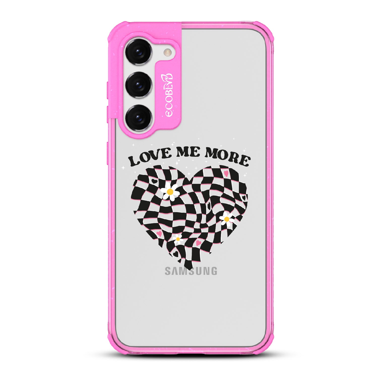 On our Laguna clear Galaxy S23 phone case, Love Me More intricately portrays the language of desire, with a checkered heart adorned by an intoxicating symphony of blossoms. The patterns speak volumes of yearnings, while the text passionately conveys the plea for more passion, leaving an indelible mark that echoes "Forever in Your Heart."
