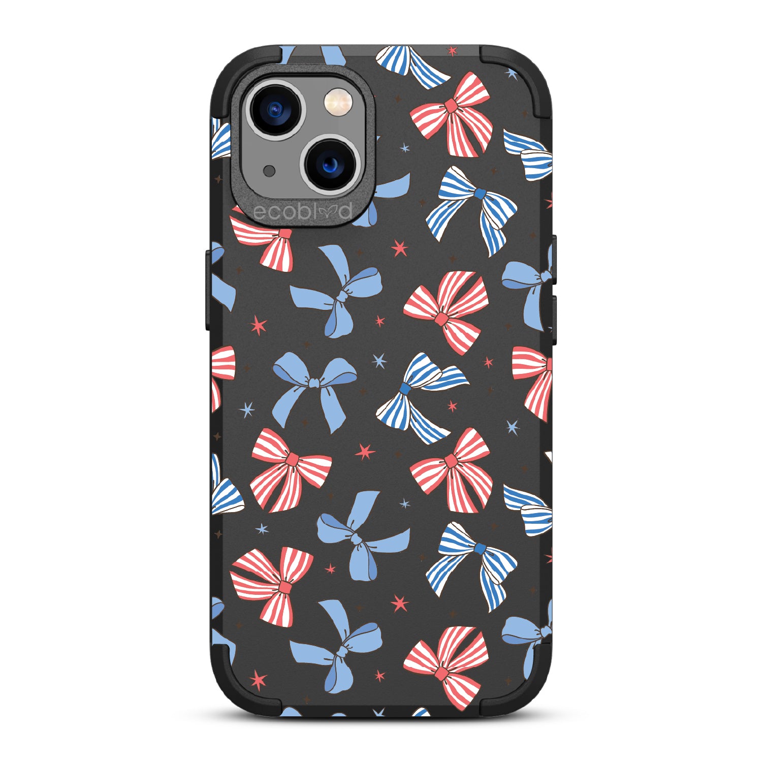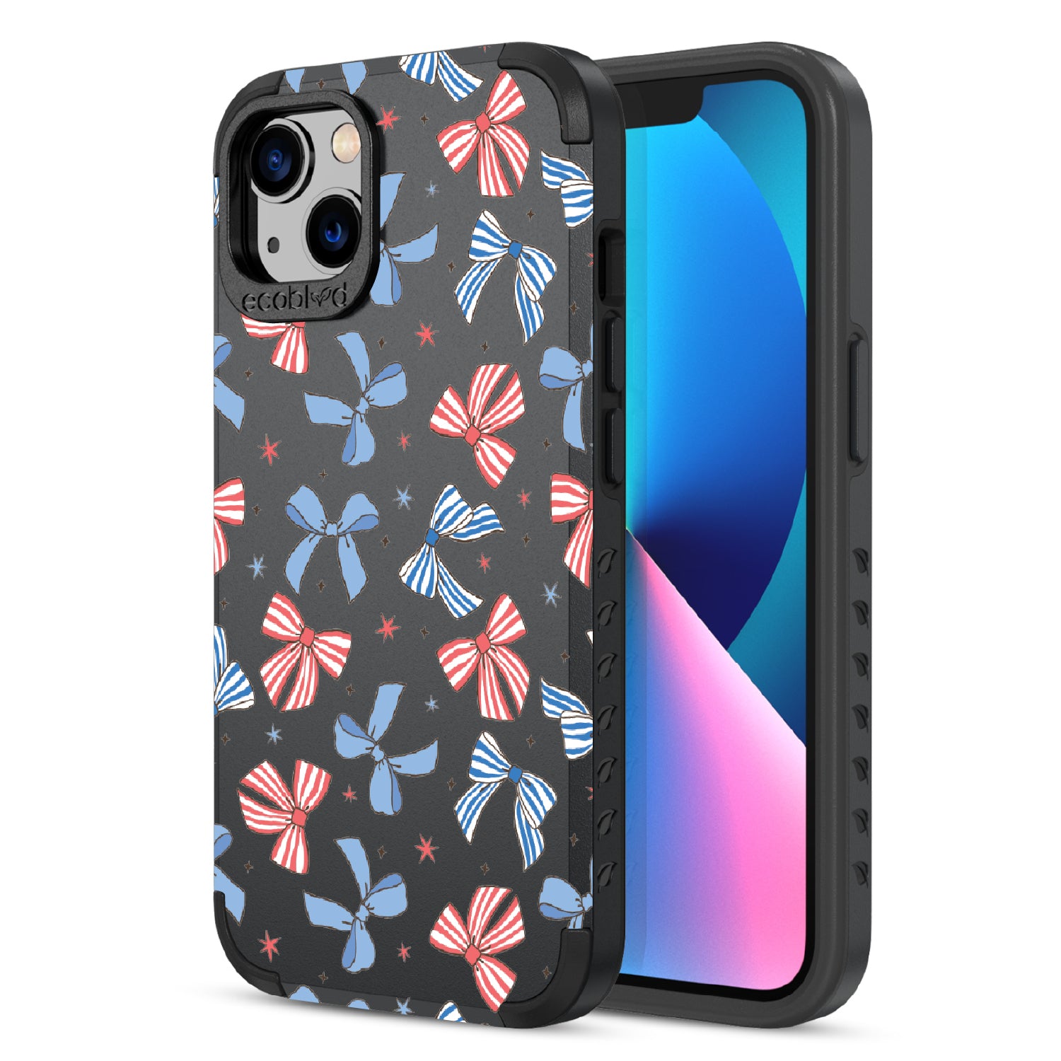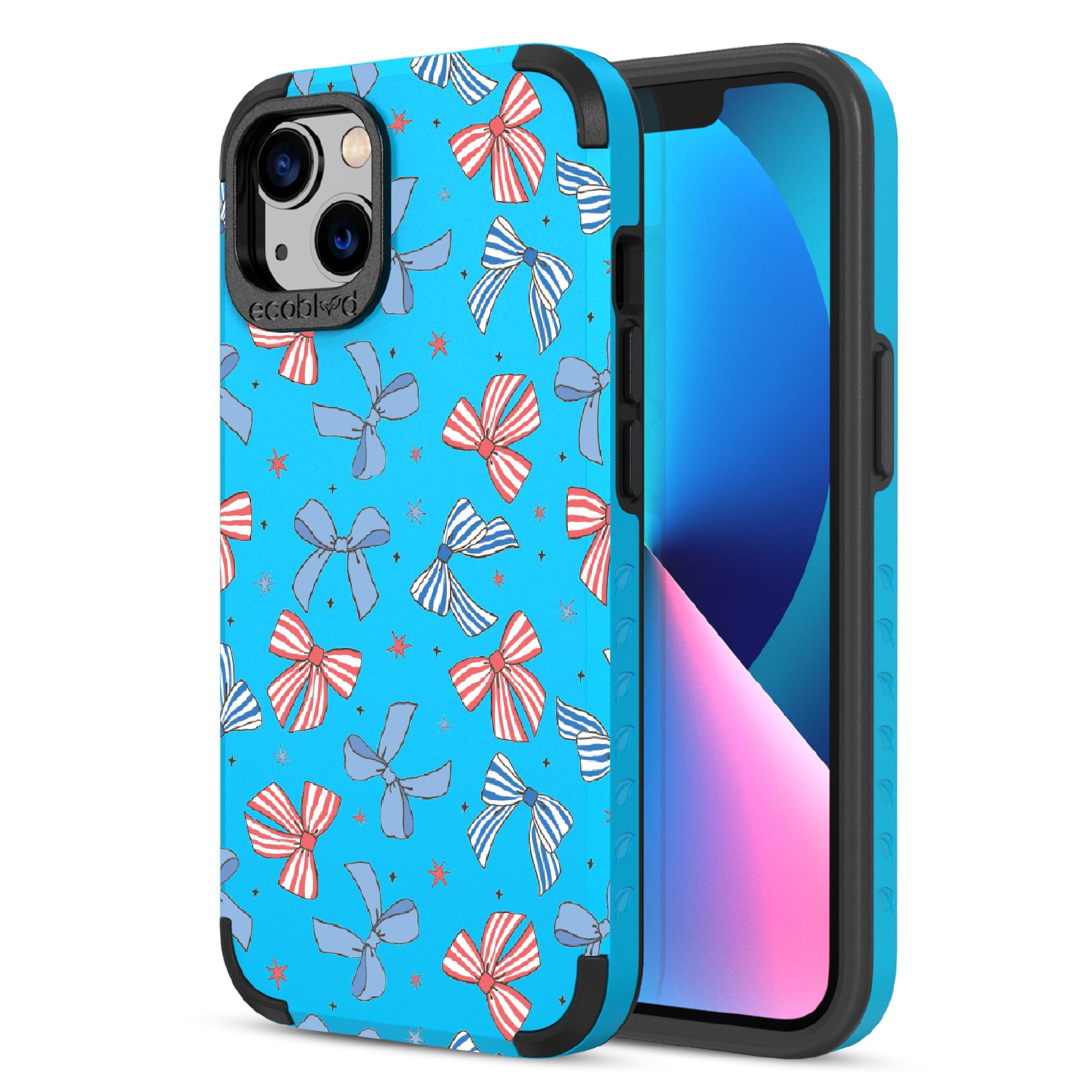 America the bow-tiful! The Miss Americana design on our Mojave rugged iPhone 13 phone case crowns your phone with patriotic flair. With red, white, and blue bows, this coquette phone case design turns your phone into the belle of the Americana ball.