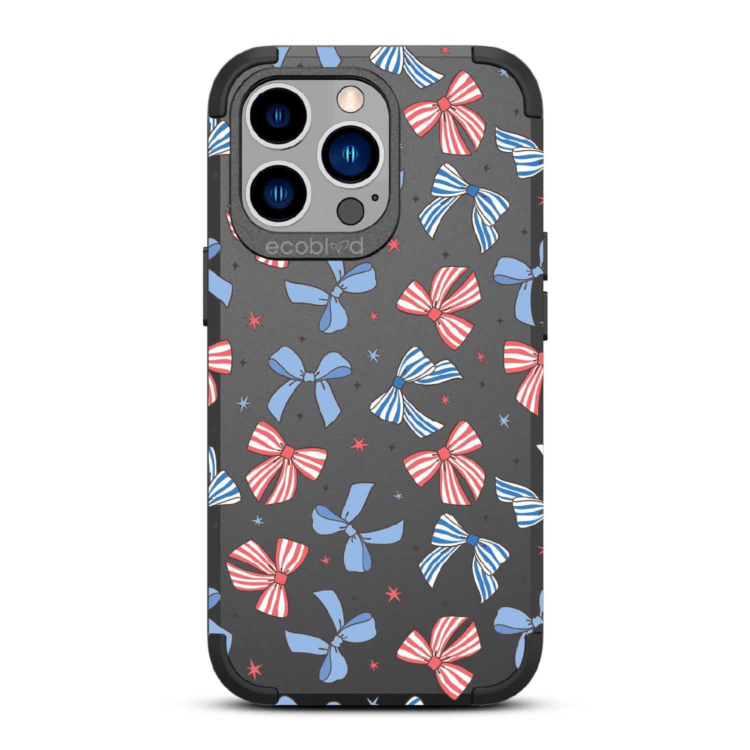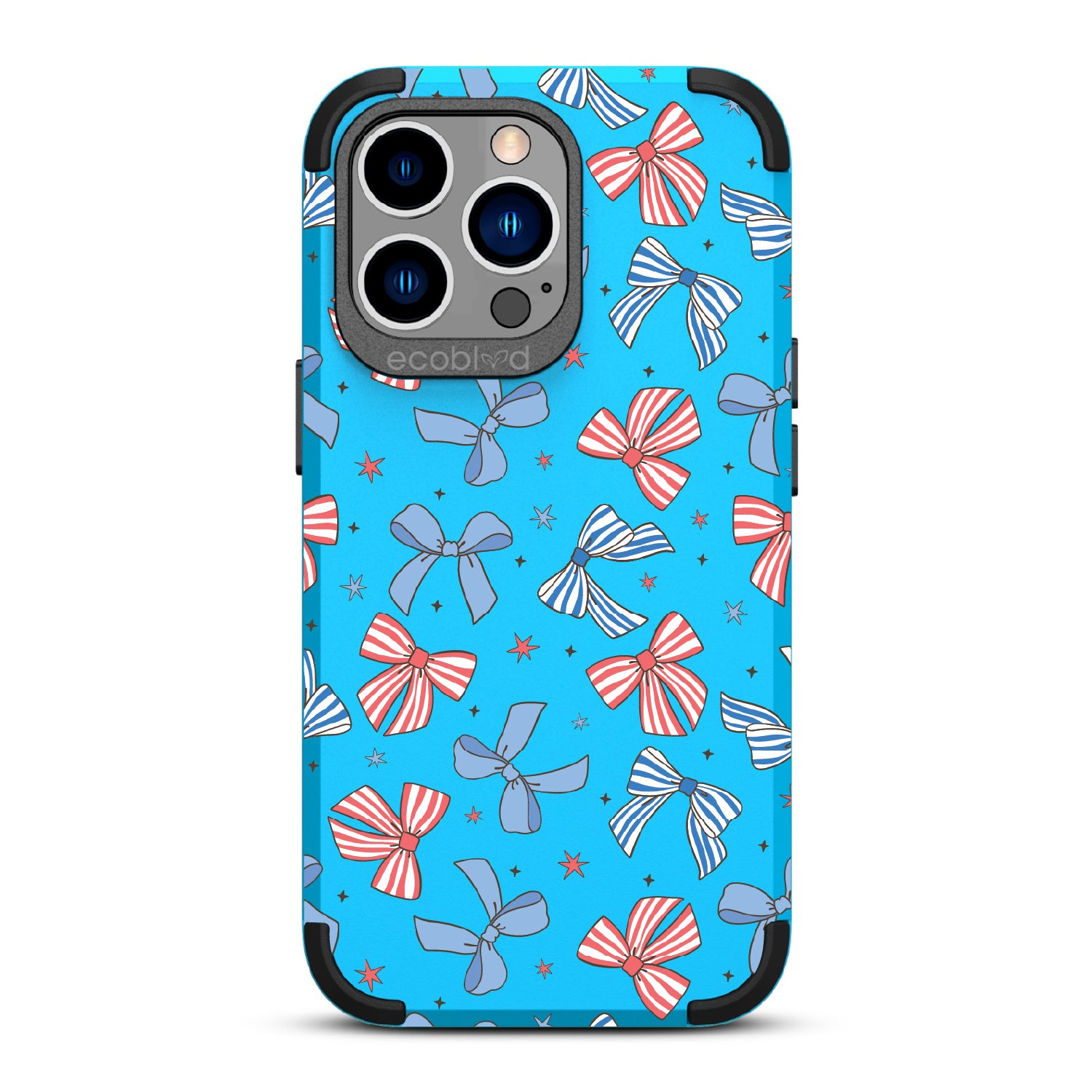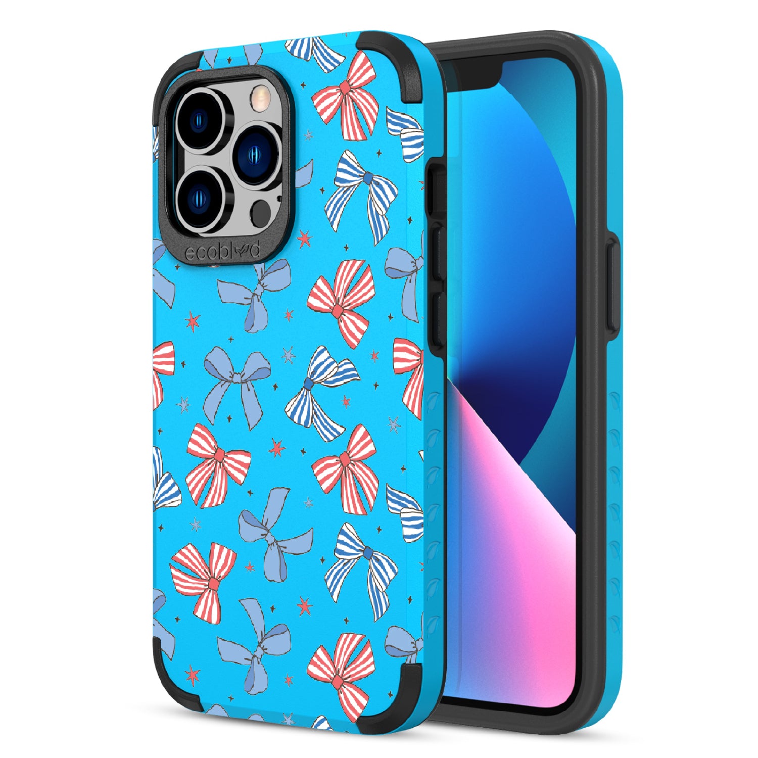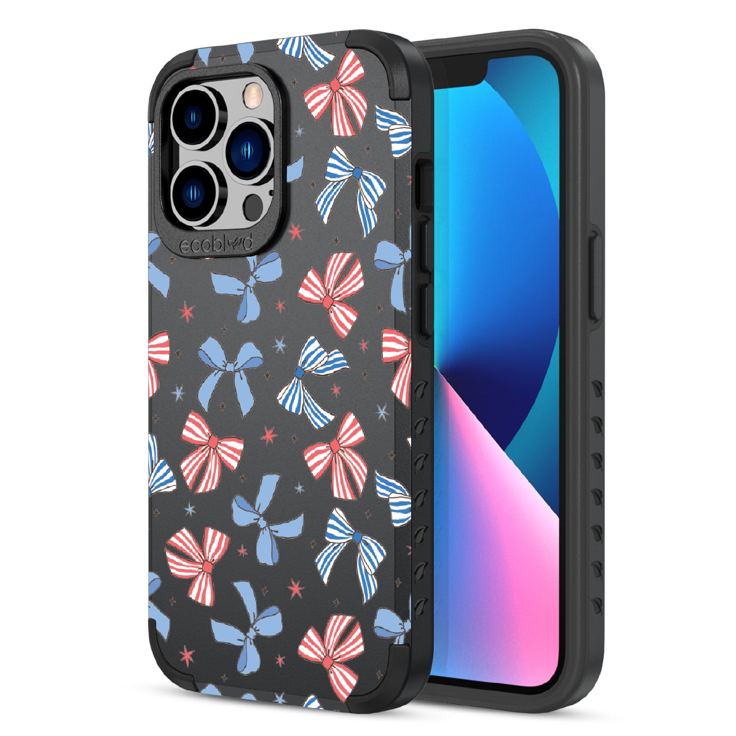 America the bow-tiful! The Miss Americana design on our Mojave rugged iPhone 12 Pro Max phone case & iPhone 13 Pro Max phone case crowns your phone with patriotic flair. With red, white, and blue bows, this coquette phone case design turns your phone into the belle of the Americana ball.