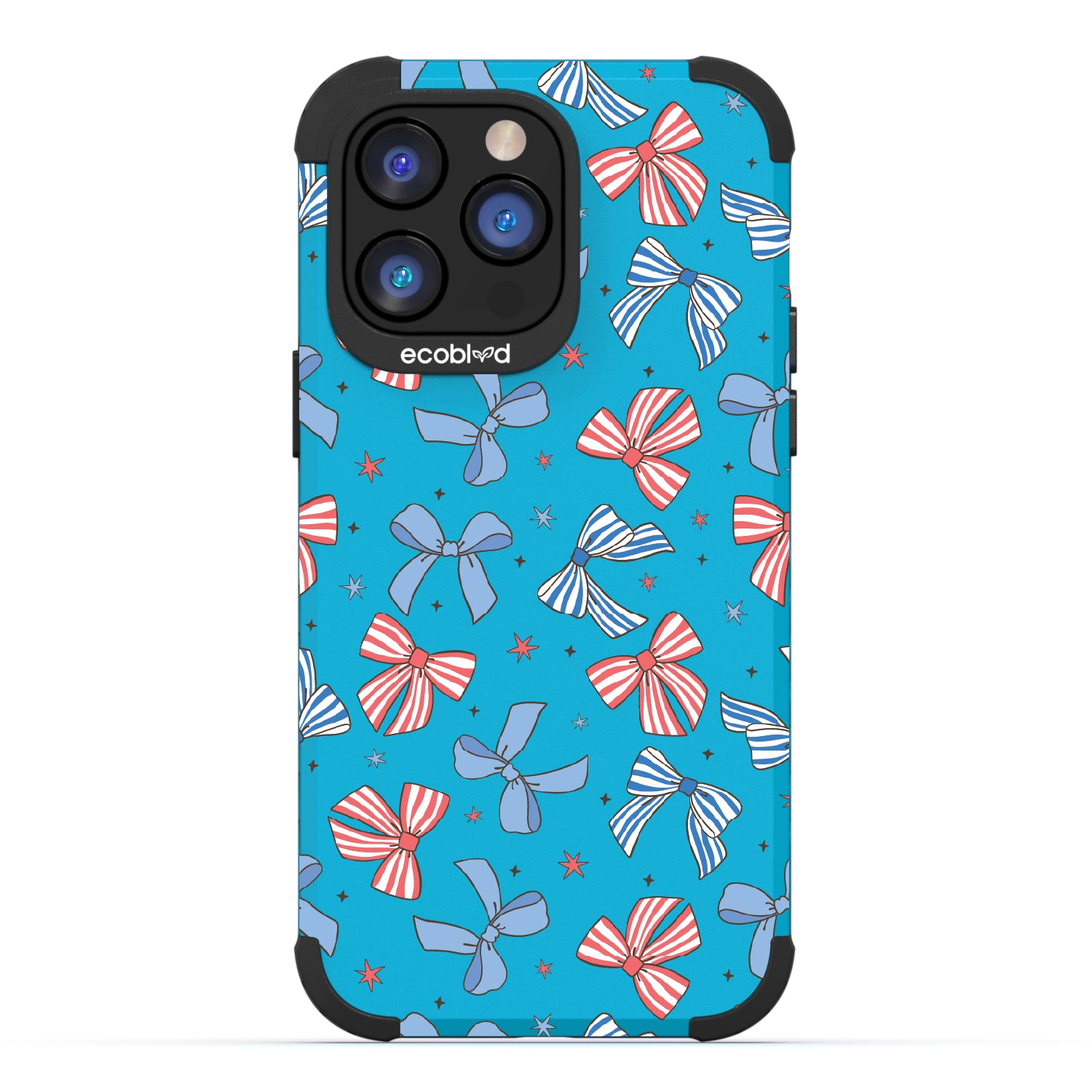 America the bow-tiful! The Miss Americana design on our Mojave rugged iPhone 14 Pro phone case crowns your phone with patriotic flair. With red, white, and blue bows, this coquette phone case design turns your phone into the belle of the Americana ball.