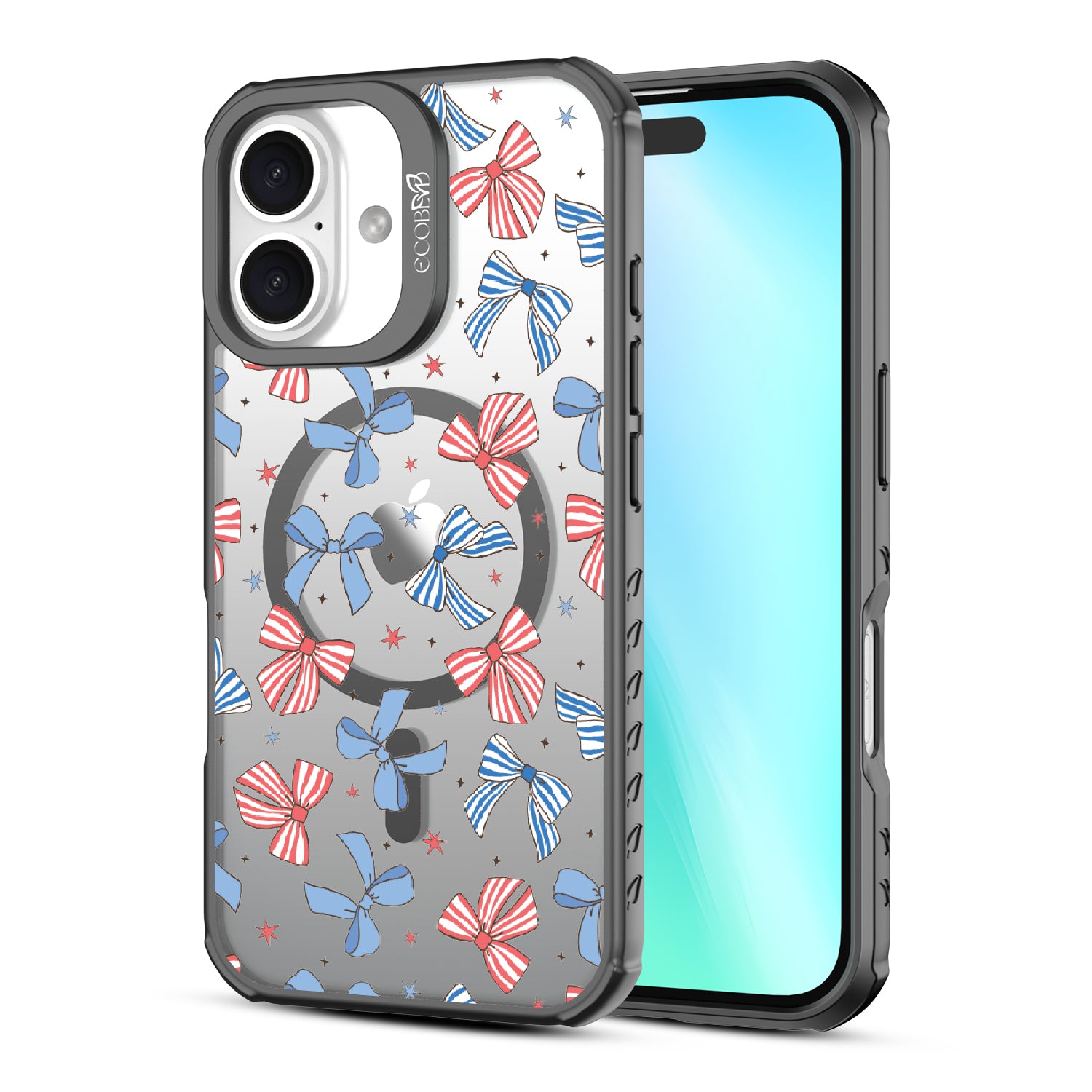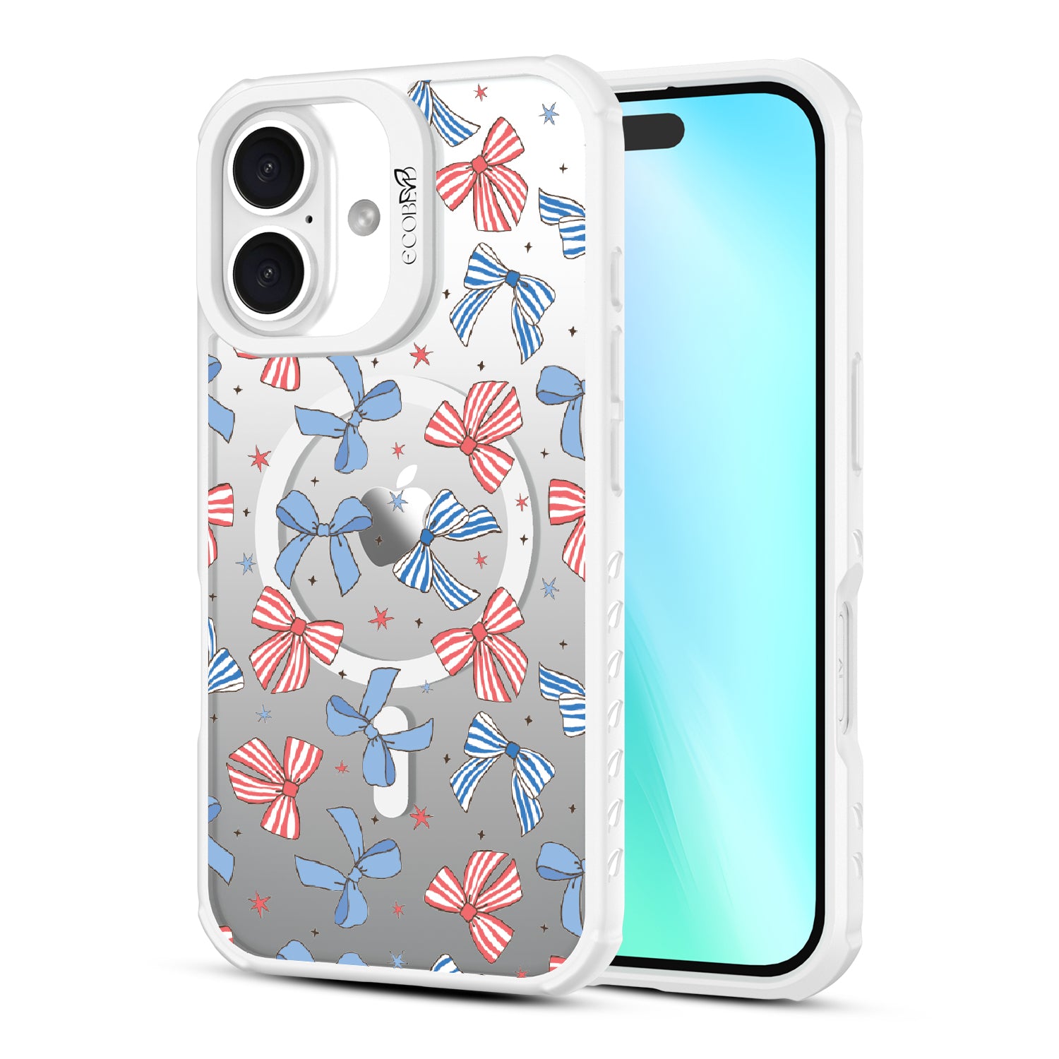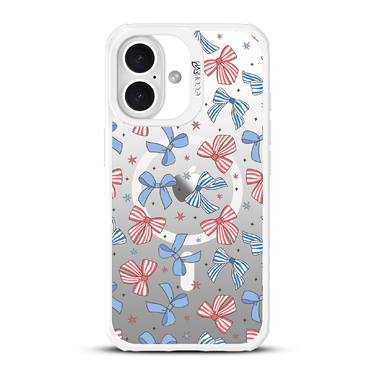 America the bow-tiful! The Miss Americana design on our Revive clear iPhone 16 phone case crowns your phone with patriotic flair. With red, white, and blue bows, this coquette phone case design turns your phone into the belle of the Americana ball.