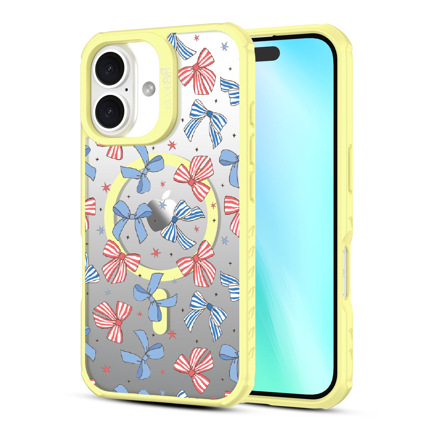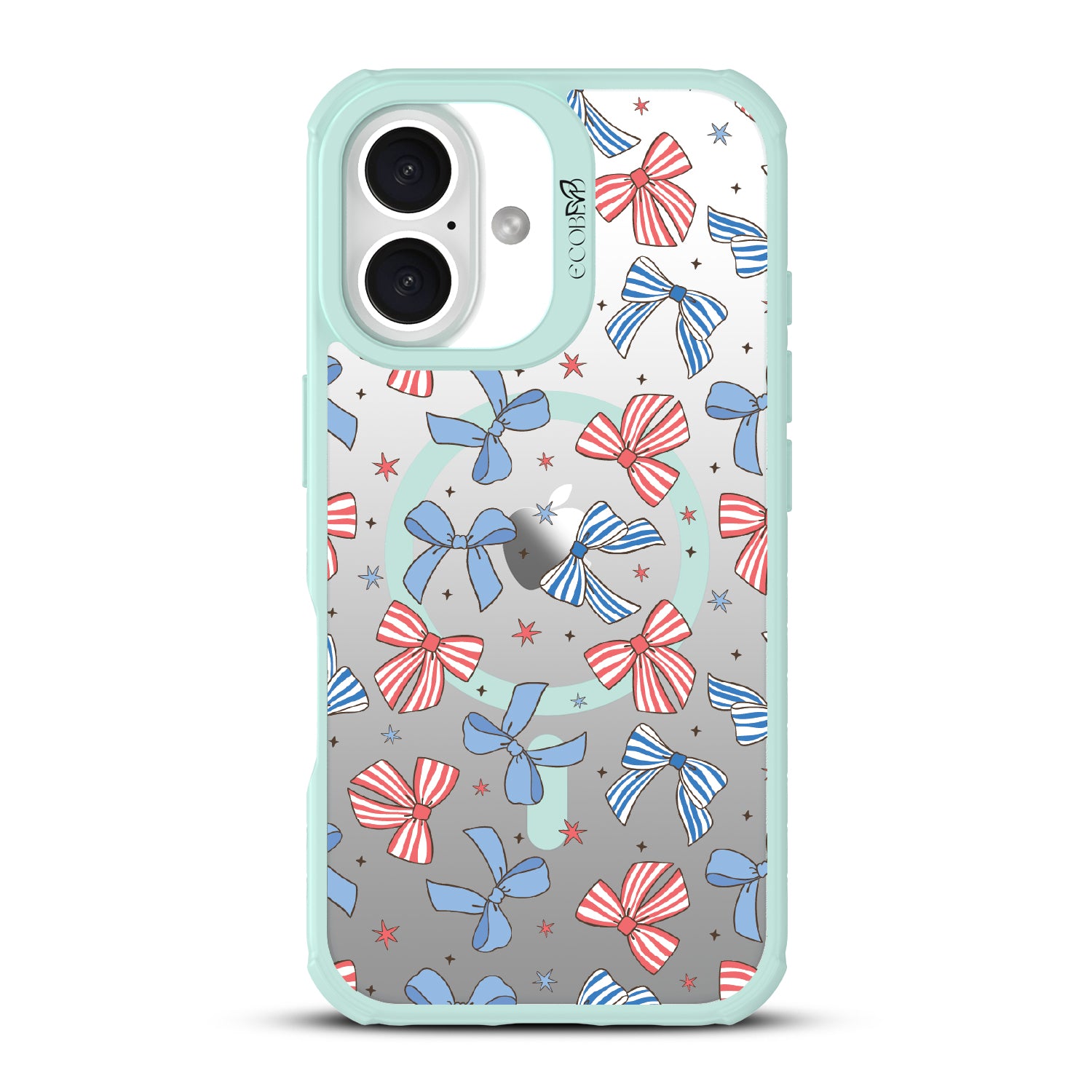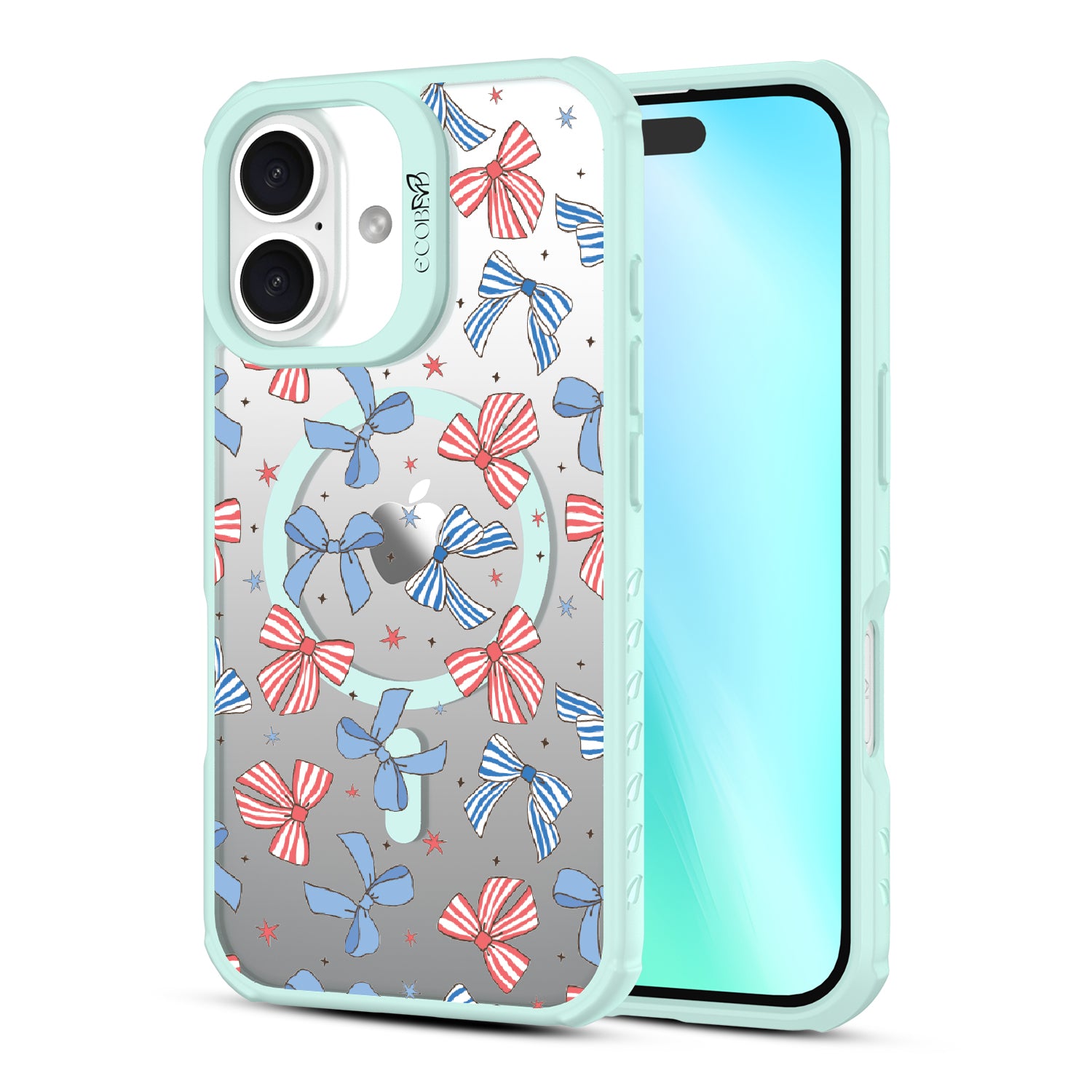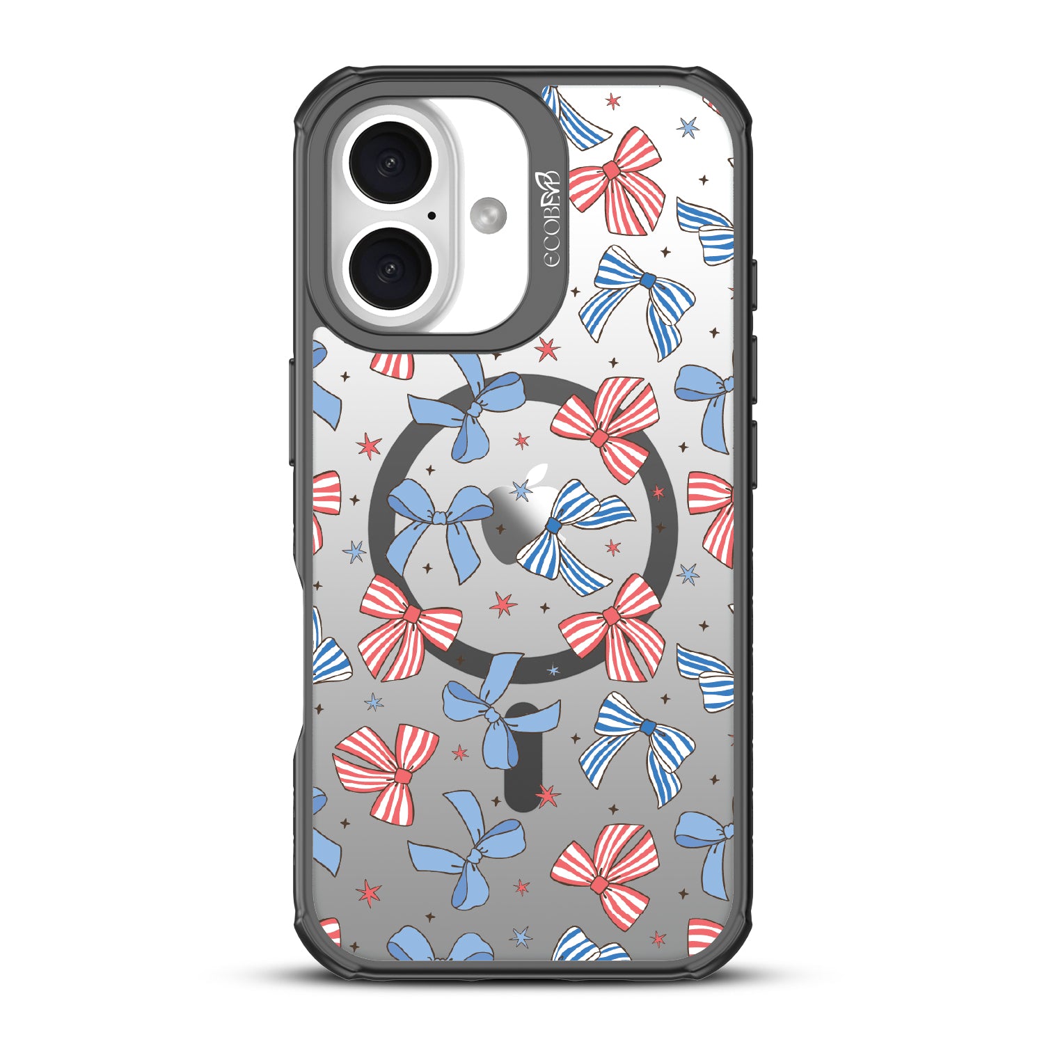 America the bow-tiful! The Miss Americana design on our Revive clear iPhone 16 phone case crowns your phone with patriotic flair. With red, white, and blue bows, this coquette phone case design turns your phone into the belle of the Americana ball.