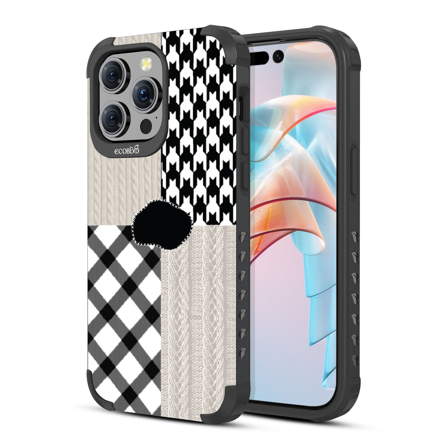 Mix and match your phone's style with the Pattern Play design on our Mojave rugged and compostable iPhone 15 Pro Max case. It's where cozy cable knit meets classic houndstooth, plaid dances with more cable knit, and the black uneven patch is the unexpected twist that makes your phone's look uniquely fabulous.