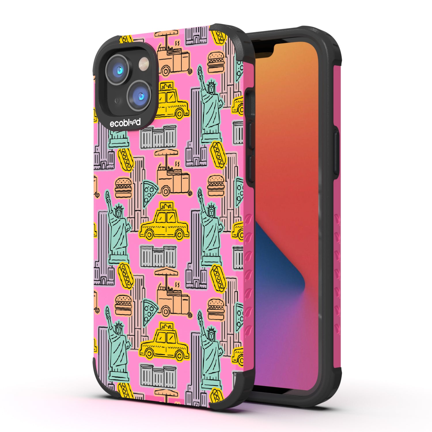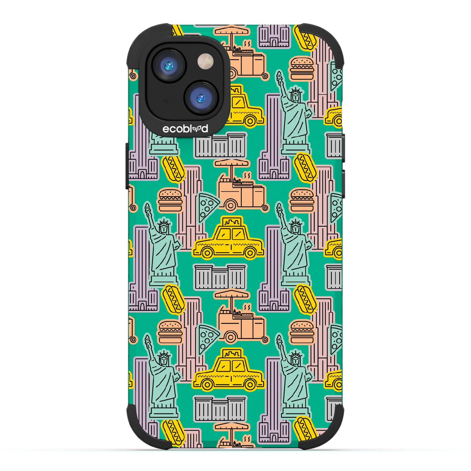 Capture the buzz of the city that never sleeps with the New York Minute design on our Mojave rugged iPhone 14 Plus phone case. It's a slice of the Big Apple, with iconic yellow cabs, steaming hotdogs, and Lady Liberty herself, all wrapped up in that unmistakable NYC rhythm.